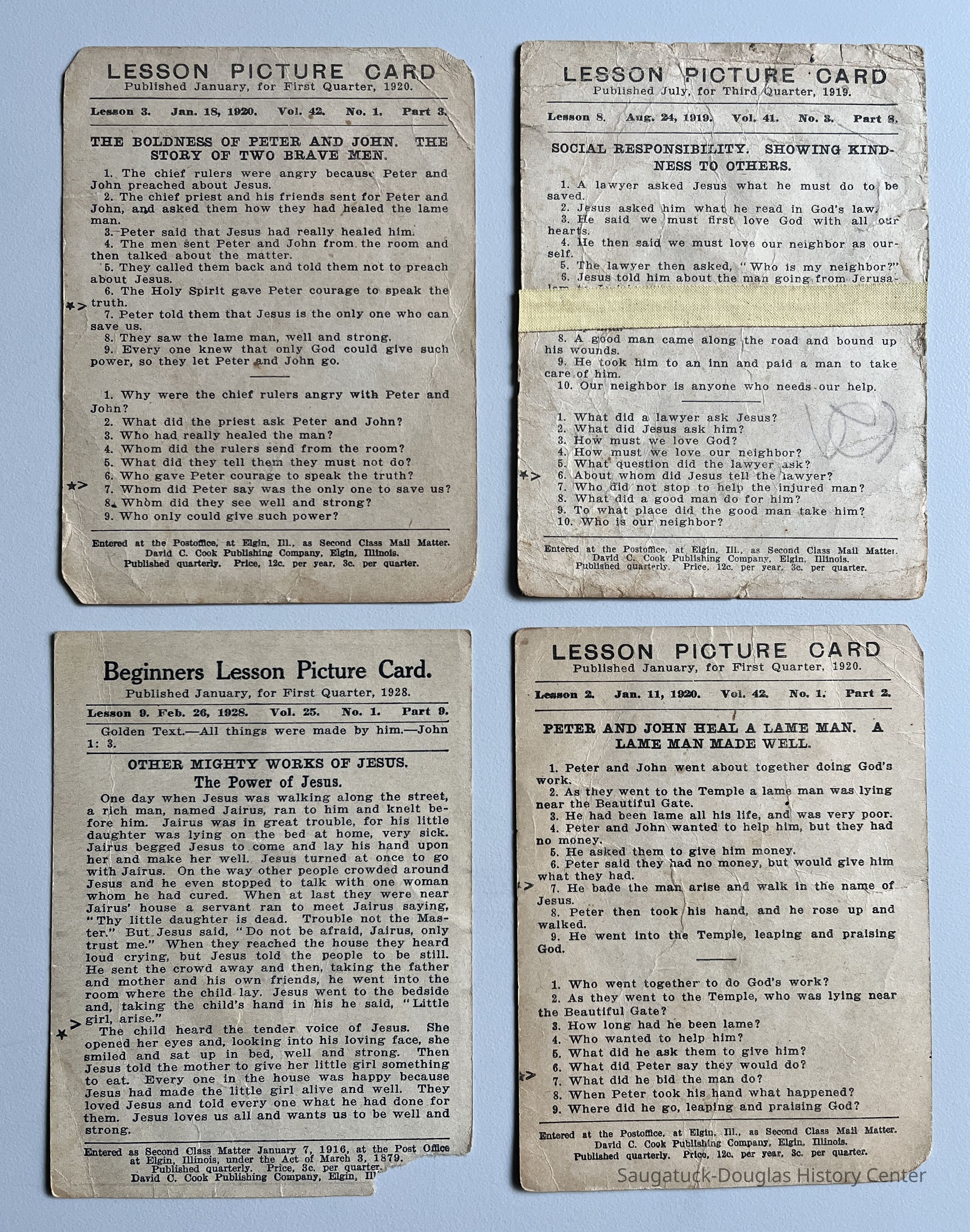Four cards with illustrations of Biblical scenes on the front and lessons on the back. These Lesson Picture Cards were paid for by subscription (12 cents per year) and mailed from the David C. Cook Publishing Company in Elgin, Illinois. The cards are have a 1915 copyright and patent notice.