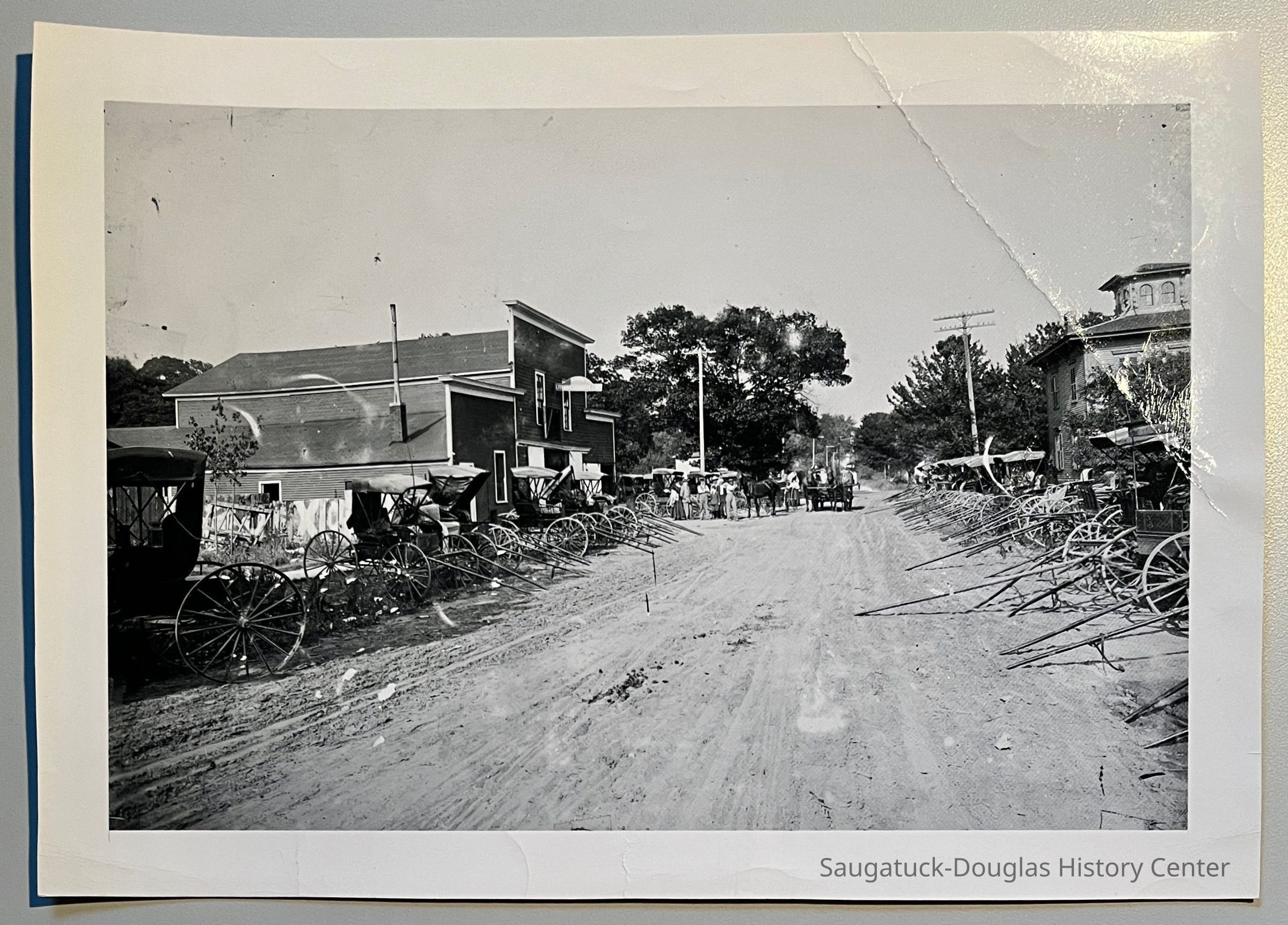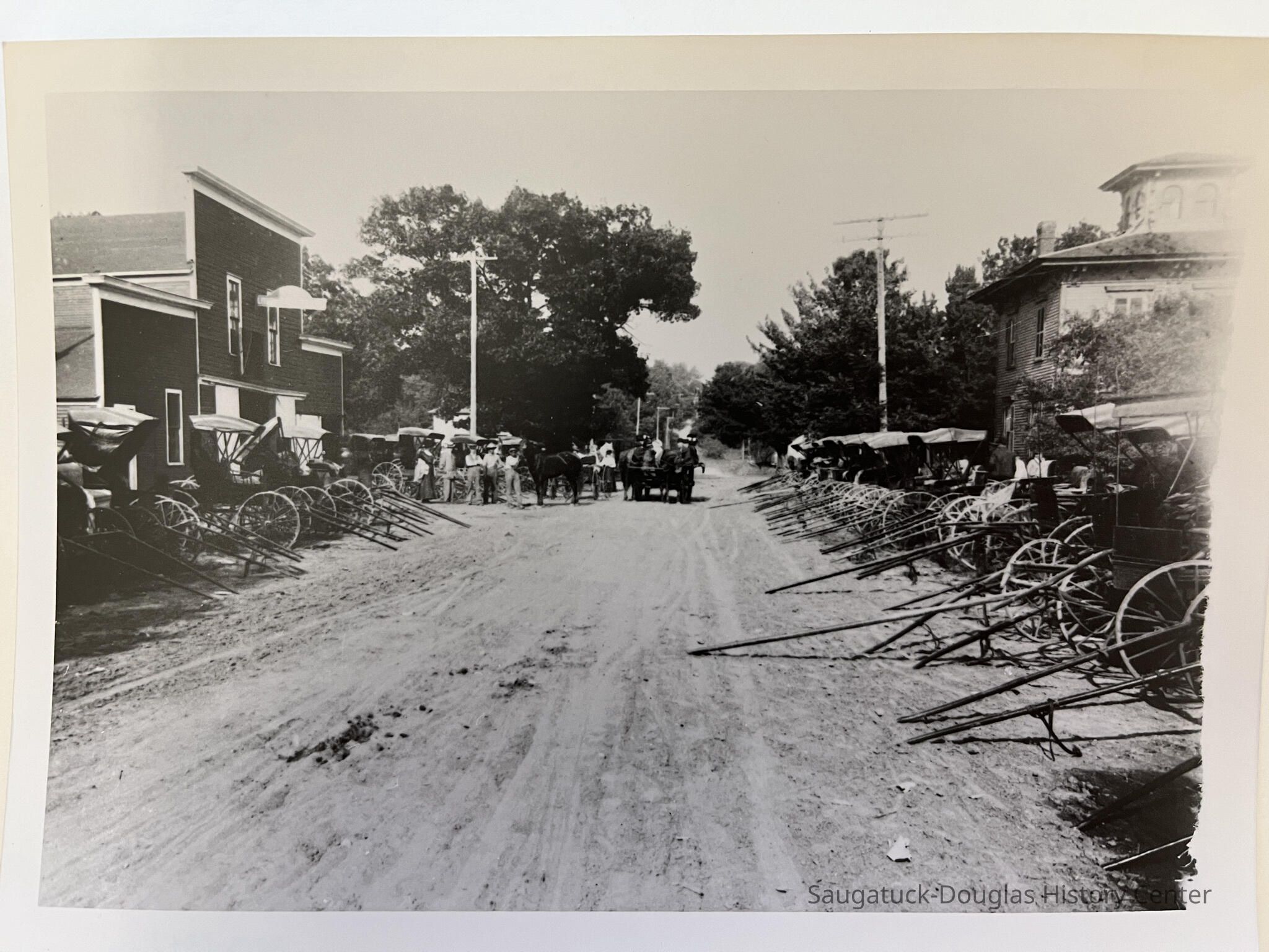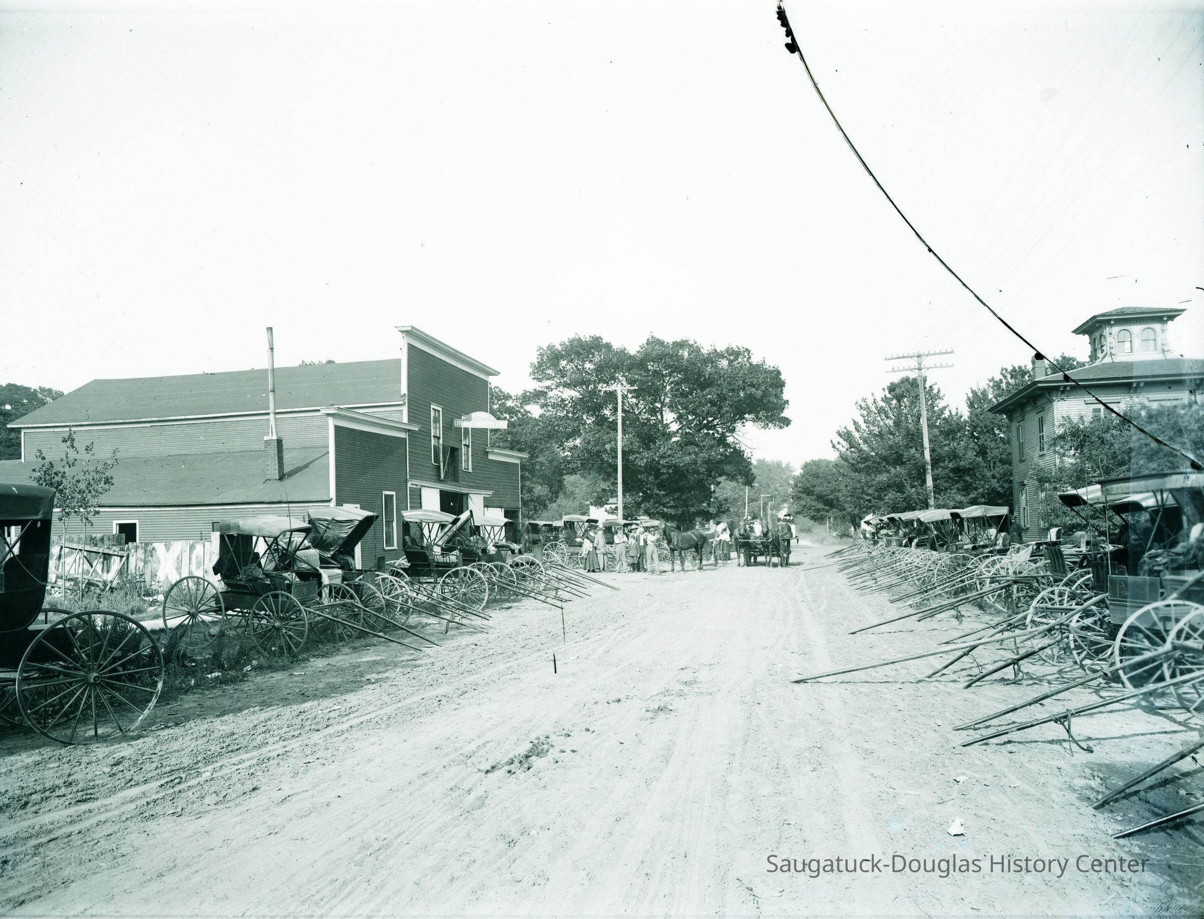 Photograph of Mason Street, looking east from Butler, showing the Brittain house on the right and the James F. Davis' Livery and Transfer Line stable on the left. Horse-drawn rigs, wagons and carriages line the unpaved street.Photograph Details