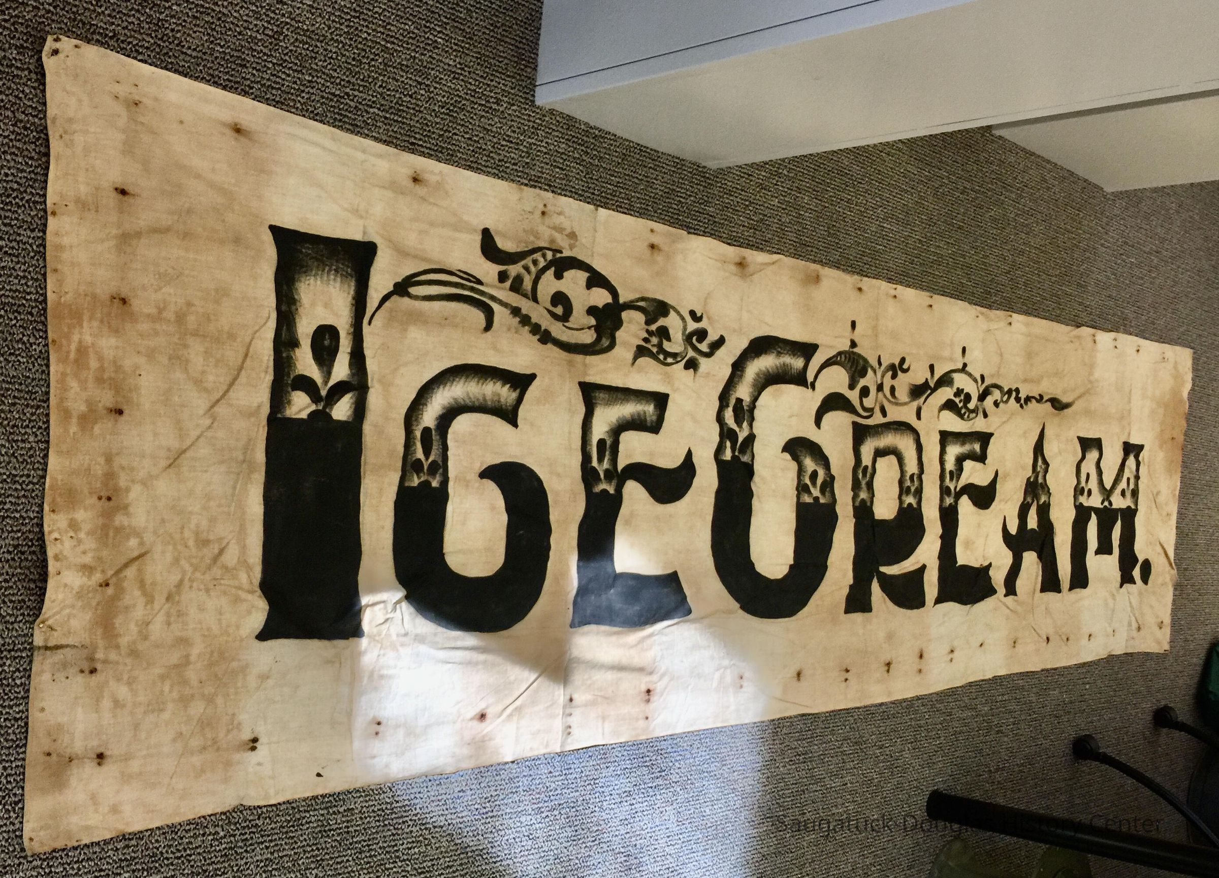 A large 9ft banner made of linen with the words, "Ice Cream" painted in large black letters.Cataloged By