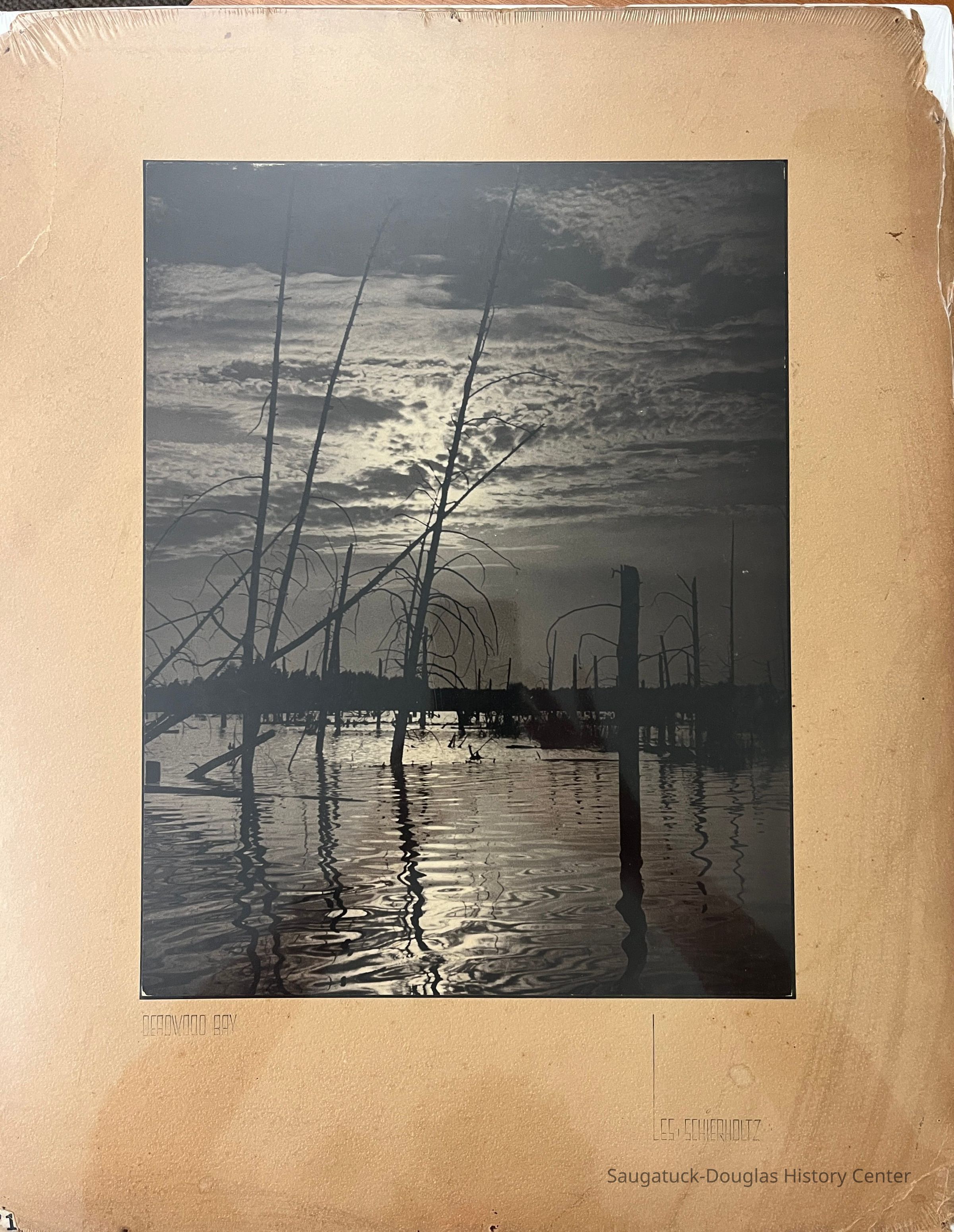 10.5" x 13.5" black and white photograph of a marsh at sunset, mounted on mat board (beige or discolored with age) with the title "Deadwood Bay," in the left bottom corner and the name of the photographer, Les Schierholtz. Item is shrink wrapped to a foam-cor backer.Photograph Details