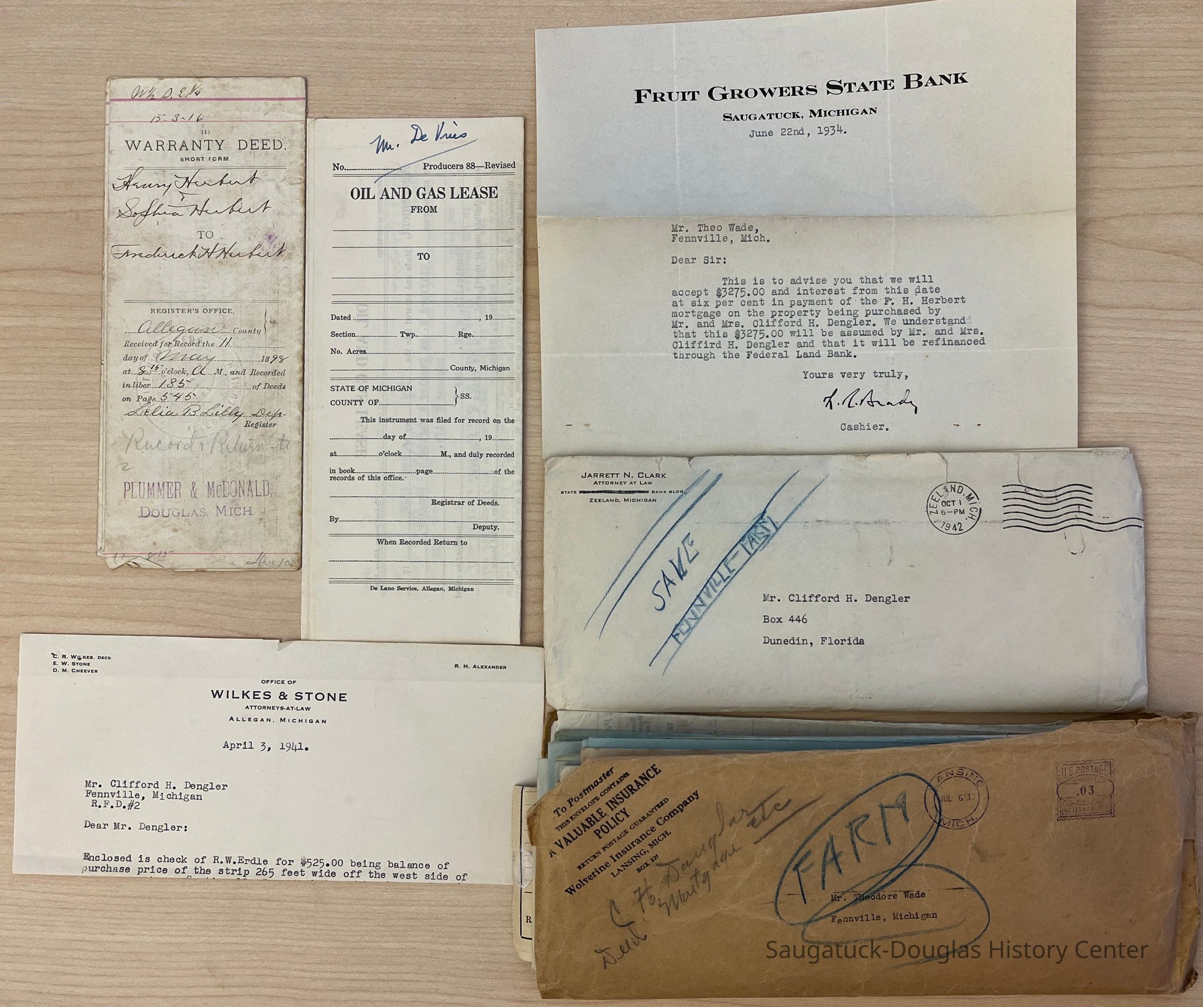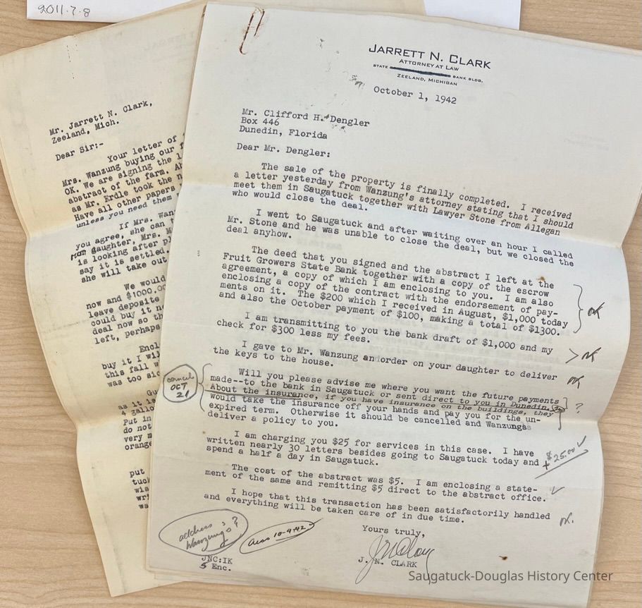 Letters between Mr. Clifford Dengler and Jarrett Clark regarding purchasing of farms in the Douglas and Fennville area. Also other correspondence and documents that includes deeds, leases, insurance policies and legal papers.Collection