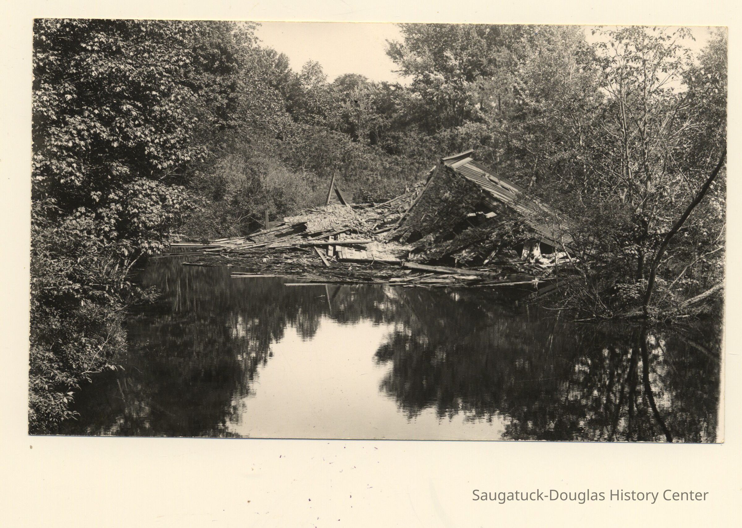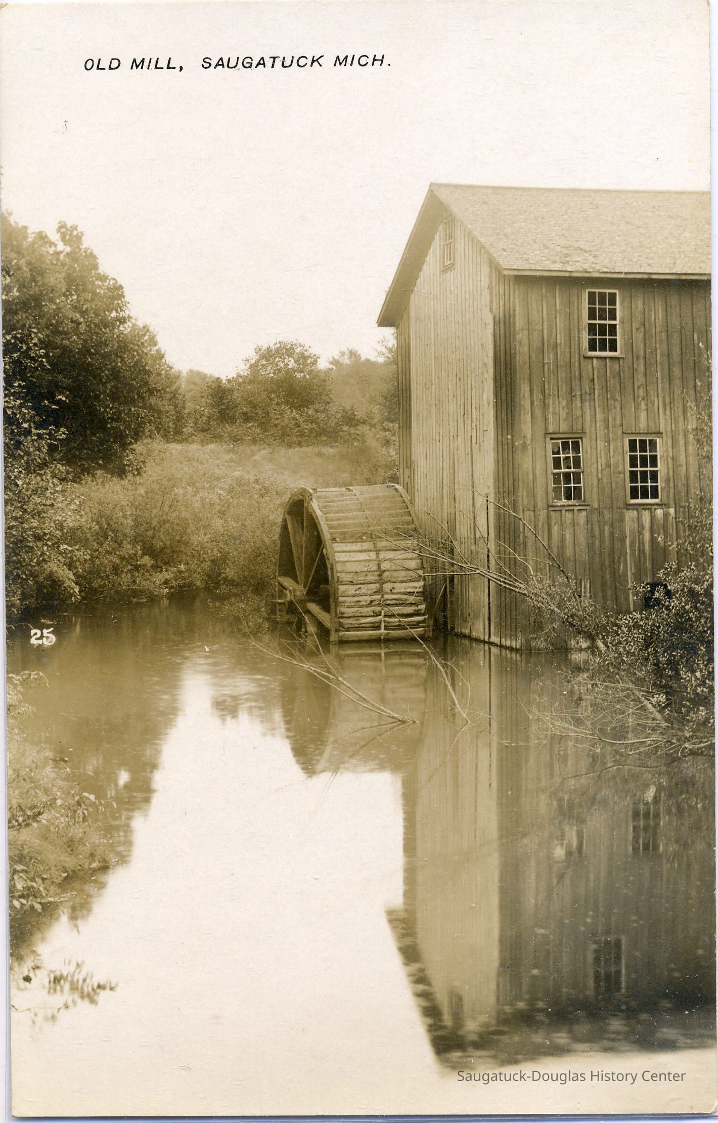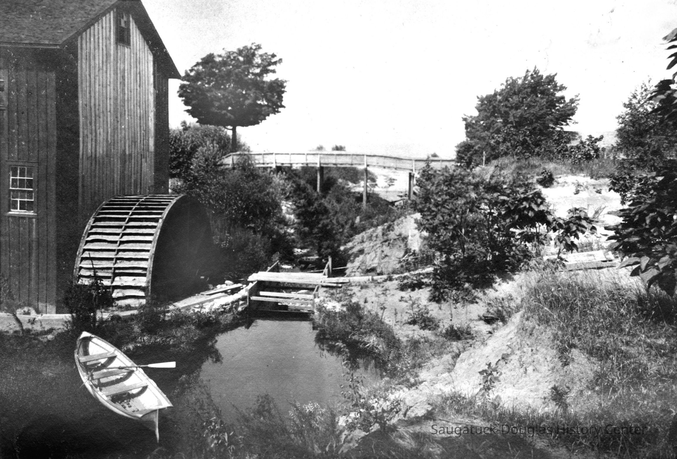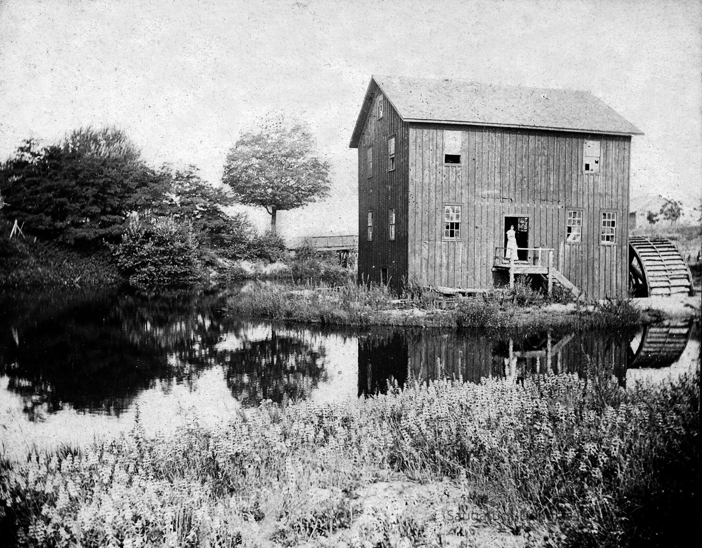 Various black-and-white photos of the mill and water wheel that once operated at Pier Cove as it went from pleasant play spot to picturesque ruin.Photograph Details