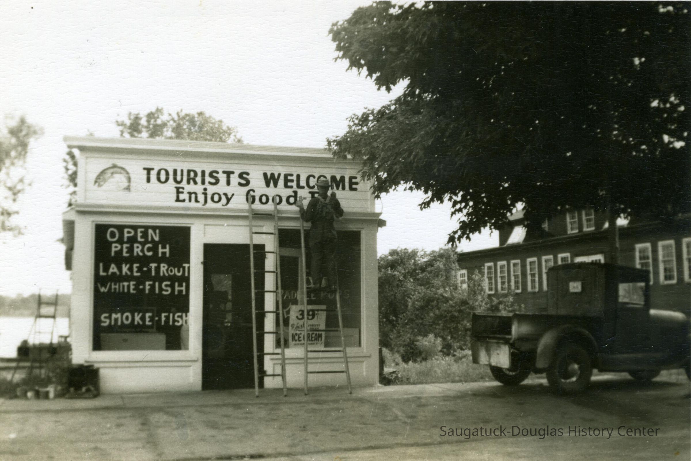 Sign painter working on front facade of Diepenhorst fish market. Man on a ladder painting "Tourists Welcome Enjoy Good Fish" on upper part of store front. Fruit Exchange building, truck, and Lake Kalamazoo are visible in background. Hand lettering on the window reads, "Open. Perch. Lake Trout. White Fish. Smoke Fish." Ice cream sign in window. Site is described as "across from the Gourmet Store." Site is where Coghlin Park is in 2021, between Culver St. and Lake Kalamazoo. Another view of the same building is "Diepenhorst market 2014.33" in the SDHC archive.Photograph Details