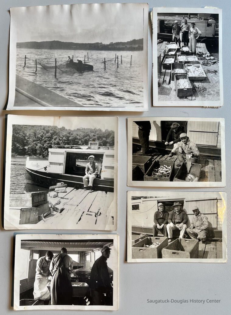 5. and 6. John Diepenhorst and two other men sitting by a gil net tug with boxes of perch.