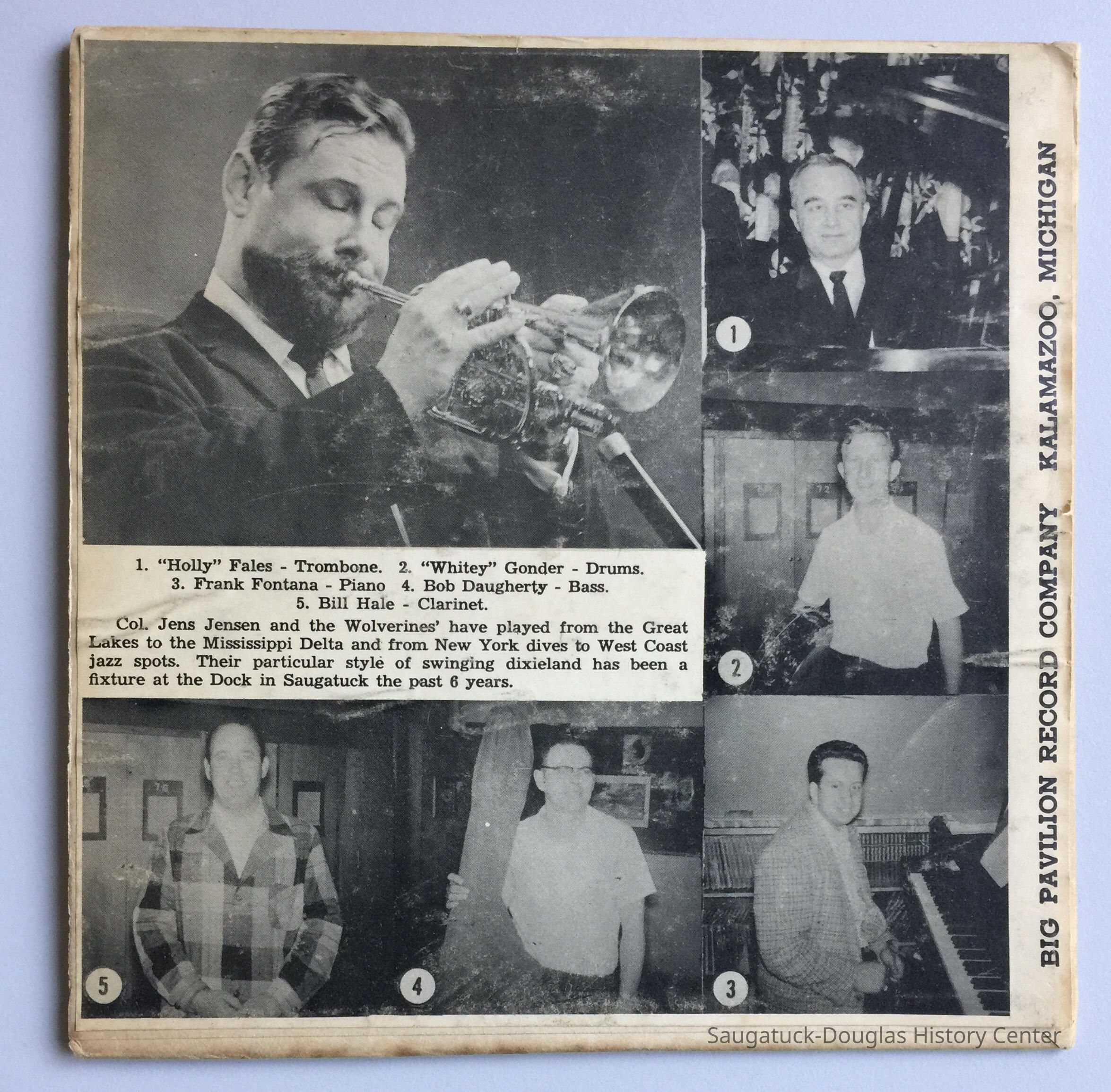 On the reverse side of the jacket are photos of Holly Fales, Trombone; Whitey Gonder, Drums; Frank Fontana, Piano; Bob Daugherty, Bass; Bill Hale, Clarinet.
