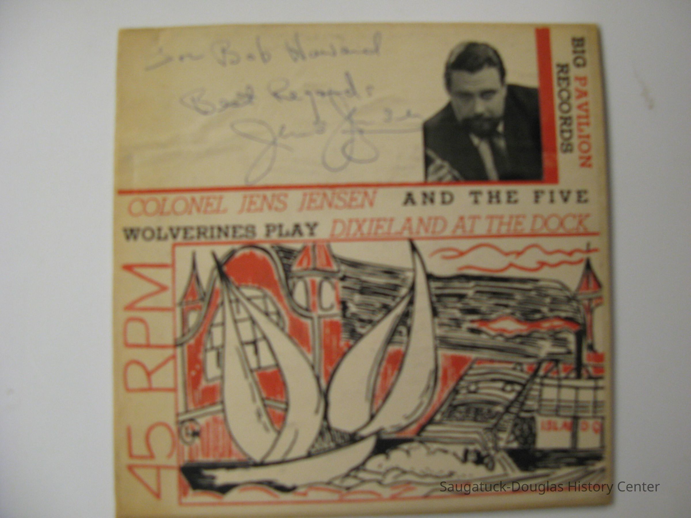 45 RPM red vinyl recording of Jens Jensen and the Five Wolverines. Big Pavilion Records (Kalamazoo) with graphic of the Big Pavilion. Signed: "For Bob Howard Best Regards Jens Jensen." Vol. 8 side 1 and side 2