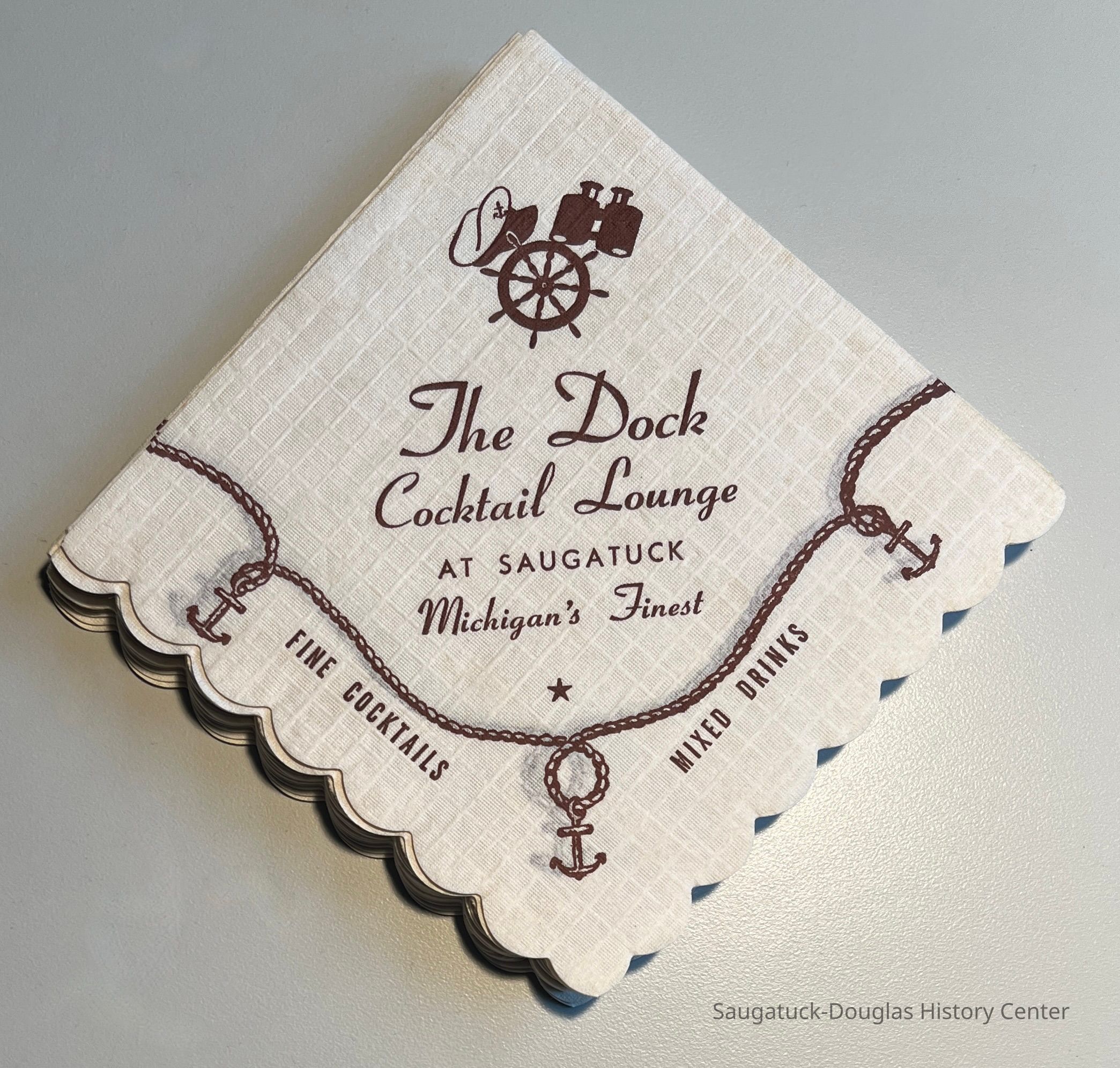 Stack of beige, textured-paper cocktail-size napkins with scalloped edges. Printed with "The Dock, Cocktail Lounge, at Saugatuck, Michigan's Finest, Fine Cocktails, Mixed Drinks in brown ink. The napkins are further adorned with a rope-and-anchor border and a trio of Captain's cap, binoculars and nautical steering wheel.Context