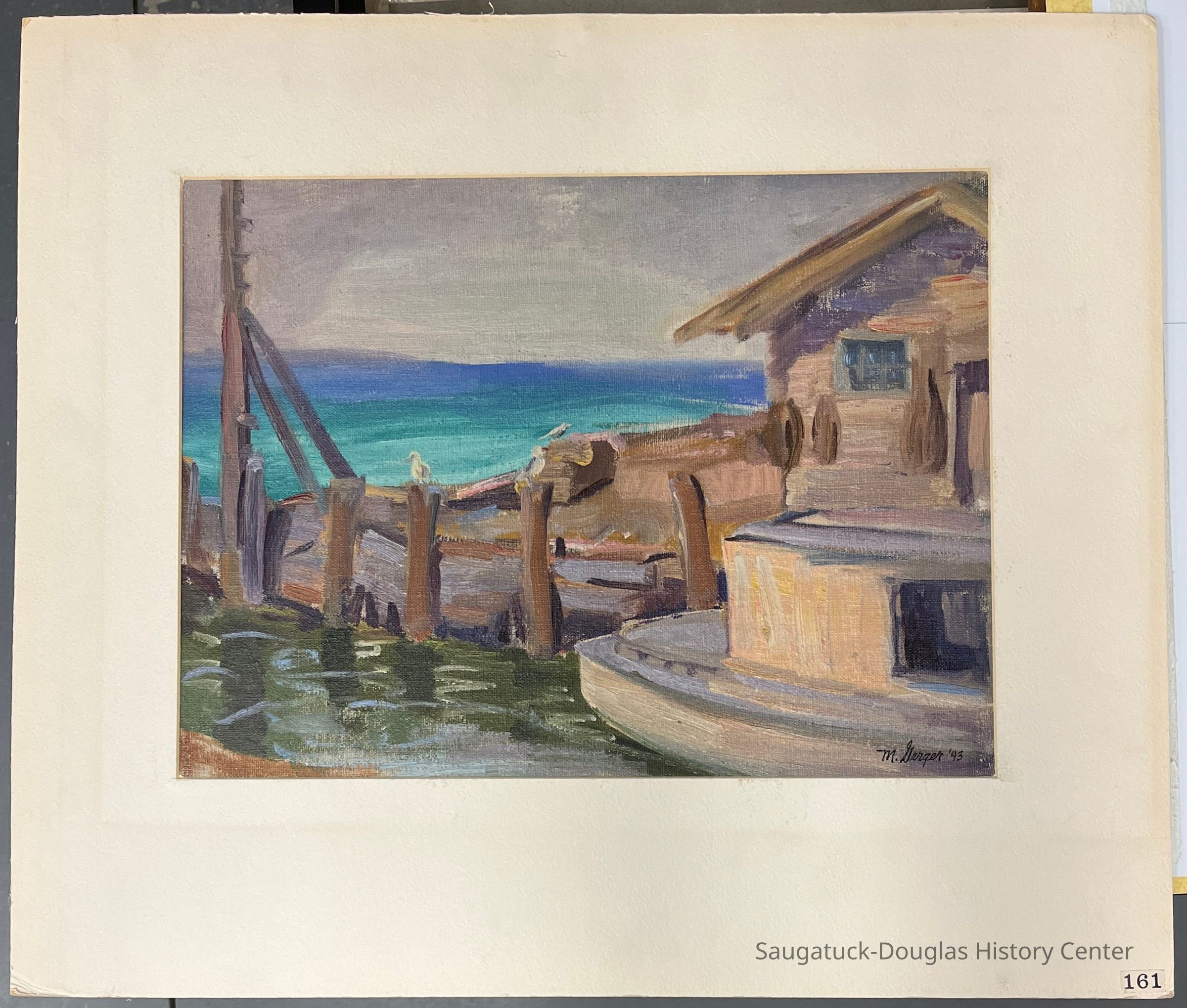 Matted but unframed oil painting of a dock and part of a building 16"x12" by Max Gerger, 1943Type of Painting