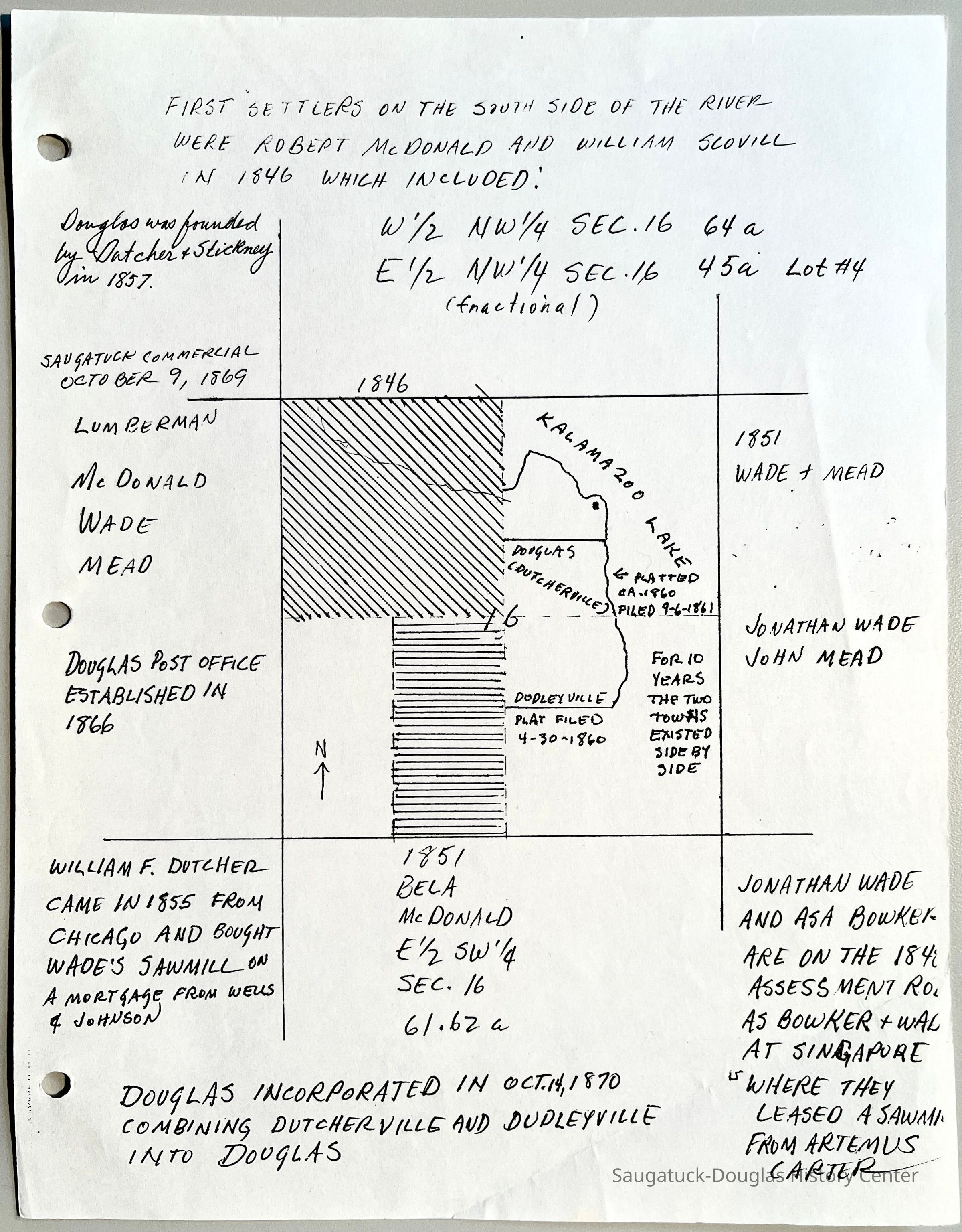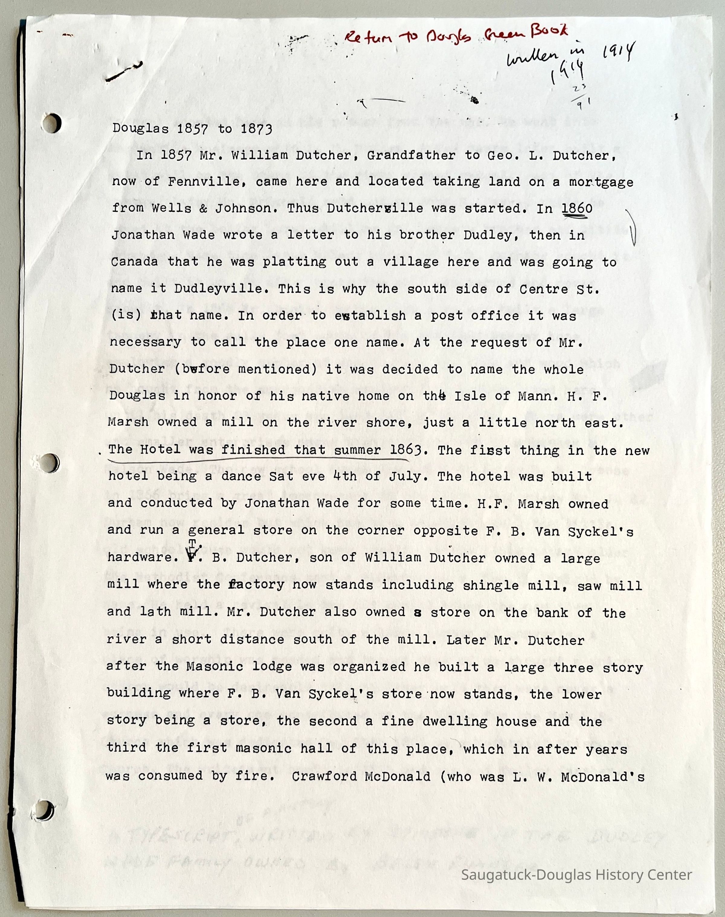 In 1857 Mr. William Dutcher, Grandfather to Geo. L. Dutcher, now of Fennville, came here and located taking land on a mortgage from Wells & Johnson. Thus Dutcherville was started. In 1860 Jonathan Wade wrote a letter to his brother Dudley, then in Canada that he was platting out a village here and was going to name it Dudleyville. This is why the south side of Centre St. (is) that name. In order to establish a post office it was necessary to call the place one name. At the request of Mr. Dutcher (before mentioned) it was decided to name the whole Douglas in honor of his native home on the Isle of Mann. H. F. Marsh owned a mill on the river shore, just a little north east. The Hotel was finished that summer 1863. The fisst thing in the new hotel being a dance Sat eve 4th of July. The hotel was built and conducted by Jonathan Wade for some time. H.F. Marsh owned and run a general store on the corner opposite F. B. Van Syckel's hardware. V. B. Dutcher, son of William Dutcher owned a large mill where the factory now stands including shingle mill, saw mill and lath mill. Mr. Dutcher also owned a store on the bank of the river a short distance south of the mill. Later Mr. Dutcher after the Masonic lodge was organized he built a large three story building where F. B. Van Syckel's store now stands, the lower story being a store, the second a fine dwelling house and the third the first masonic hall of this place, which in after years was consumed by fire. Crawford McDonald (who was L. W. McDonald's