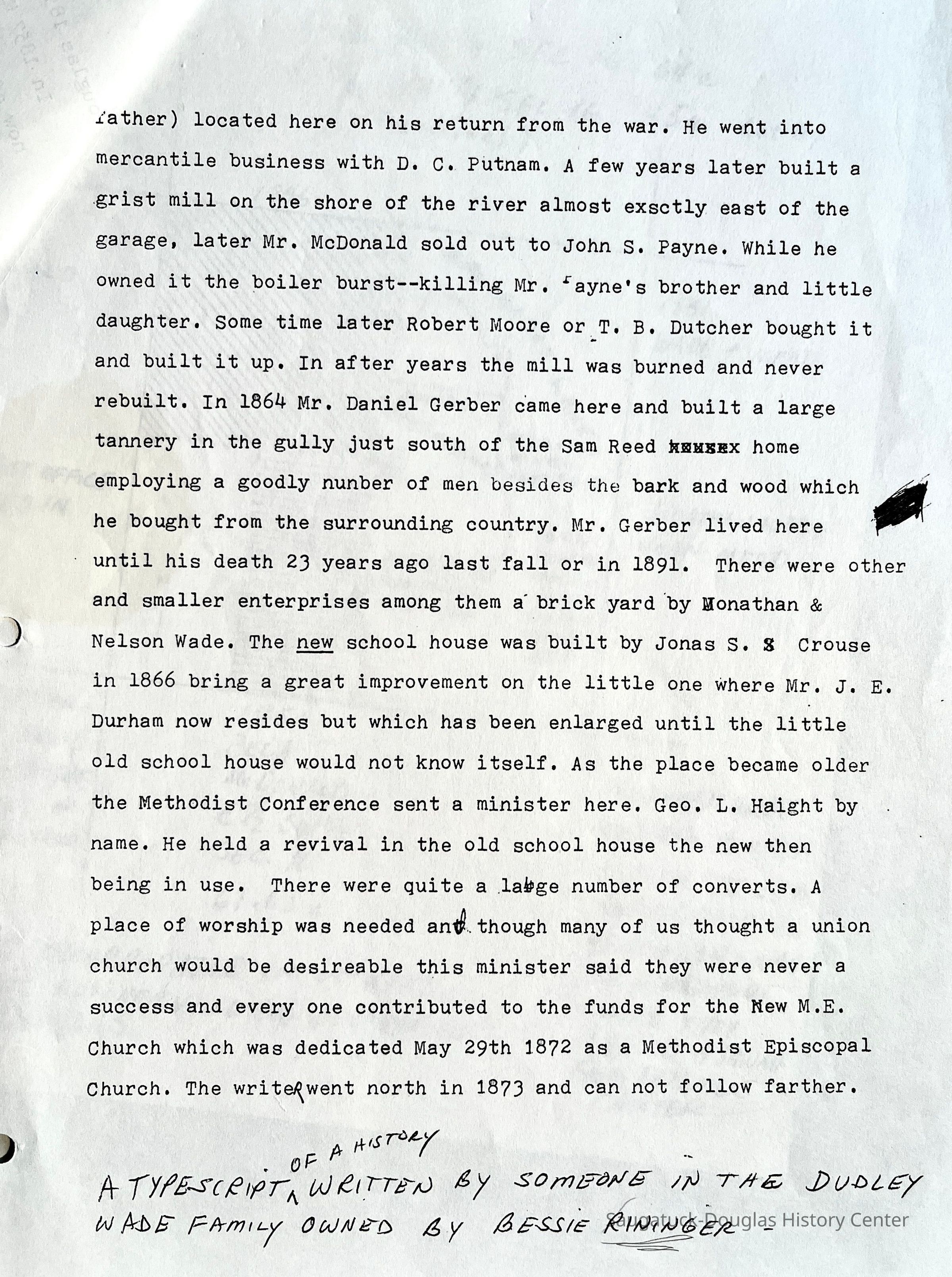 Photocopy of a 2-page history of early Douglas "written by someone in the Dudley Wade family owned by Bessie Rininger." A handwritten note at the top of page one reads "Return to Douglas Green Book" and "Written in 1914"
