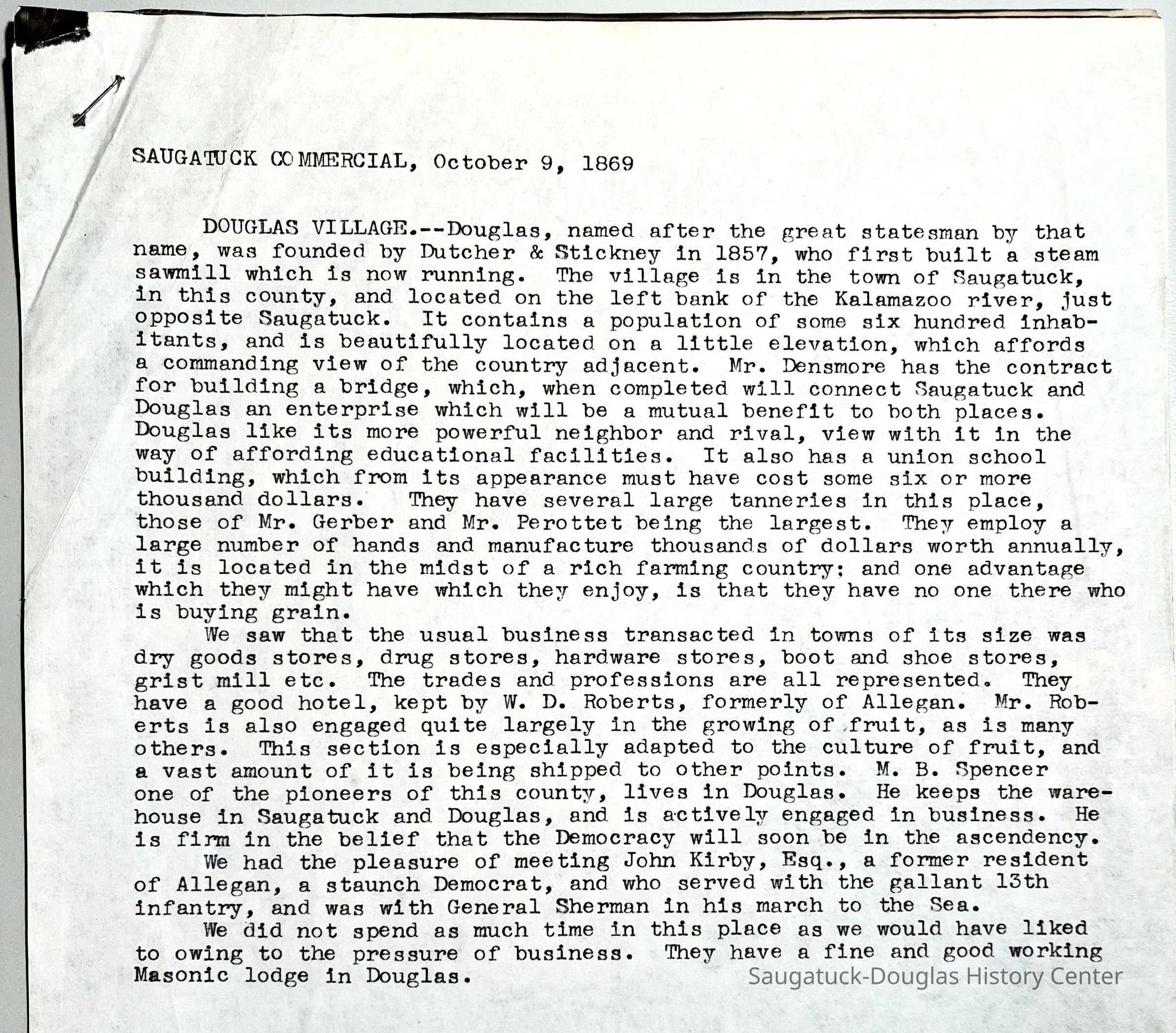We saw that the usual business transacted in towns of its size was dry goods stores, drug stores, hardware stores, boot and shoe stores, grist mill etc. The trades and professions are all represented. They have a good hotel, kept by W. D. Roberts, formerly of Allegan. Mr. Roberts is also engaged quite largely in the growing of fruit, as is many others. This section is especially adapted to the culture of fruit, and a vast amount of it is being shipped to other points. M. B. Spencer one of the pioneers of this county, lives in Douglas. He keeps the warehouse in Saugatuck and Douglas, and is actively engaged in business. He is firm in the belief that the Democracy will soon be in the ascendency.