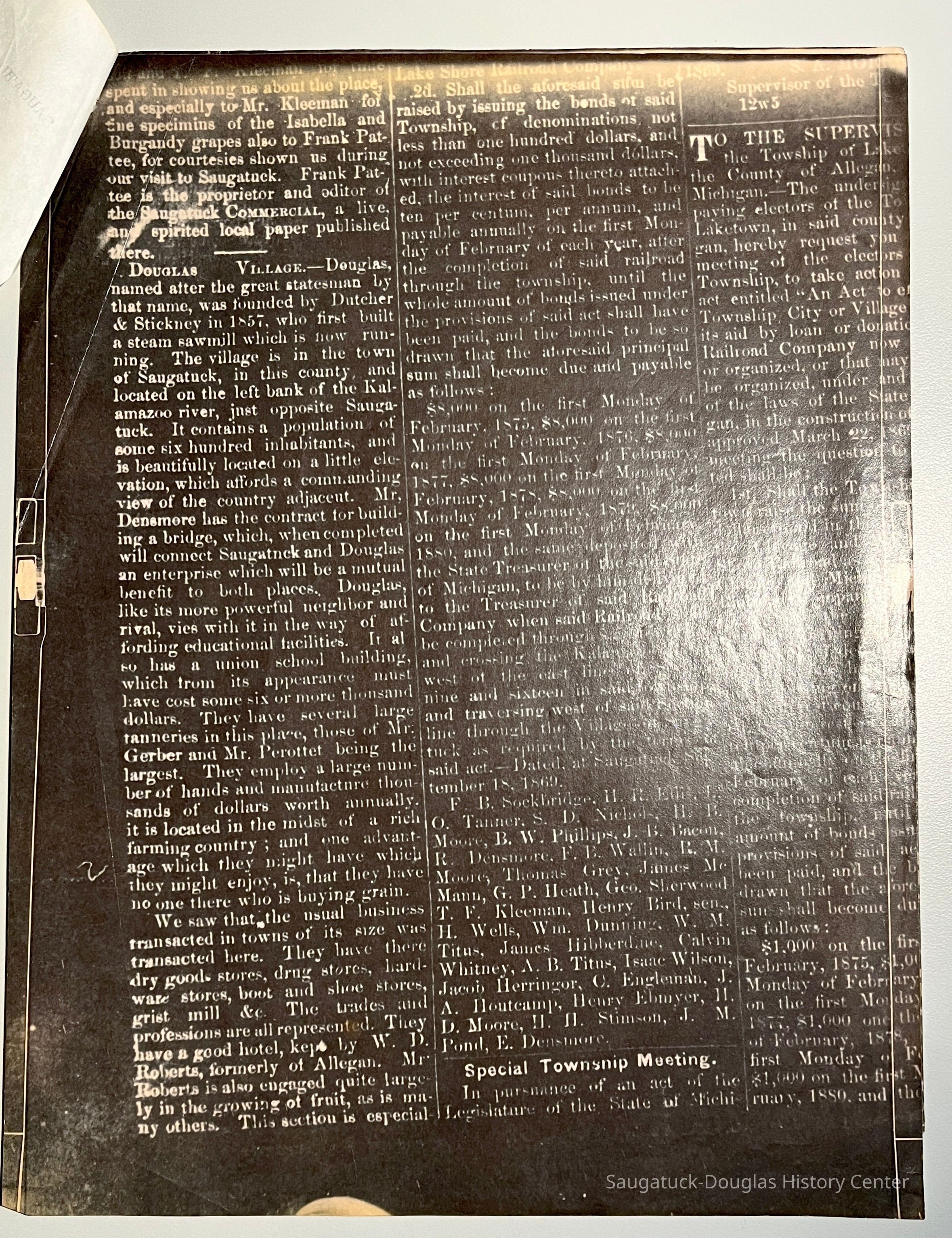DOUGLAS VILLAGE.--Douglas, named after the great statesman by that name, was founded by Dutcher & Stickney in 1857, who first built a steam sawmill which is now running. The village is in the town of Saugatuck, in this county, and located on the left bank of the Kalamazoo river, just opposite Saugatuck. It contains a population of some six hundred inhabitants, and is beautifully located on a little elevation, which affords a commanding view of the country adjacent. Mr. Densmore has the contract for building a bridge, which, when completed will connect Saugatuck and Douglas an enterprise which will be a mutual benefit to both places. Douglas like its more powerful neighbor and rival, view with 1t in the way of affording educational facilities. It also has a union school building, which from its appearance must have cost some six or more thousand dollars. They have several large tanneries in this place, those of Mr. Gerber and Mr. Perottet being the largest. They employ a large number of hands and manufacture thousands of dollars worth annually, it is located in the midst of a rich farming country; and one advantage which they might have which they enjoy, is that they have no one there who is buying grain.