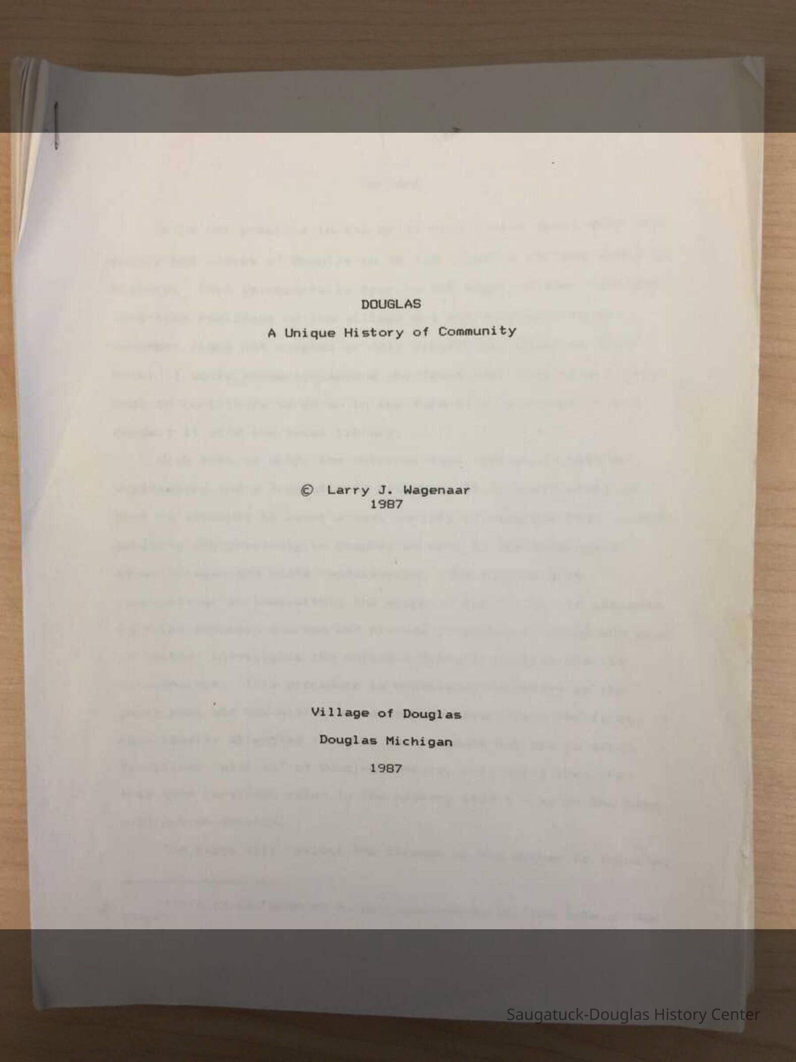A 61 page manuscript about the history of Douglas written by Larry Wagner and commissioned by the Village of Douglas in 1987.Collection