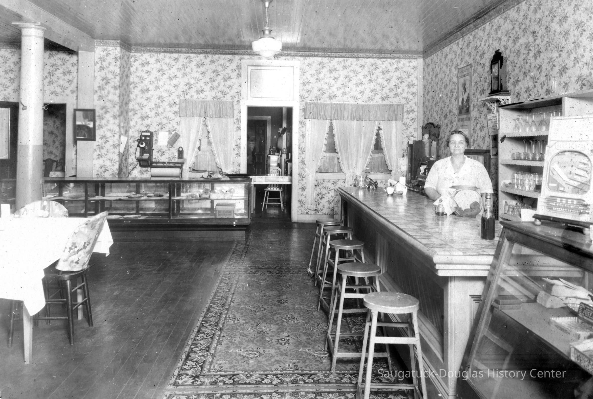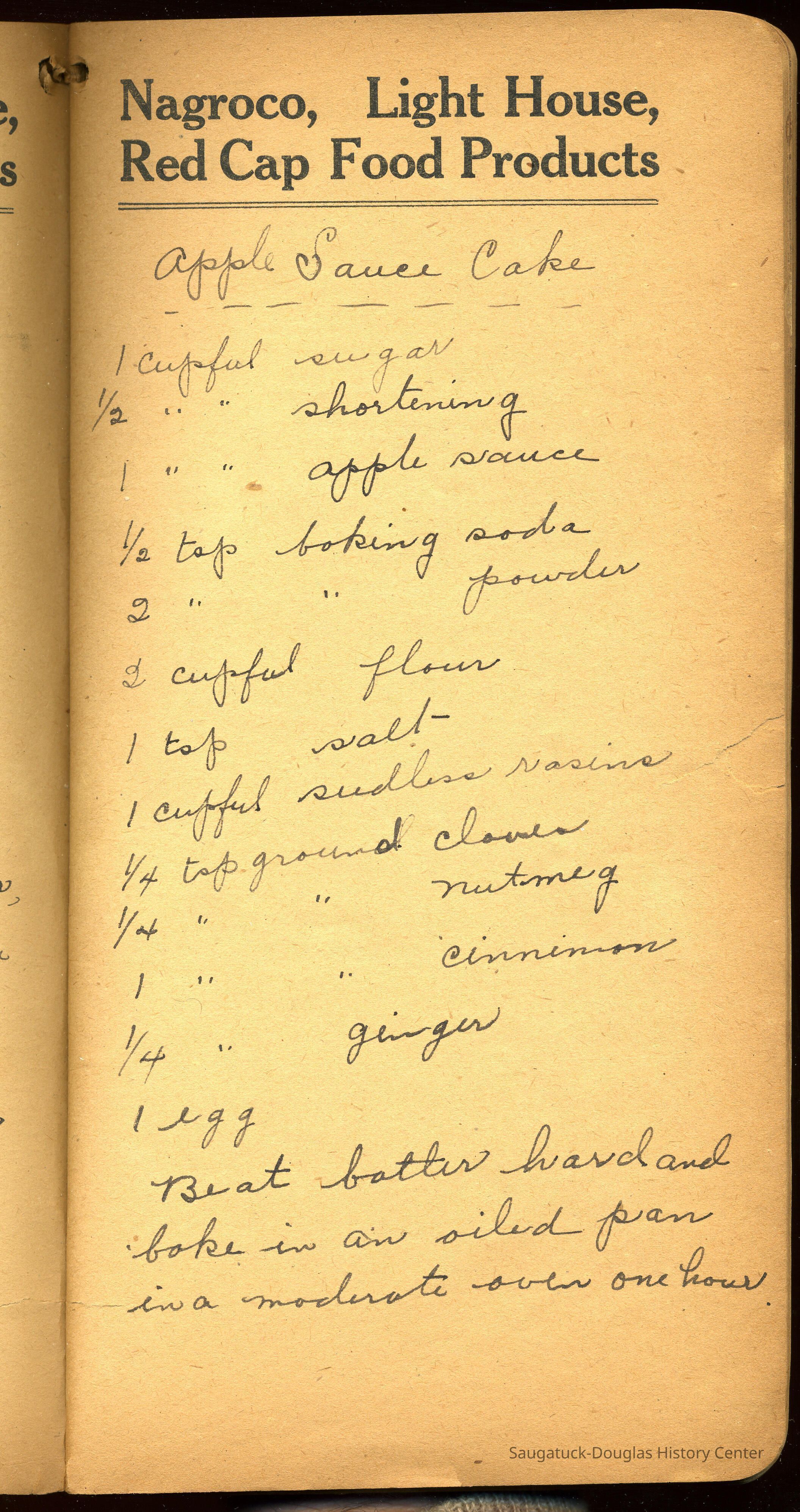 The photo of the store, from around the same time suggests that the grocery business had fallen into hard times, and might explain why, by the 1930s, the Wiegerts had converted the space into a restaurant called the Douglas Cafe. We speculate that the woman in the photo is the Wiegert’s daughter Beatrice—standing behind the dining counter at a cookie jar. Beatrice was in the Douglas school ‘upper grades’ in 1920-21. According to Mr. Demi Demerest, the Douglas Cafe was well known for pies and cakes (check out the glass case to the rear of the room). We feature one of the desert recipes from Beatrice’s recipe book, now in the possession of Jan Van Liere. Does anyone have a Douglas Cafe menu and does anyone know when the restaurant closed? Let us know any information and of course we would like to sample a piece of the apple sauce cake!