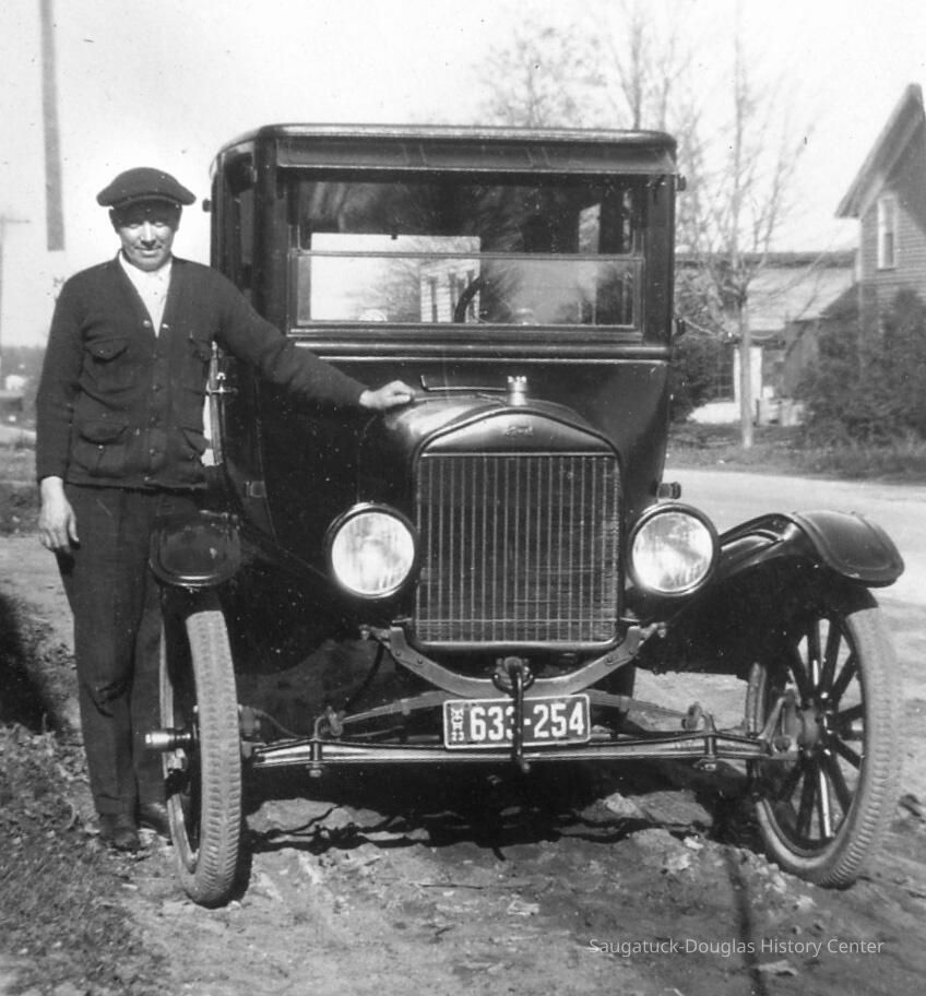 Assembling the clues, here is what we have found. The structure itself was built in the early 1900s as Ben Wiegert’s Model Grocery and shows up on a 1910 “Sanborn Fire Map” with separate entrances for groceries and drugs. Ben is shown here with the family Ford sedan in 1923.
