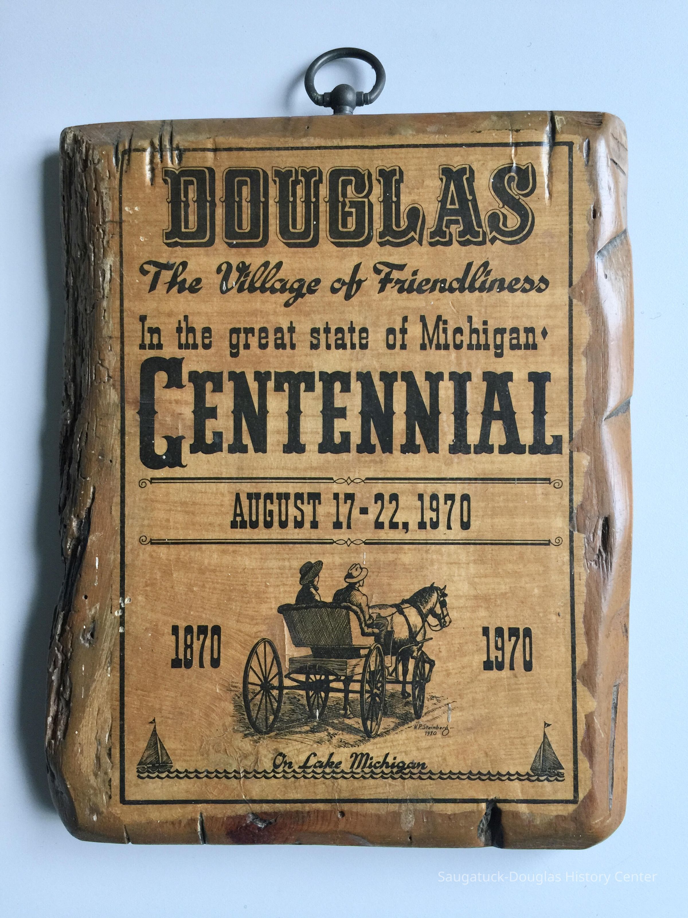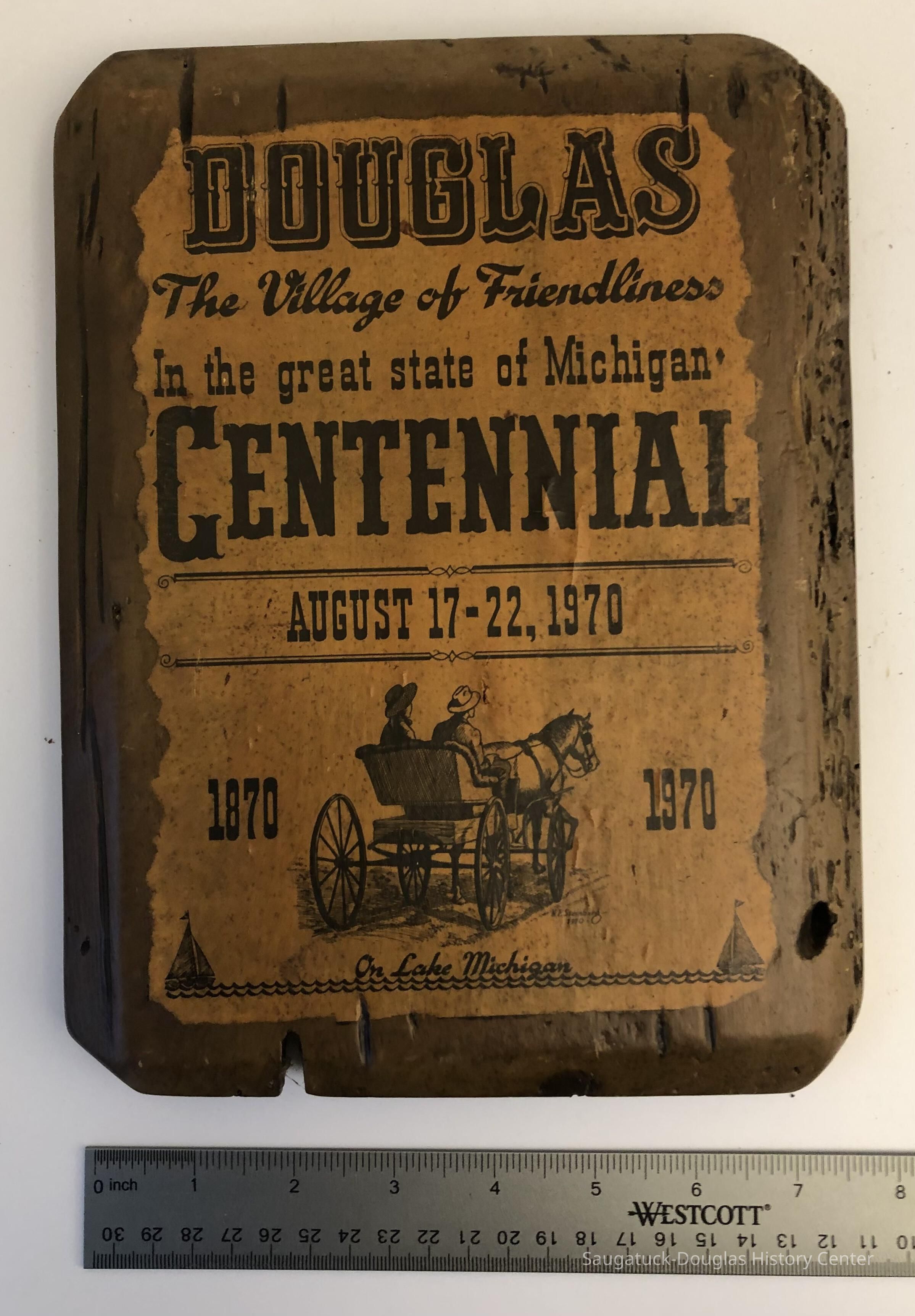 Wooden plaque with copy of Nate Steinberg's Douglas Centennial 1970 poster decoupaged to the front. A label pasted to the back says "This board from the historic Brittain house, Saugatuck, Mich., built around 1865, razed 1967."