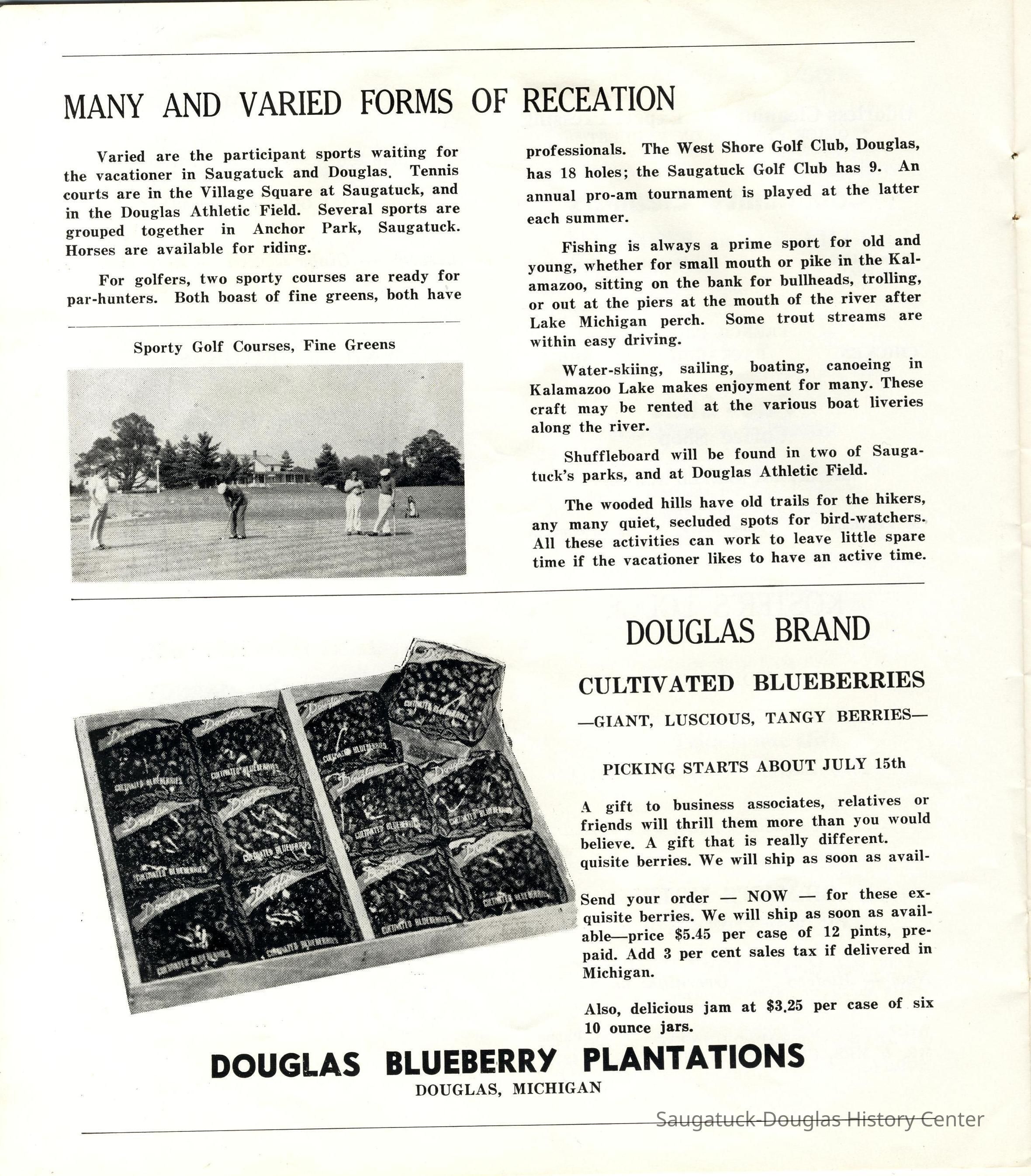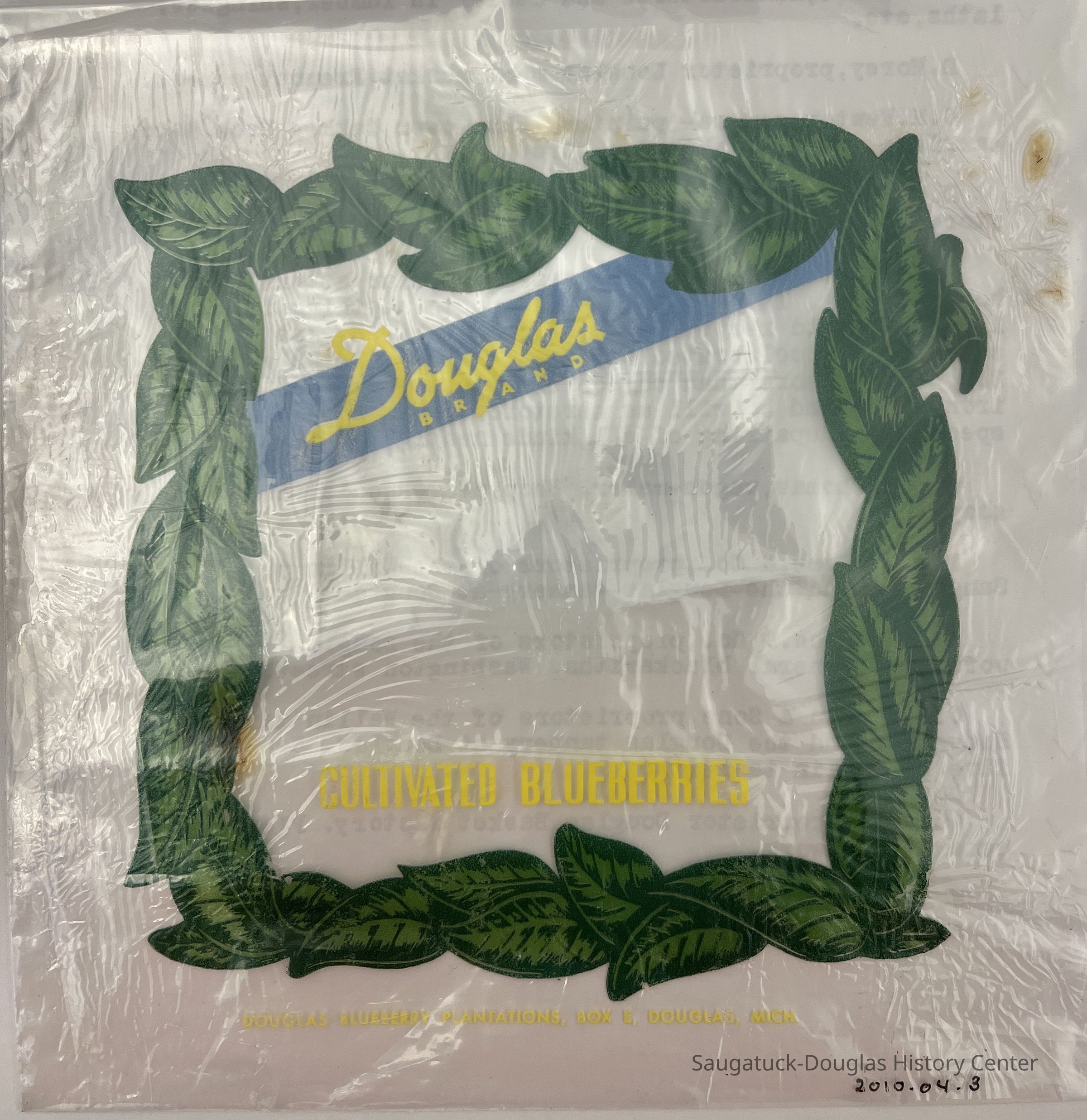 Cellophane wrapper used to cover a pint of Douglas grown blueberries. Text reads "Douglas Brand Cultivated Blueberries, Douglas Blueberry Plantations, Box E, Douglas Mich.Collection
