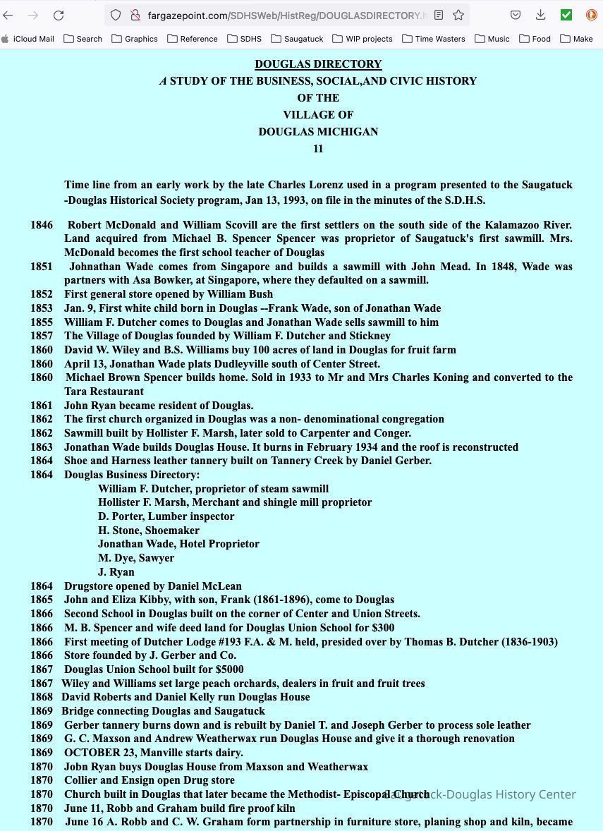 JES 1851 Johnathan Wade bought property for a sawmill, S. of south end of Blue Star Hiway bridge. Wells and Johnson gave him financial backing to build the mill. Later mill bought by William Dutcher, then sold to Thomas Gray and James Crouse, evolved into the Douglas Basket :Factory. Wade built small house on west end of Center street in Douglas, also a boarding house close to the mill. Wade platted a district south of Center street which he called `Dudleyville in honor of his brother Dudley Wade. When William Dutcher arrived, with his sons George and Thomas Benton, and daughter, Elizabeth, he bought land north of Center street and called it Dutcherville.