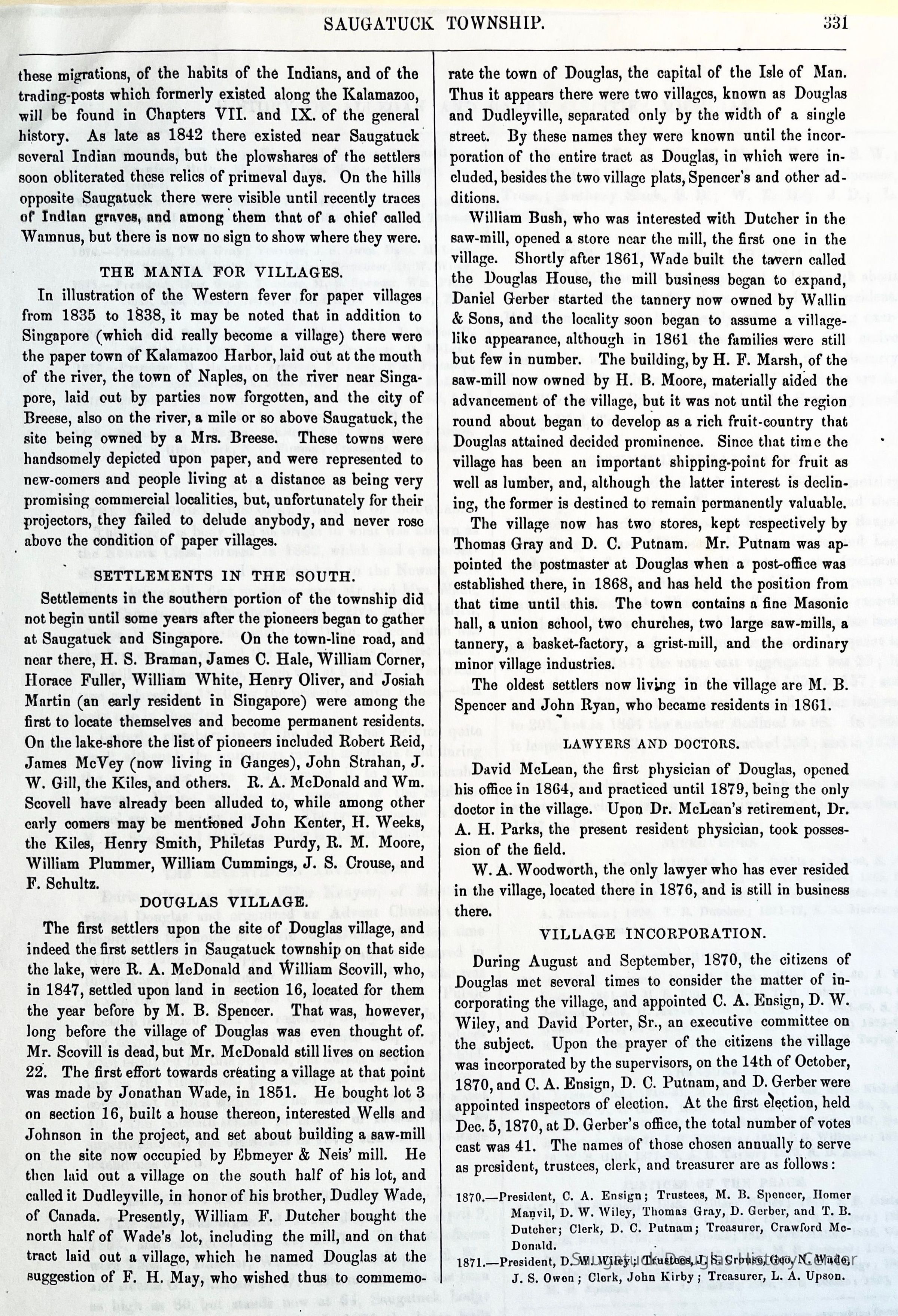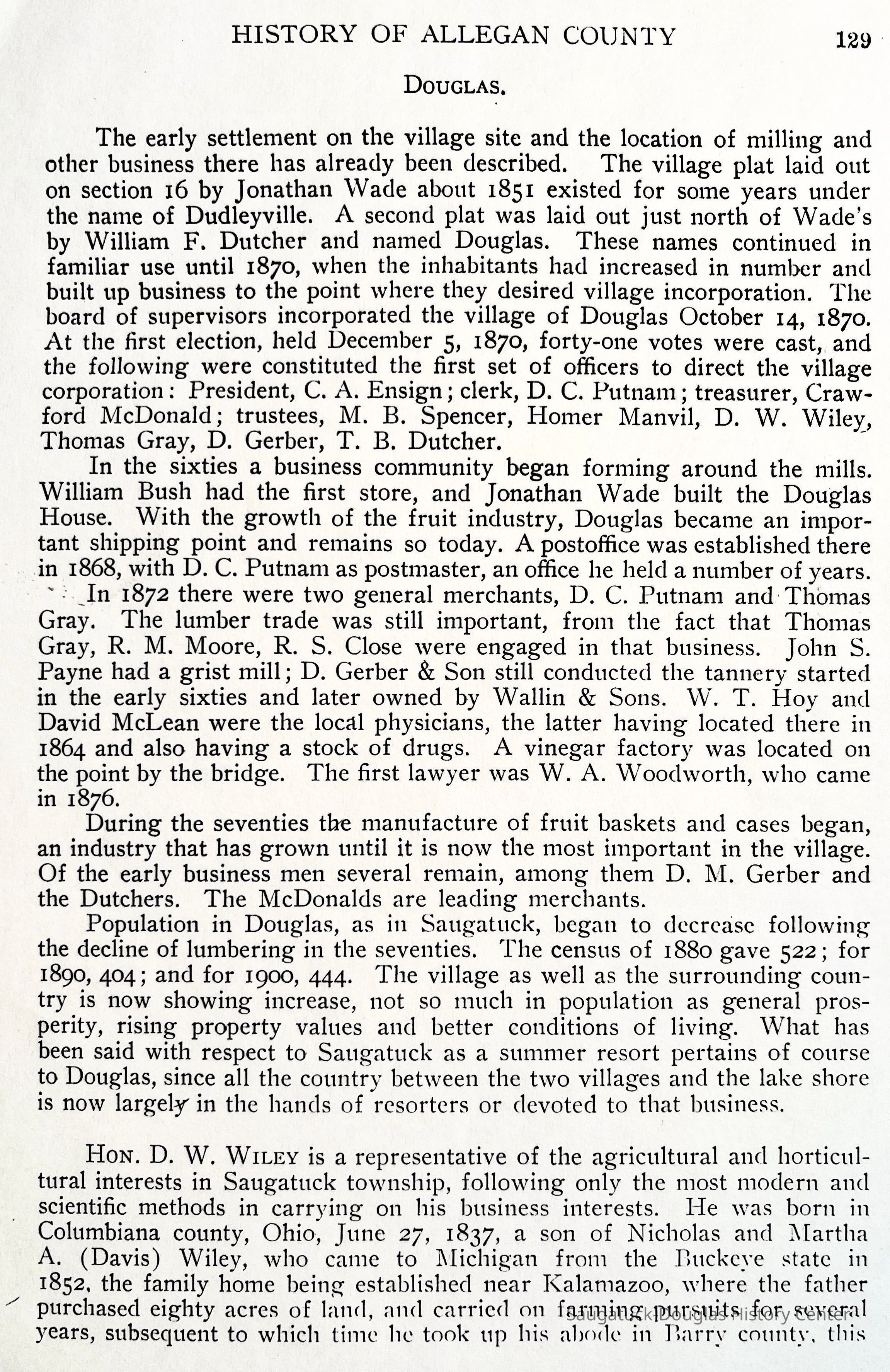 The first settlers upon the site of Douglas village, and indeed the first settlers in Saugatuck township on that side the lake, were R. A. McDonald and William Scovill, who, in 1847, settled upon land in section 16, located for them the year before by M. B. Spencer. That was, however, long before the village of Douglas was even thought of. Mr. Scovill is dead, but Mr. McDonald still lives on section 22. The first effort towards creating a village at that point was made by Jonathan Wade, in 1851. He bought lot 3 on section 16, built a house thereon, interested Wells and Johnson in the project, and set about building a saw-mill on the site now occupied by Ebmeyer & Neis' mill. He then laid out a village on the south half of his lot, and called it Dudleyville, in honor of his brother, Dudley Wade, of Canada. Presently, William F. Dutcher bought the north half of Wade's lot, including the mill, and on that tract laid out a village, which he named Douglas at the suggestion of F. H. May, who wished thus to commemorate the town of Douglas, the capital of the Isle of Man. Thus it appears there were two villages, known as Douglas and Dudleyville, separated only by the width of a single street. By these names they were known until the incorporation of the entire tract as Douglas, in which were included, besides the two village plats, Spencer's and other additions. William Bush, who was interested with Dutcher in the saw-mill, opened a store near the mill, the first one in the village. Shortly after 1861, Wade built the tavern called the Douglas House, the mill business began to expand, Daniel Gerber started the tannery now owned by Wallin & Sons, and the locality soon began to assume a village-like appearance, although in 1861 the families were still but few in number. The building, by H. F. Marsh, of the saw-mill now owned by H. B. Moore, materially aided the advancement of the village, but it was not until the region round about began to develop as a rich fruit-country that Douglas attained decided prominence. Since that time the village has been an important shipping-point for fruit as well as lumber, and, although the latter interest is declining, the former is destined to remain permanently valuable. The village now has two stores, kept respectively by Thomas Gray and D. C. Putnam. Mr. Putnam was appointed the postmaster at Douglas when a post-office was established there, in 1868, and has held the position from that time until this. The town contains a fine Masonic hall, a union school, two churches, two large saw-mills, a tannery, a basket-factory, a grist-mill, and the ordinary minor village industries. The oldest settlers now living in the village are M. B. Spencer and John Ryan, who became residents in 1861.