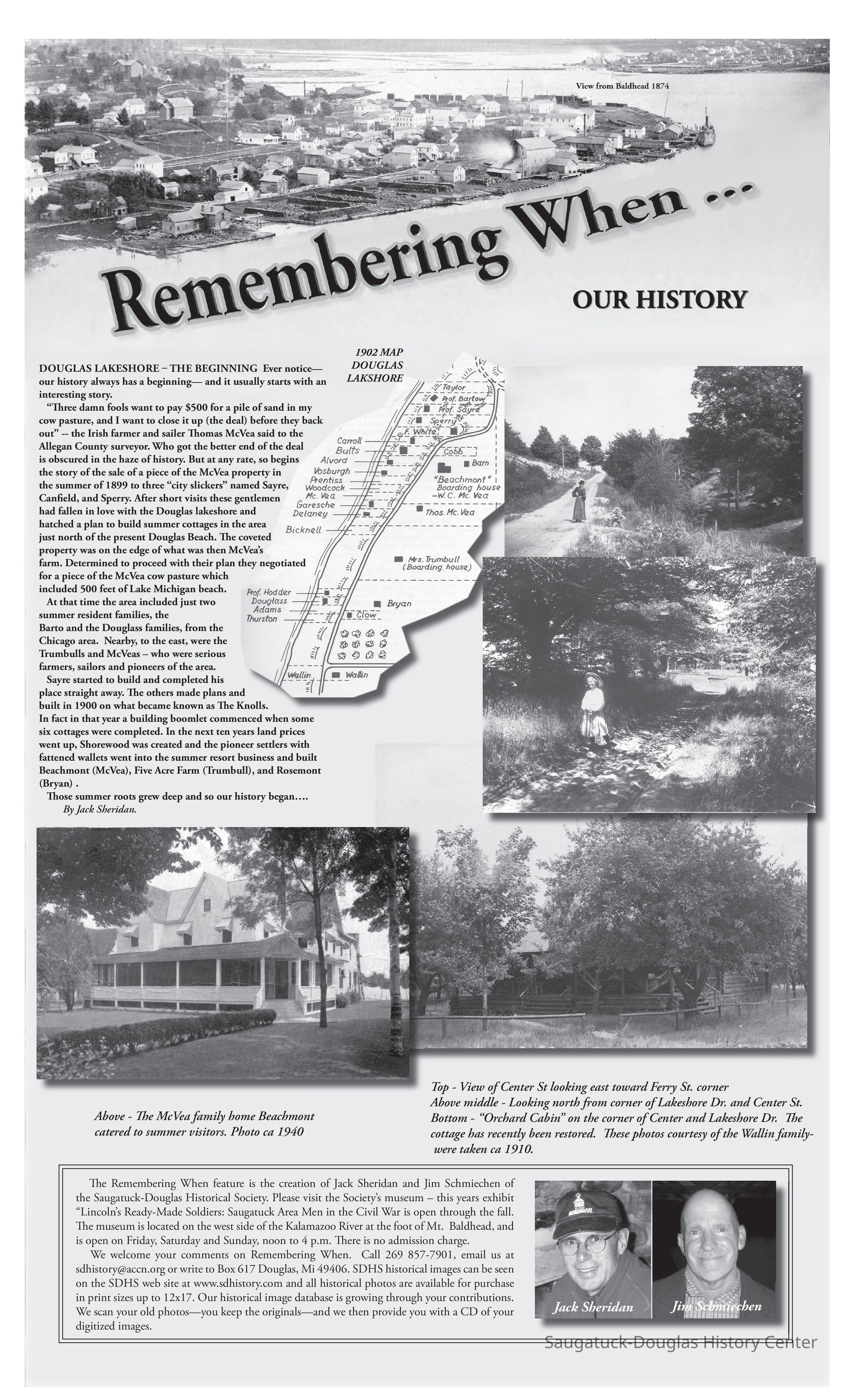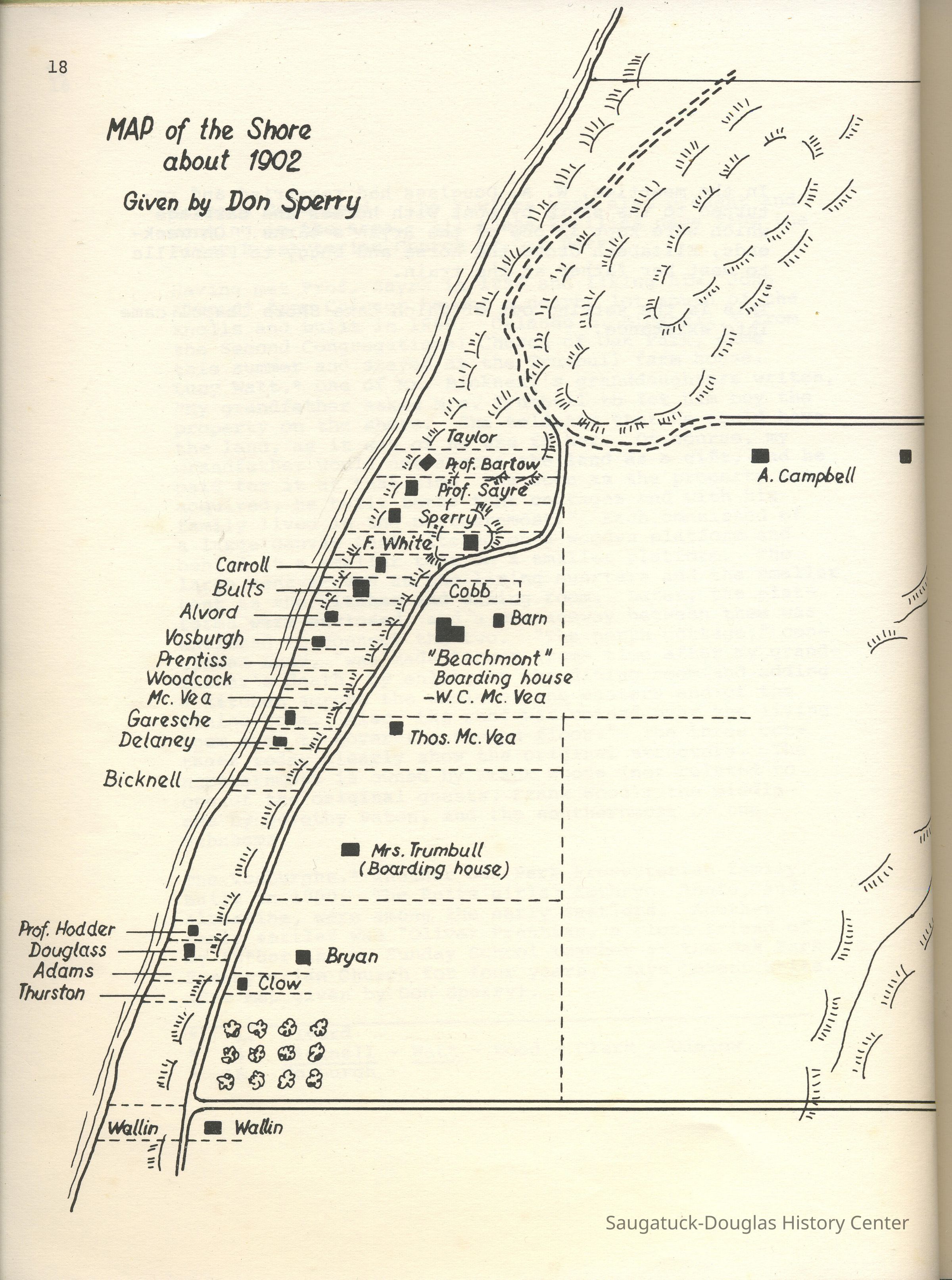 “Three damn fools want to pay $500 for a pile of sand in my cow pasture, and I want to close it up (the deal) before they back out” -- the Irish farmer and sailer Thomas McVea said to the Allegan County surveyor. Who got the better end of the deal is obscured in the haze of history. But at any rate, so begins the story of the sale of a piece of the McVea property in the summer of 1899 to three “city slickers” named Sayre, Canfield, and Sperry. After short visits these gentlemen had fallen in love with the Douglas lakeshore and hatched a plan to build summer cottages in the area just north of the present Douglas Beach. The coveted property was on the edge of what was then McVea’s farm. Determined to proceed with their plan they negotiated for a piece of the McVea cow pasture which included 500 feet of Lake Michigan beach.