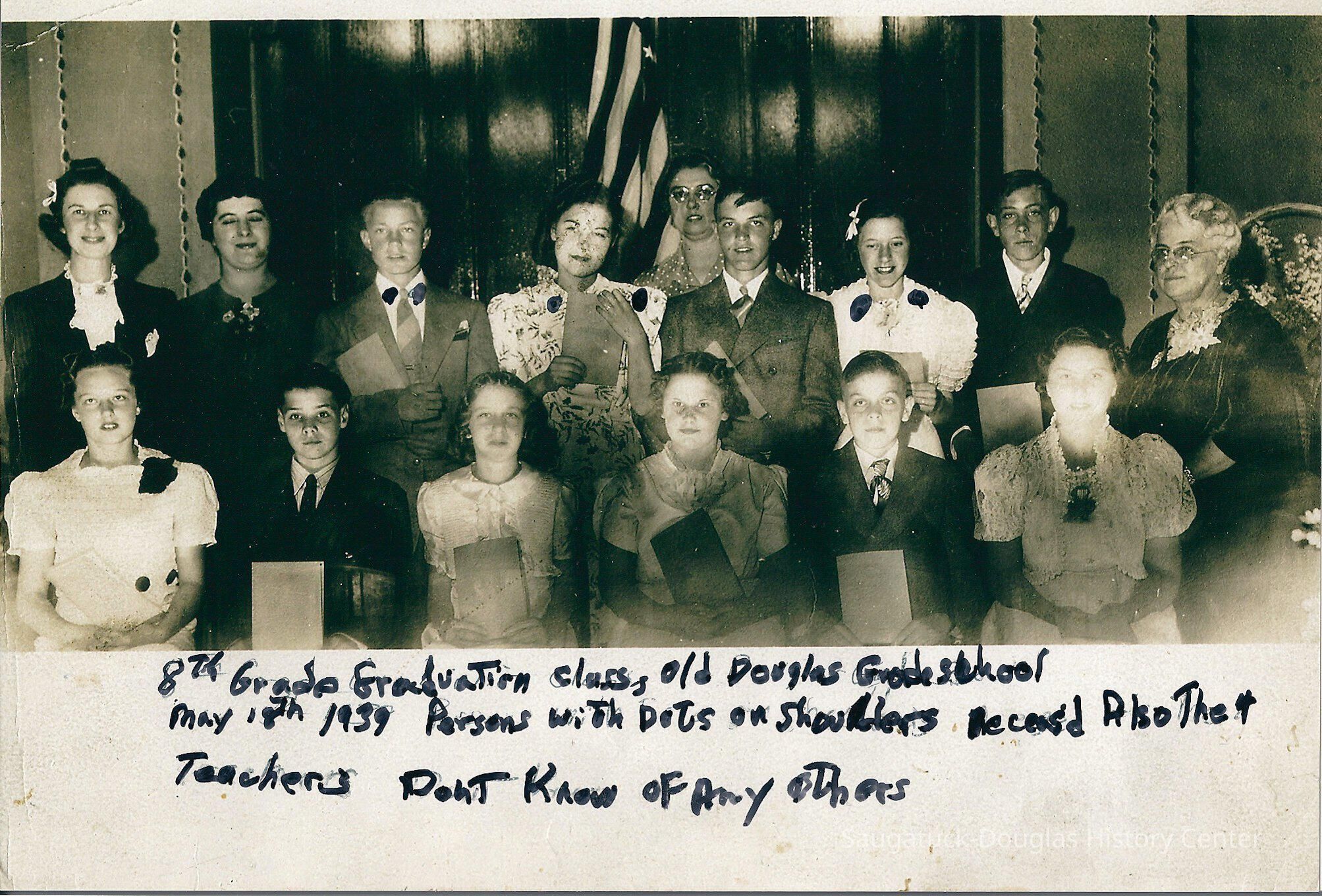 Text reads "8th grade graduation class, Old Douglas Grade School, May 18th 1939 Persons with dots on shoulders deceas'd also the 4 teachers Don't know of any others"Collection