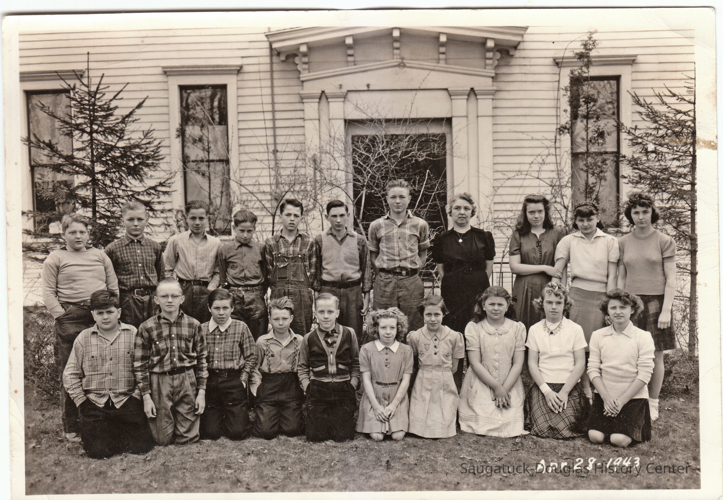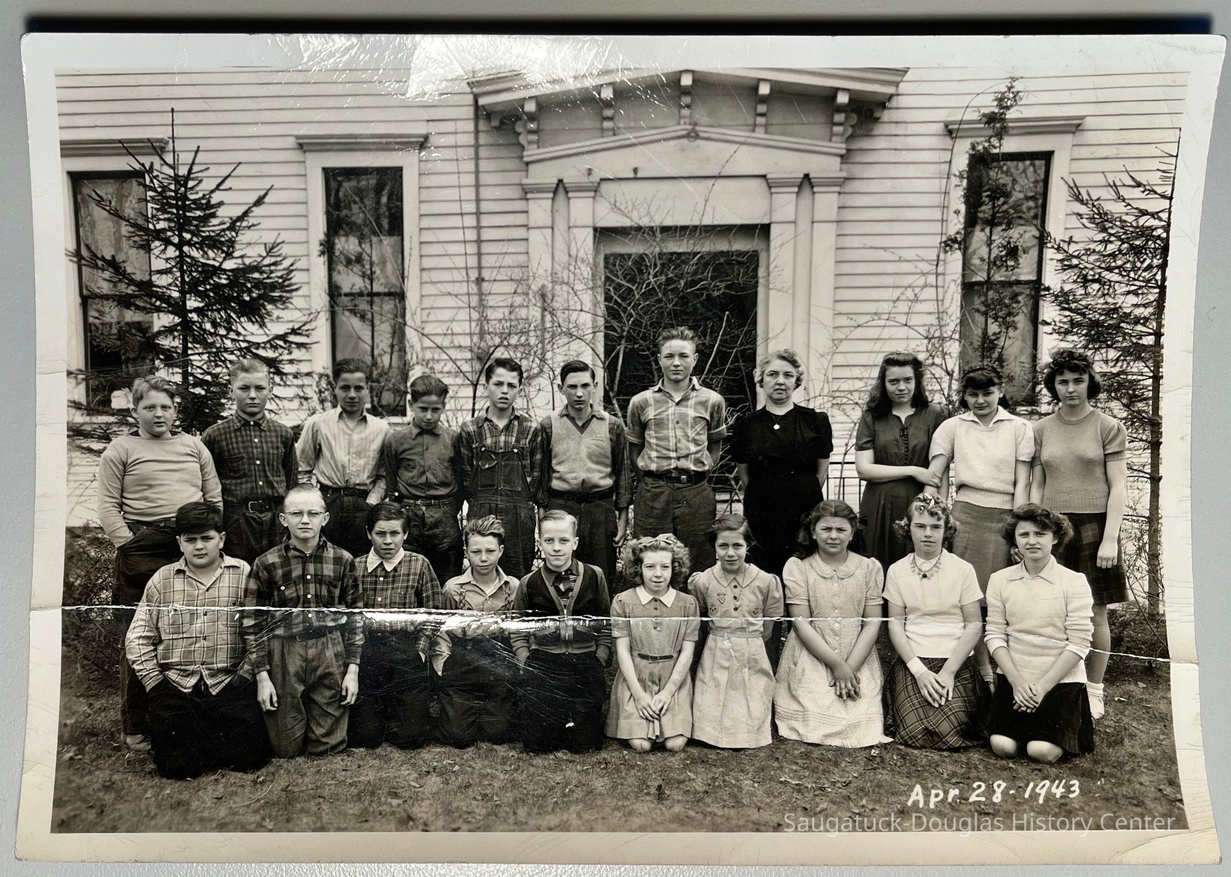 Photo of older children posed in two lines outside the Douglas Union School. Apr 28, 1943 is printed on the image.