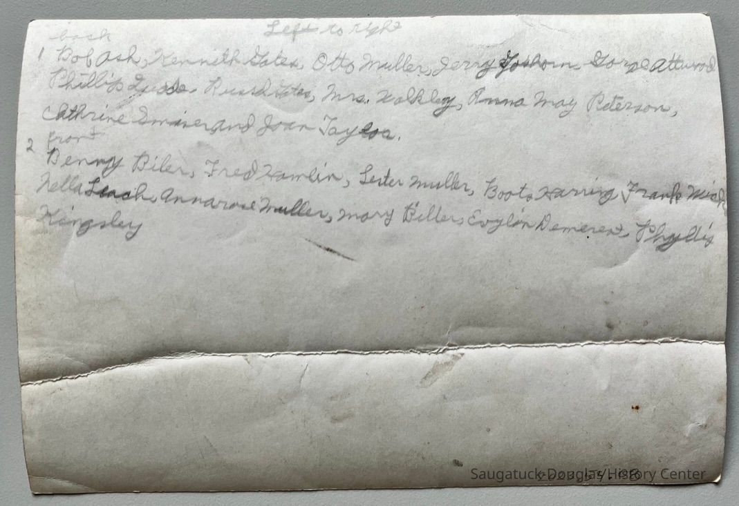 Faint penciled cursive handwriting on the back of the photo identifies the students as (back row, left to right) Bob Ash, Kenneth Gates, Otto Muller, Jerry Goshorn, George Attwood?, Phillip Ludde, Russel Gates, Mrs. Walkley, Anna May Peterson, Catherine S? and Joan Taylor. (Front row) Benny Biler, Fred Hamlin, Lester Muller, Boots Harring, Frank Wicks?, Nella Leach, Annarose Muller, Mary Biller, Evylin Demerest, Phyllis Kingsley.Photograph Details