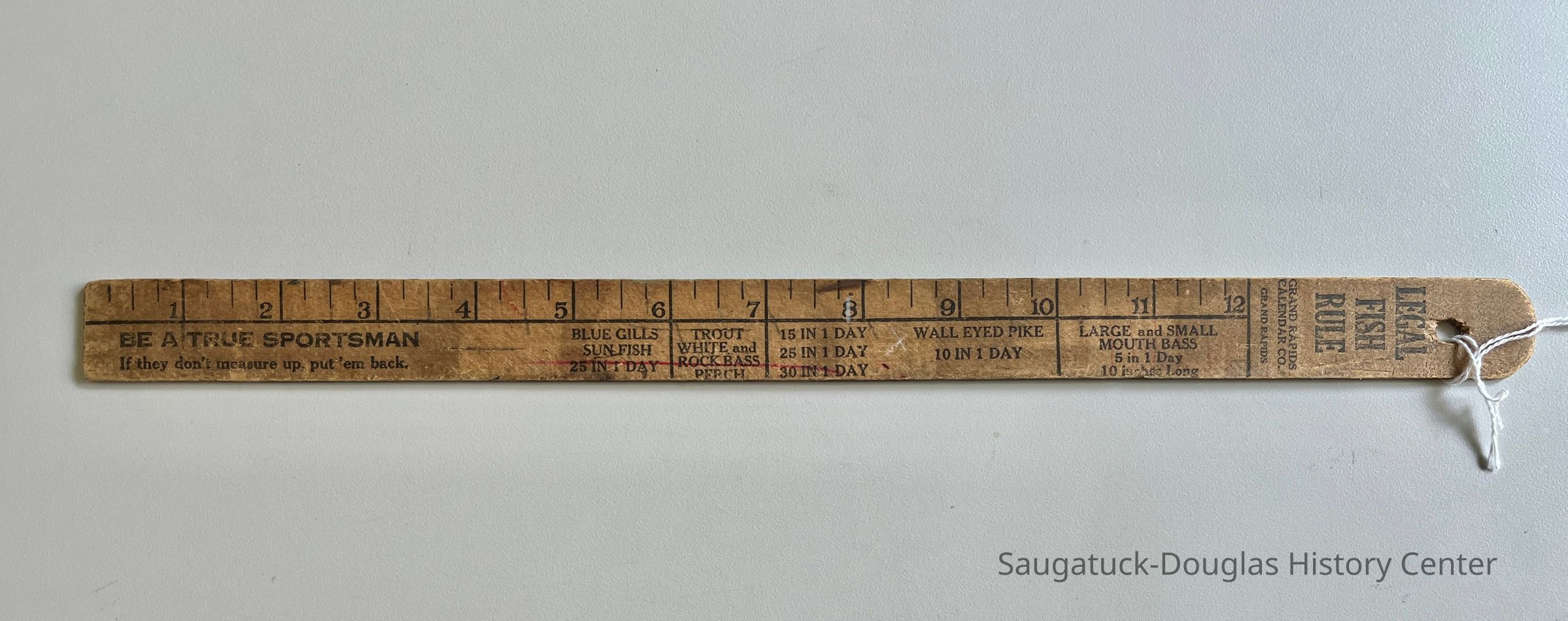 The other side is a Legal Fish Rule, by Grand Rapids Calendar Co. It shows the minimum size and daily quotas for Blue Gills, Sunfish; Trout, White and Rock Bass, Perch, Wall Eyed Pike, Large and Small Mouth Bass plus the slogan "Be a true sportsman - if they don't measure up, put 'em back."