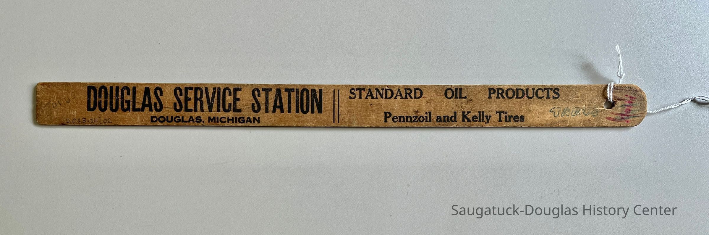 Flat wooden ruler with one end squared off, the other curved with a hole for hanging. On one side of the ruler is branded for the Douglas Service Station, Standard Oil Products, Pennzoil and Kelly Tires.