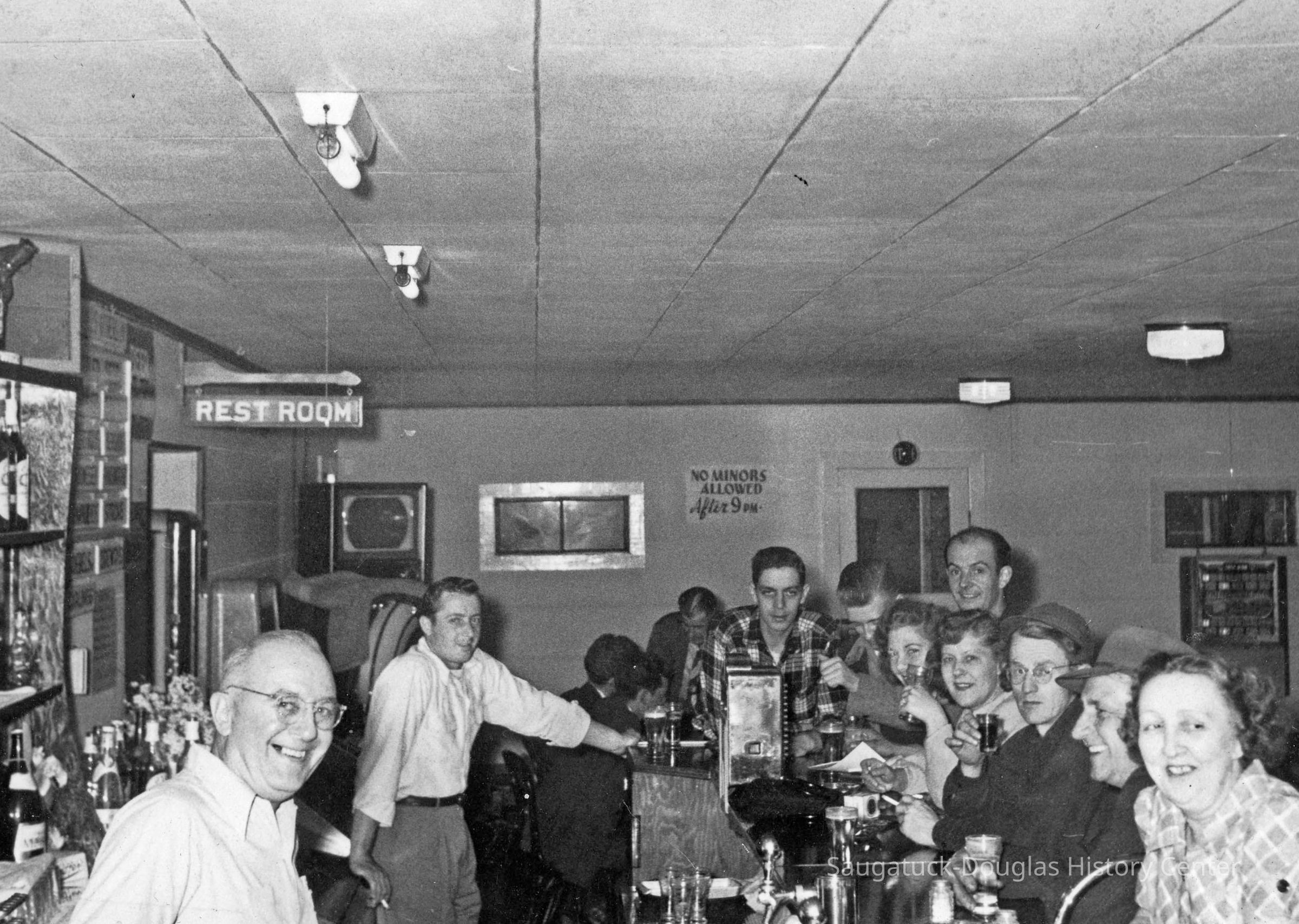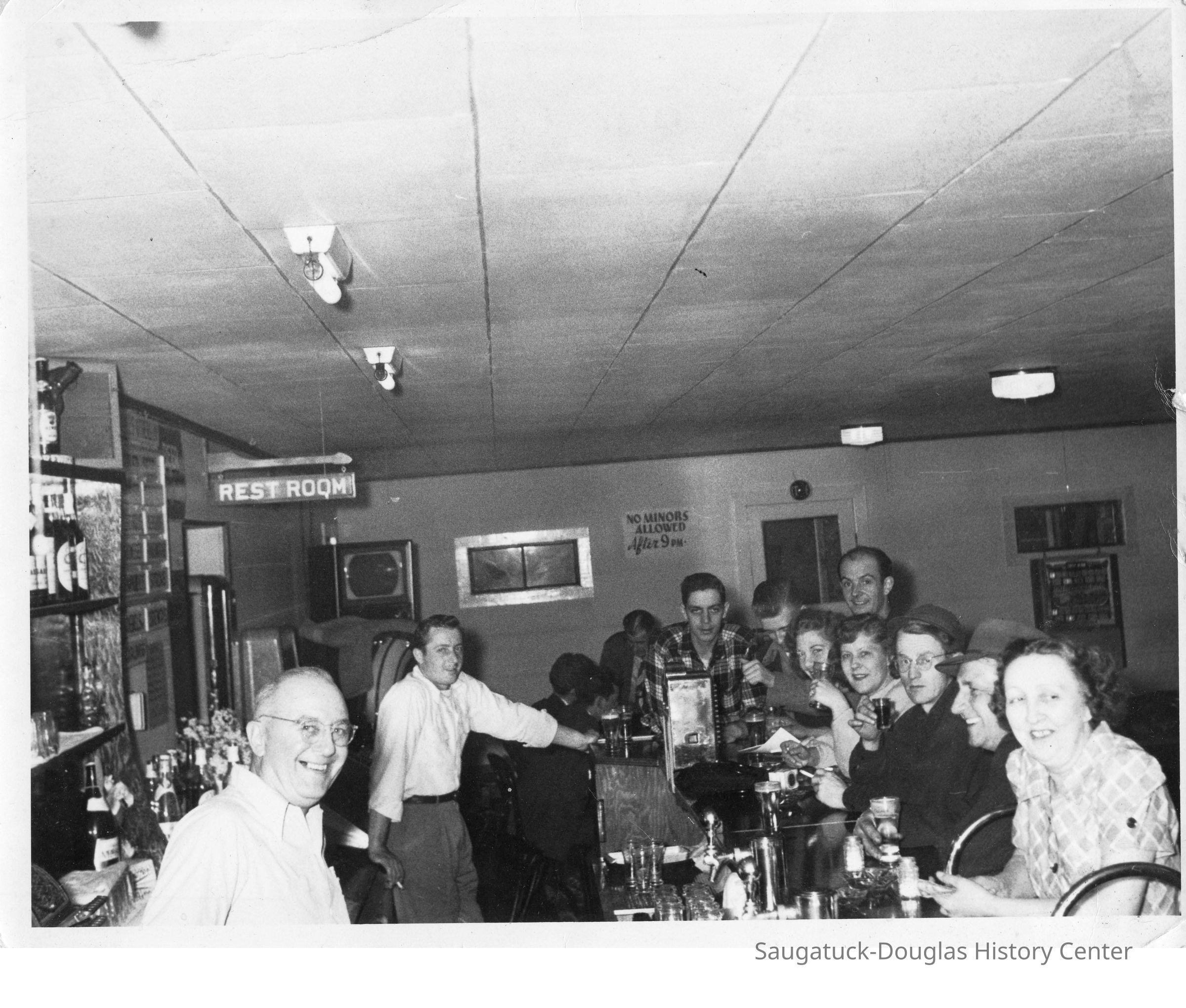 Two bartenders and their customers smile at the camera for this photo from inside a tavern. No minors were allowed after 9 pm.