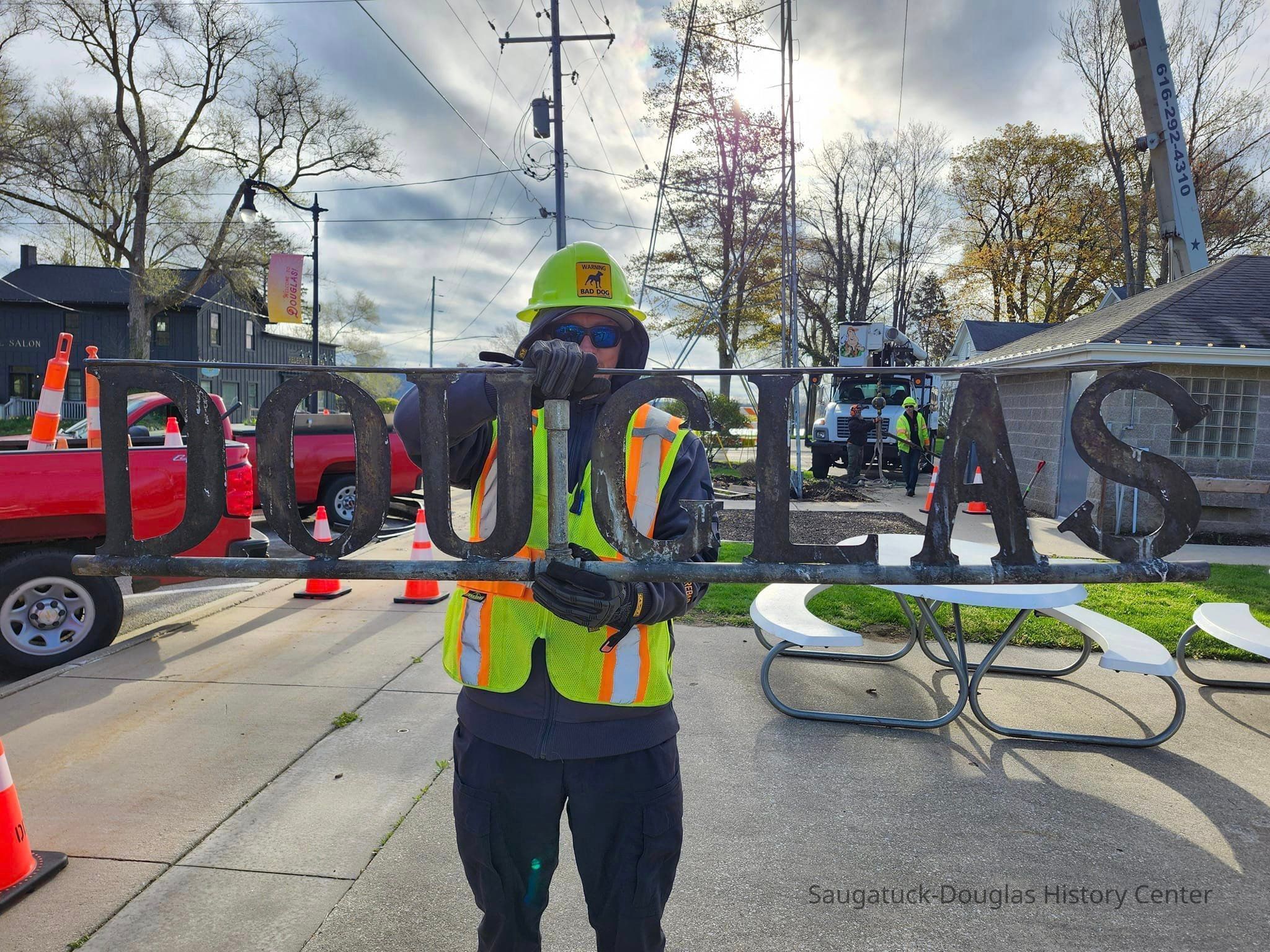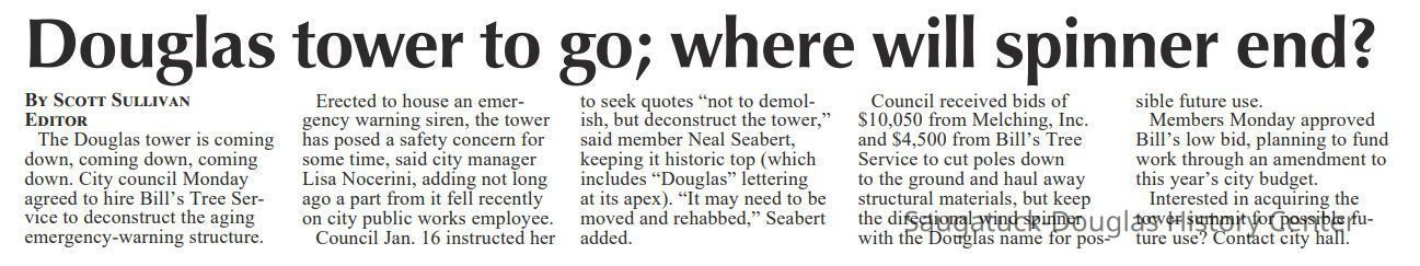 Metal final that adorned the top of the siren tower at the NW corner of Beery Field. The flat metal and plumbing pipe sign spells out the name "DOUGLAS" in capital letters. The items was called a directional wind spinner in local newspaper coverage.Context