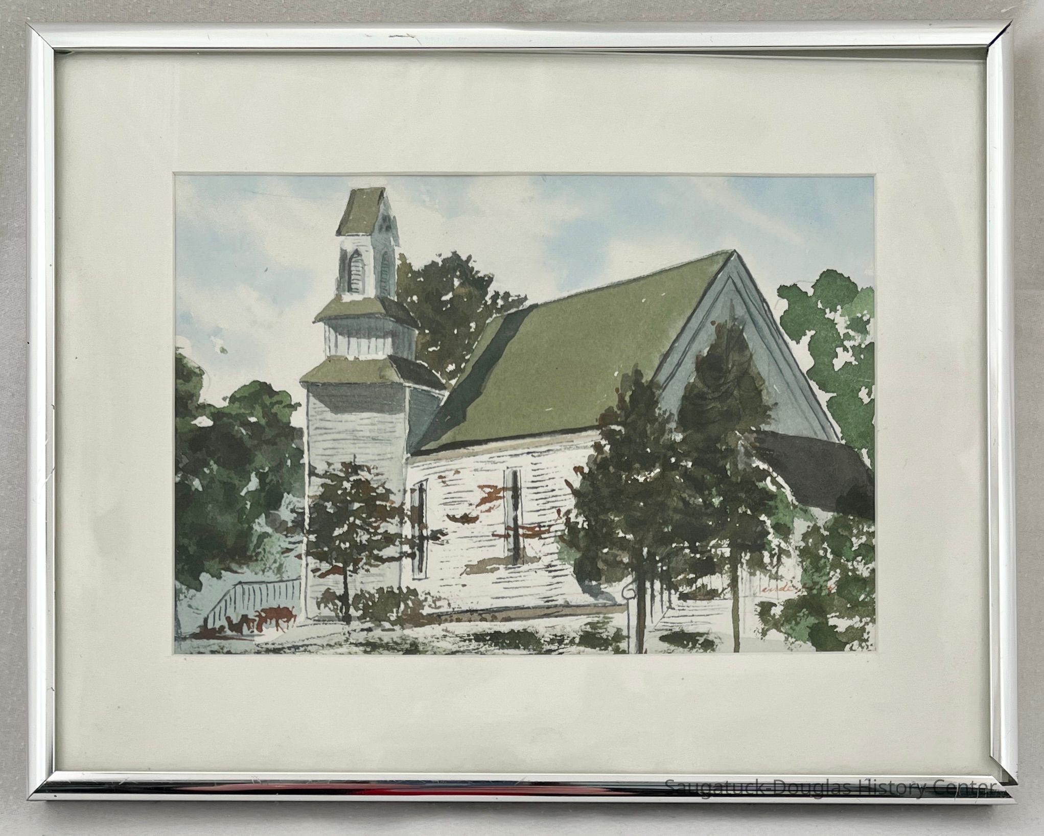 Watercolor painting of the Douglas United Church of Christ (DUCC) as seen from Spring Street. The white church has a green roof and a spire facing the corner of Wall St.