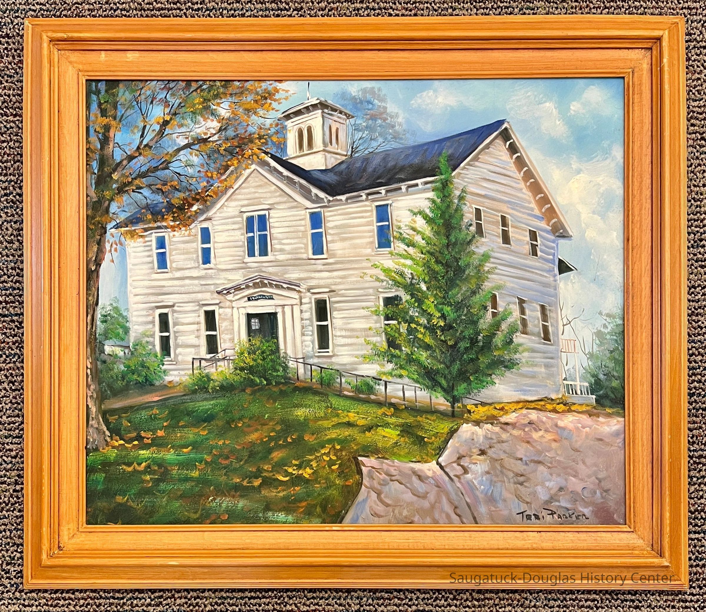 Landscape painting of Douglas Union School when it was the "Old School House" as seen from the end of the driveway. The canvas painting has a 3-inch wide yellow-orange wood frame. Donor indicated painting was from the 2000s.Type of Painting