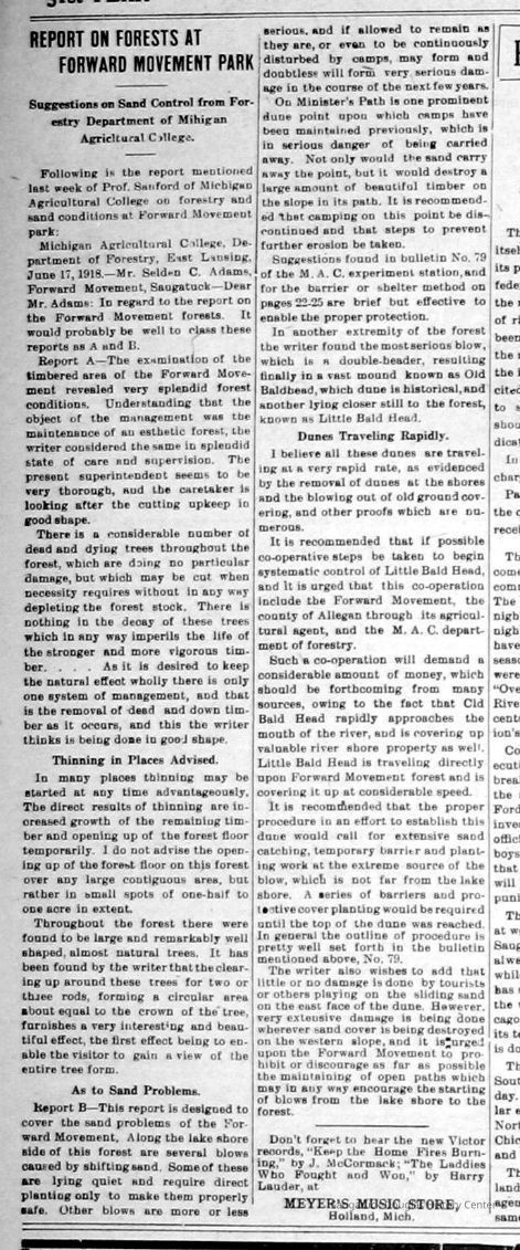 In 1898 a large portion of Lake Michigan shore, including most of what is now Saugatuck's Oval Beach, was purchased by the Forward Movement Association of Chicago. In 1918 Selden C. Adams, the manager of the Forward Movement Camp (later Camp Gray, now Presbyterian Camps) consulted with the Department of Forestry at Michigan Agricultural College (later Michigan State University) about management of the camp's property to limit erosion and maintain what was left of the natural forest. This was the reply, written by a Professor Sanford was printed in the June 27, 1918, Commercial Record.