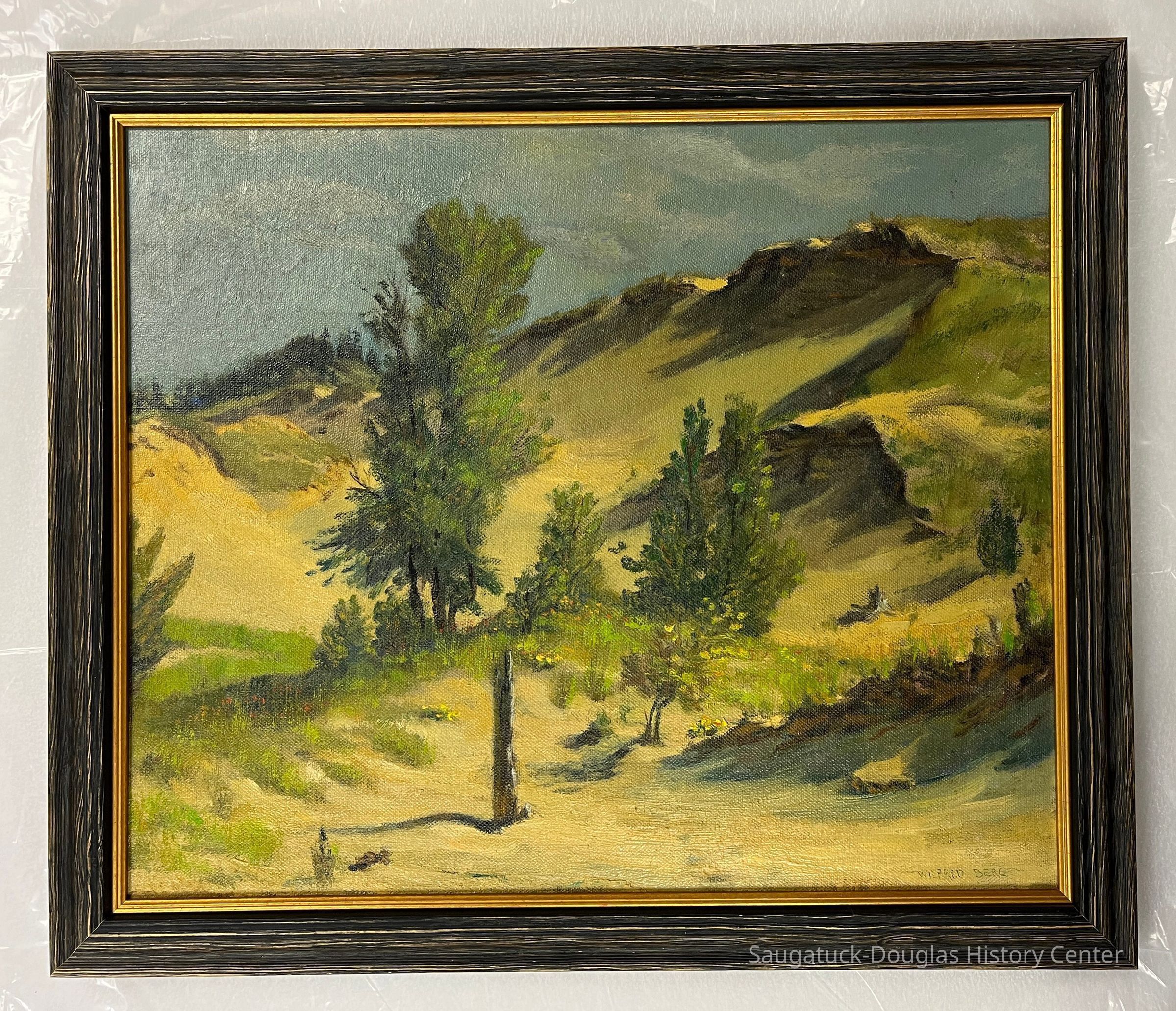Oil Painting on canvas board "Dunes" by Wilfred Berg 18' x 16" in rustic wood frame with small gold inner border.Collection