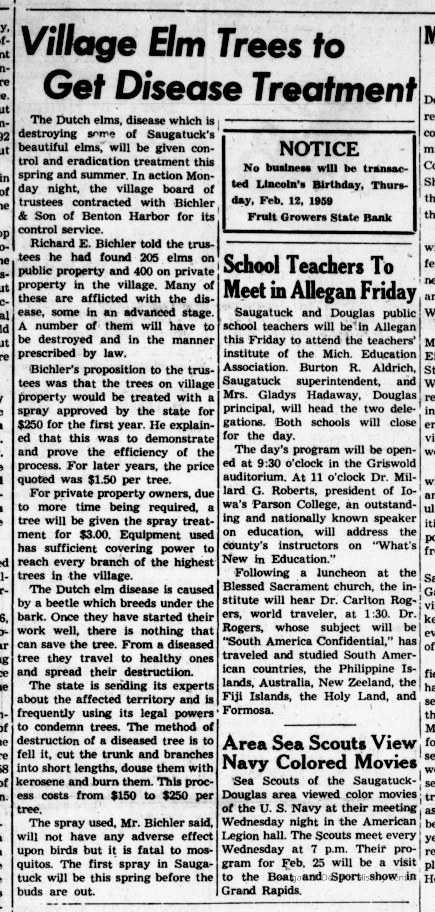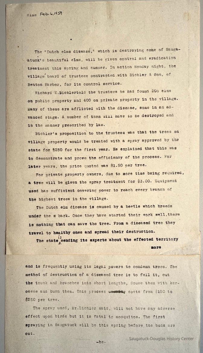Like many communities across the nation, the town's elm trees were eventually devastated by this pathogen. The story ran as written on 6 Feb 1959.Collection