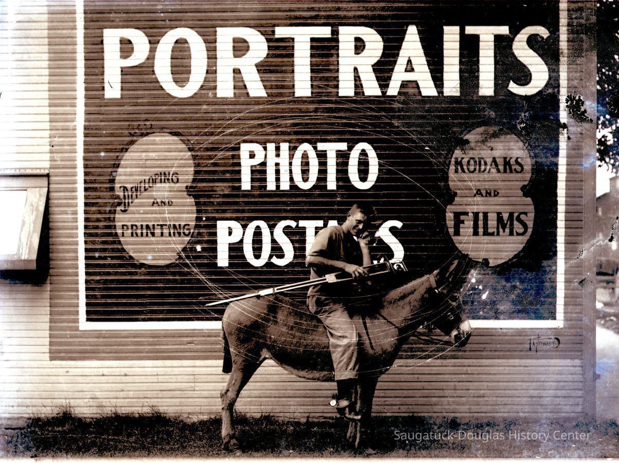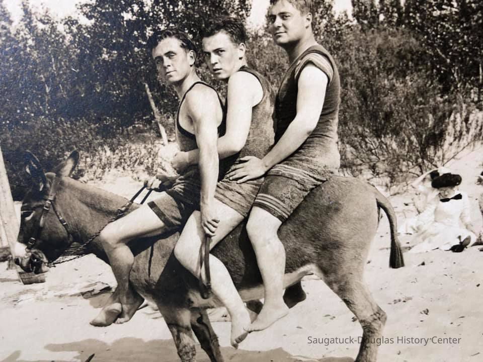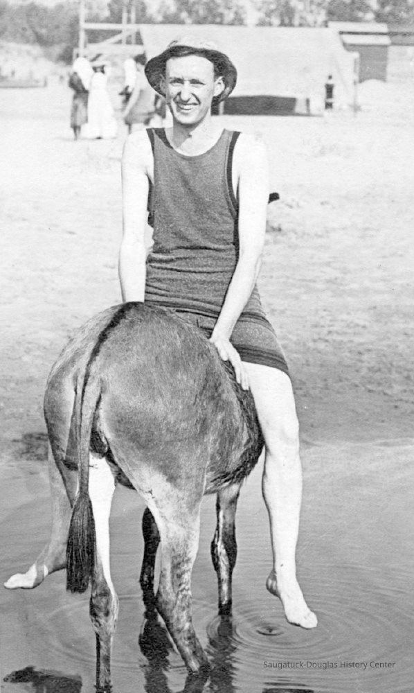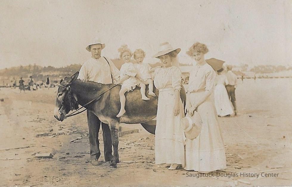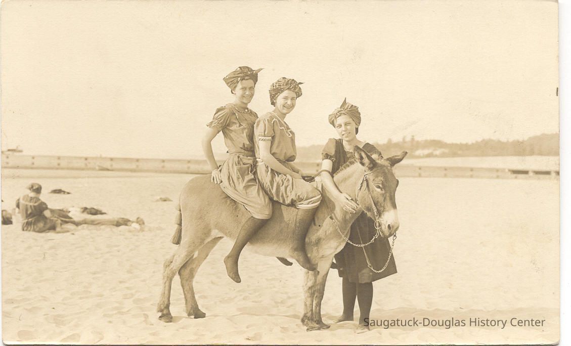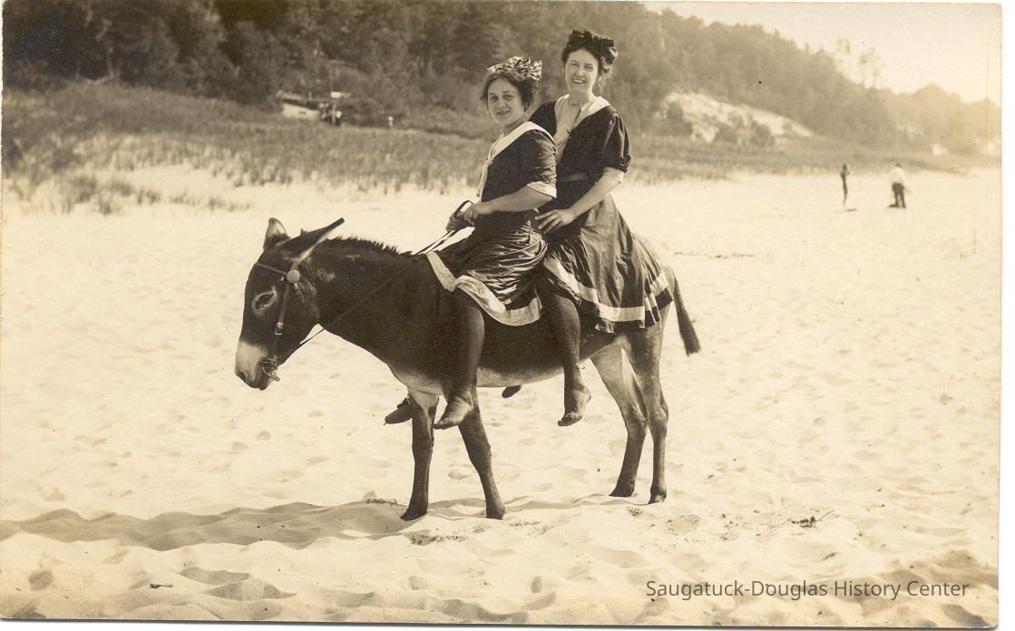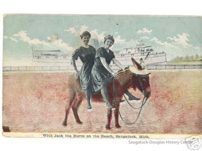 Area visitors posed with Saugatuck's favorite photo prop: Dynamite the Donkey. The photos were taken at the beach, likely the beach just north of Oval Beach, on Water Street and on or near the Chain Ferry and landing.