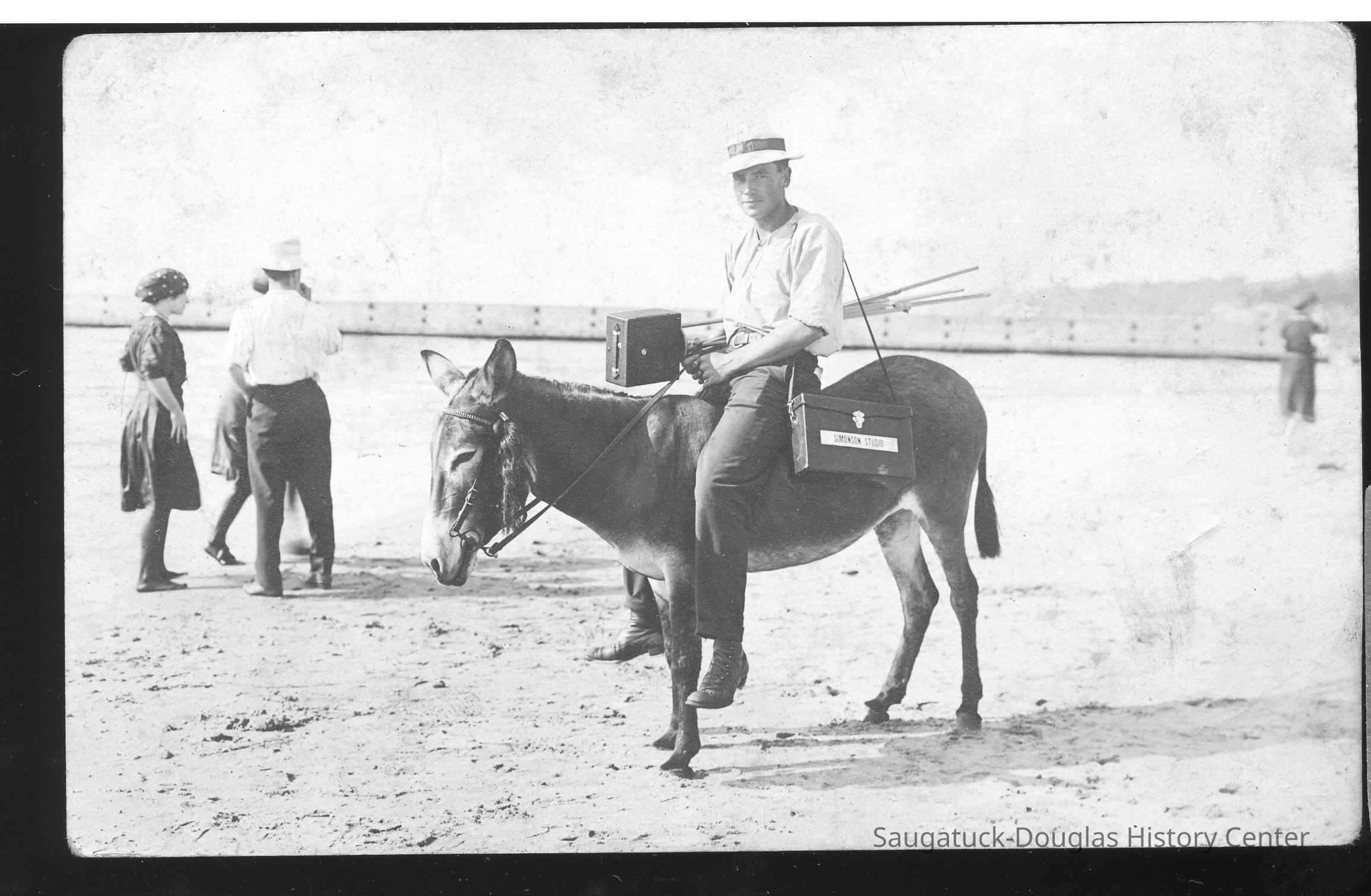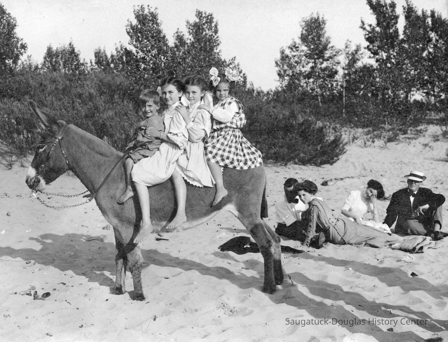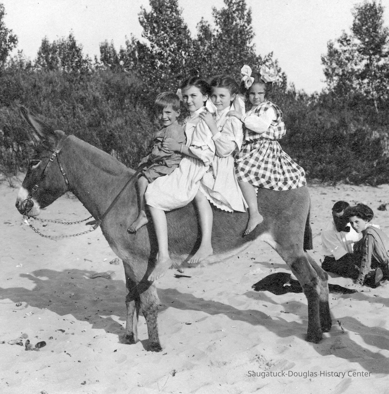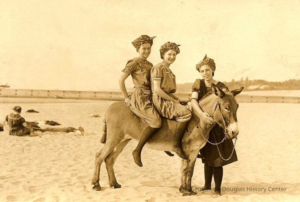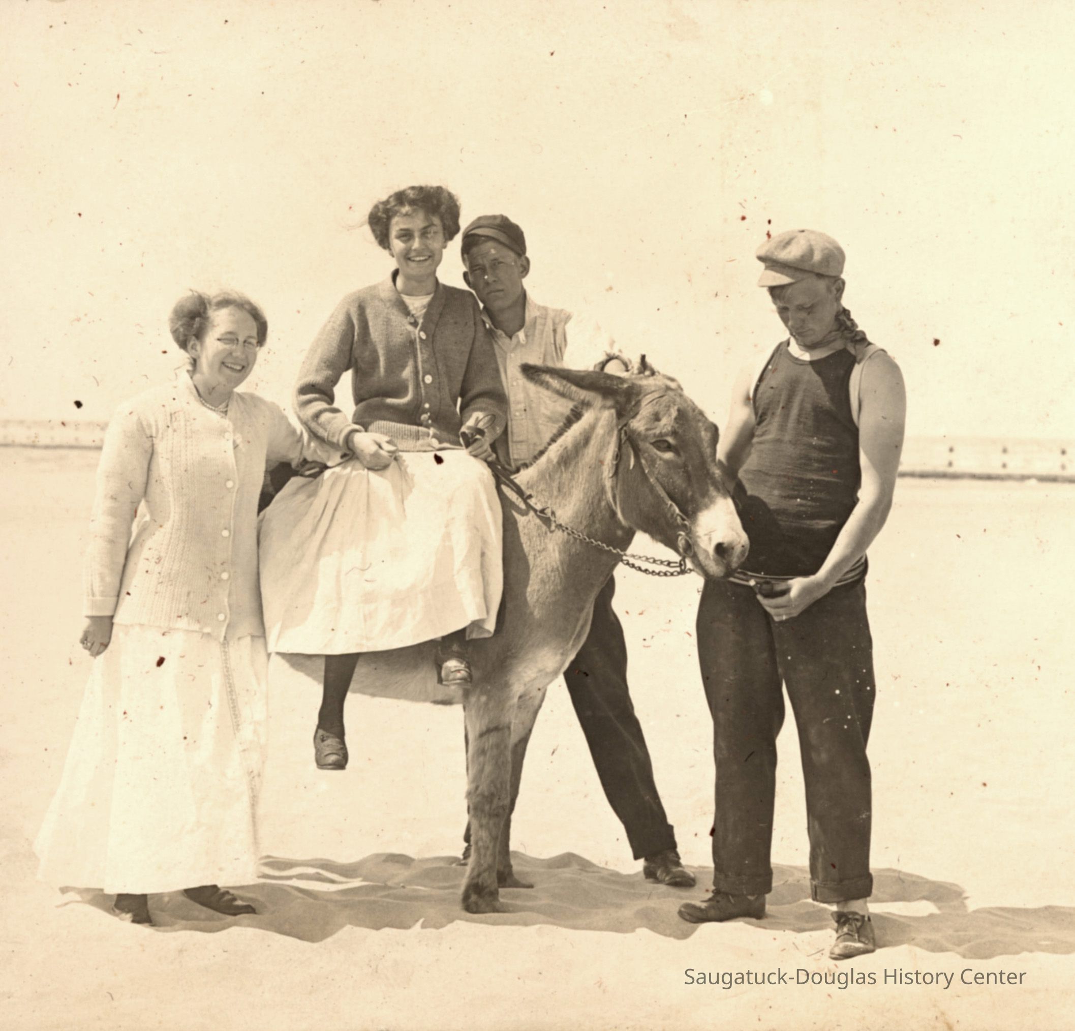 Area visitors posed with Saugatuck's favorite photo prop: Dynamite the Donkey. The photos were taken at the beach, likely the beach just north of Oval Beach, on Water Street and on or near the Chain Ferry and landing.