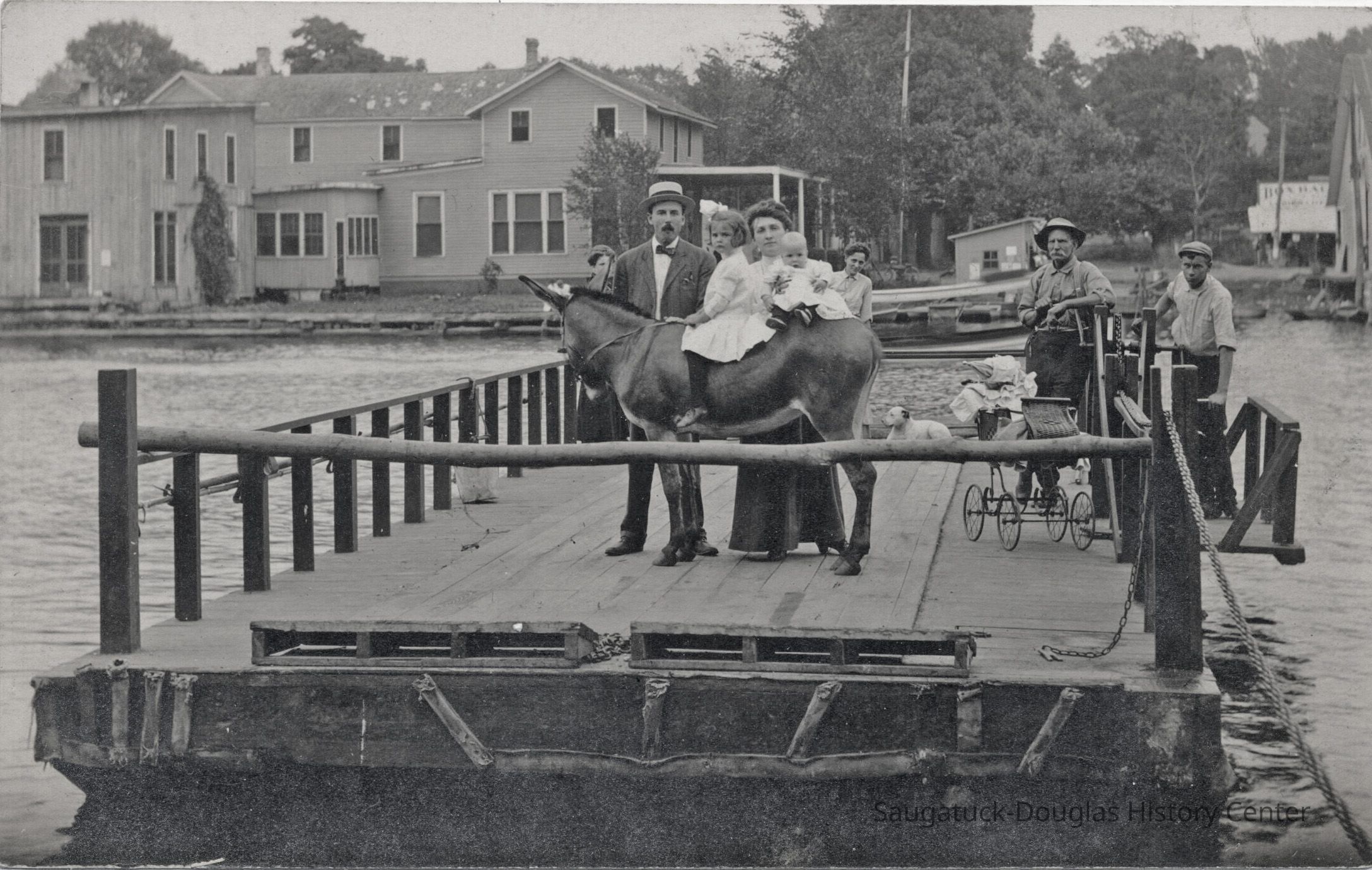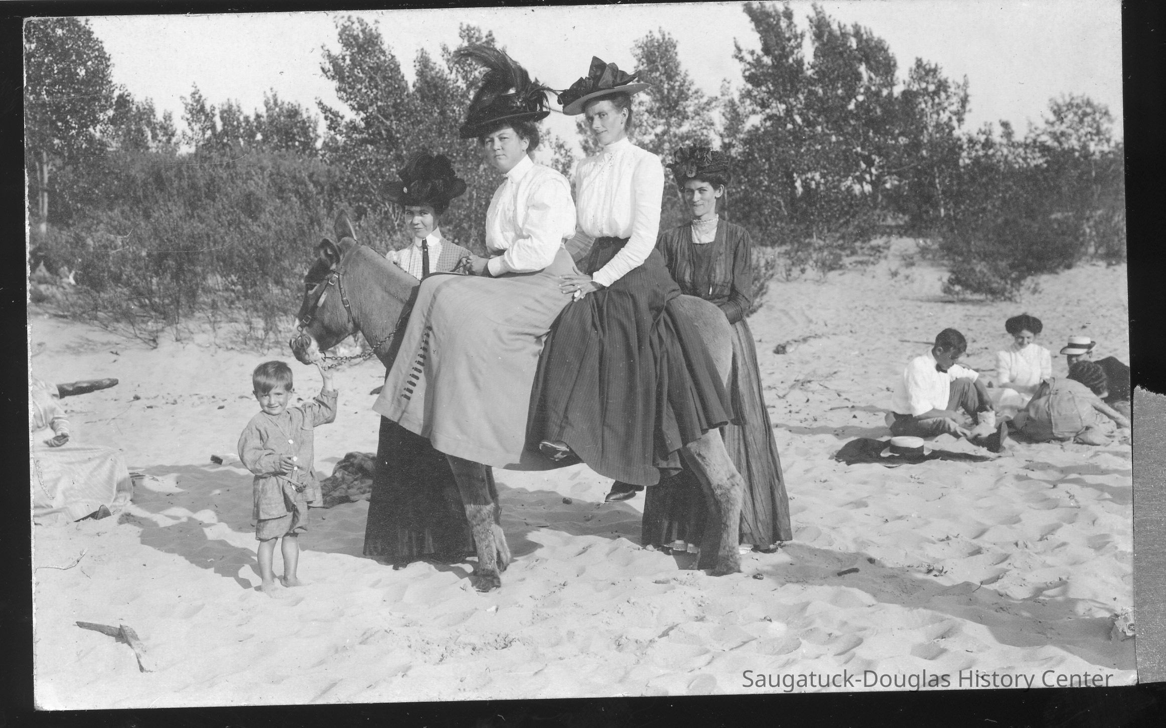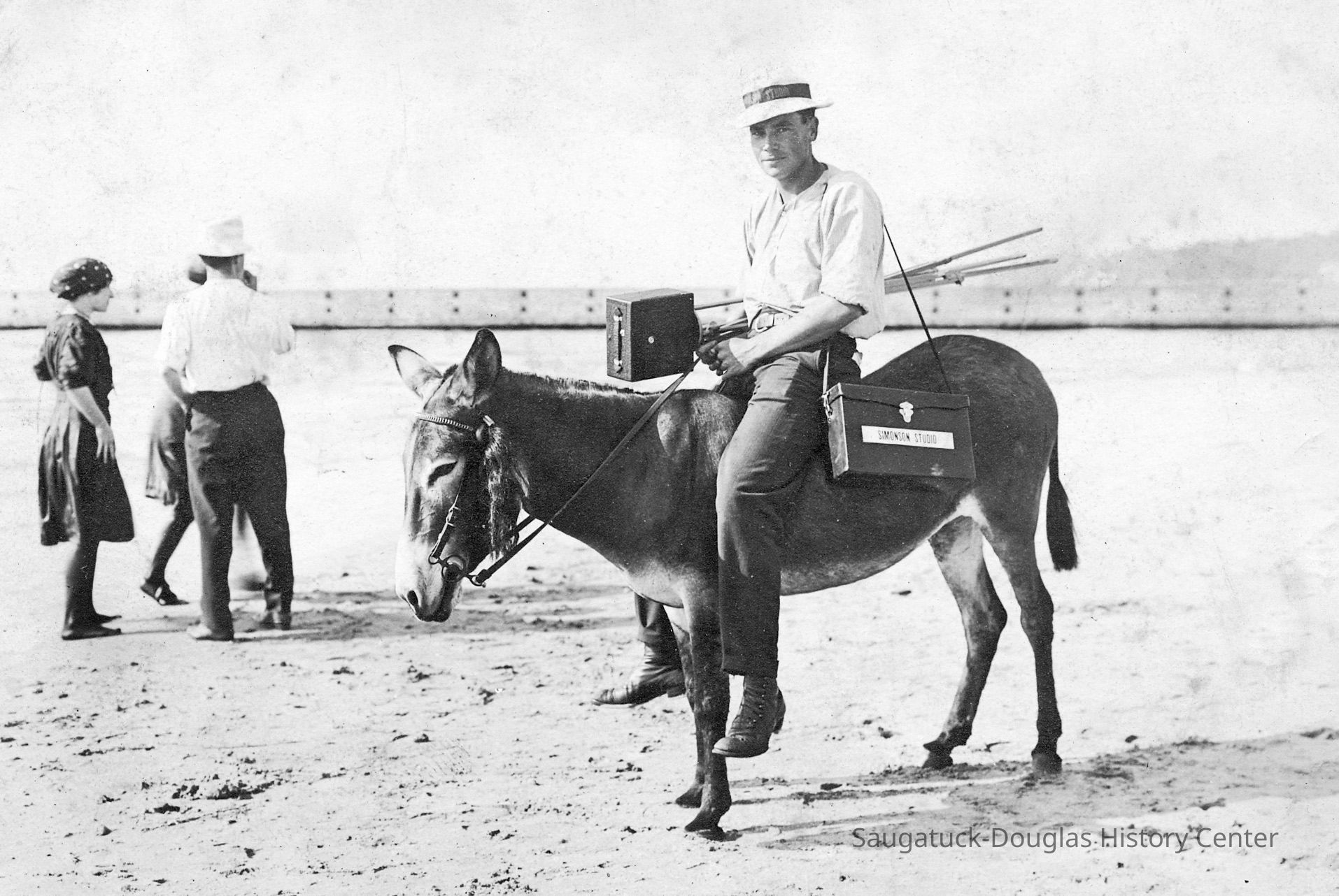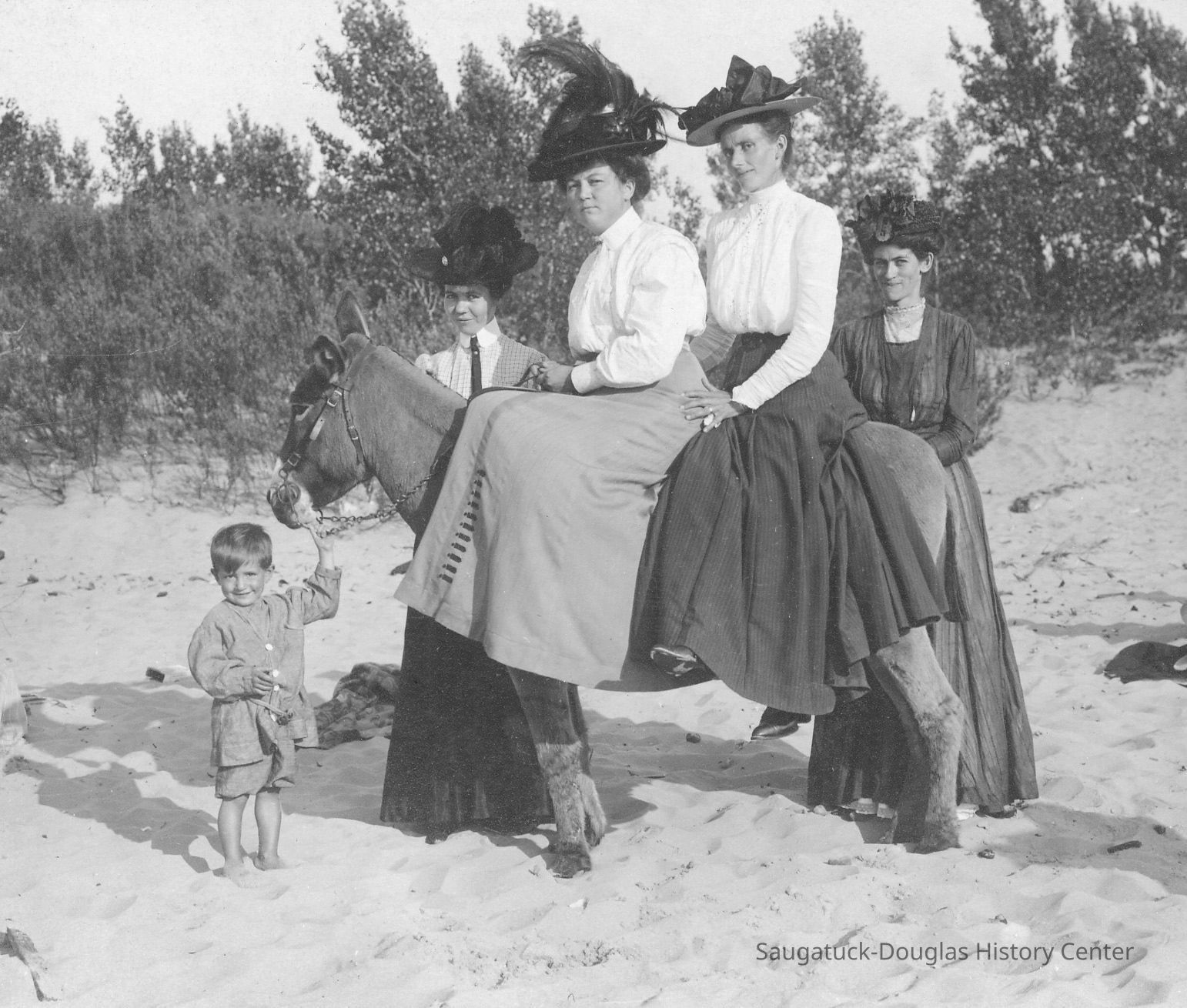 Area visitors posed with Saugatuck's favorite photo prop: Dynamite the Donkey. The photos were taken at the beach, likely the beach just north of Oval Beach, on Water Street and on or near the Chain Ferry and landing.