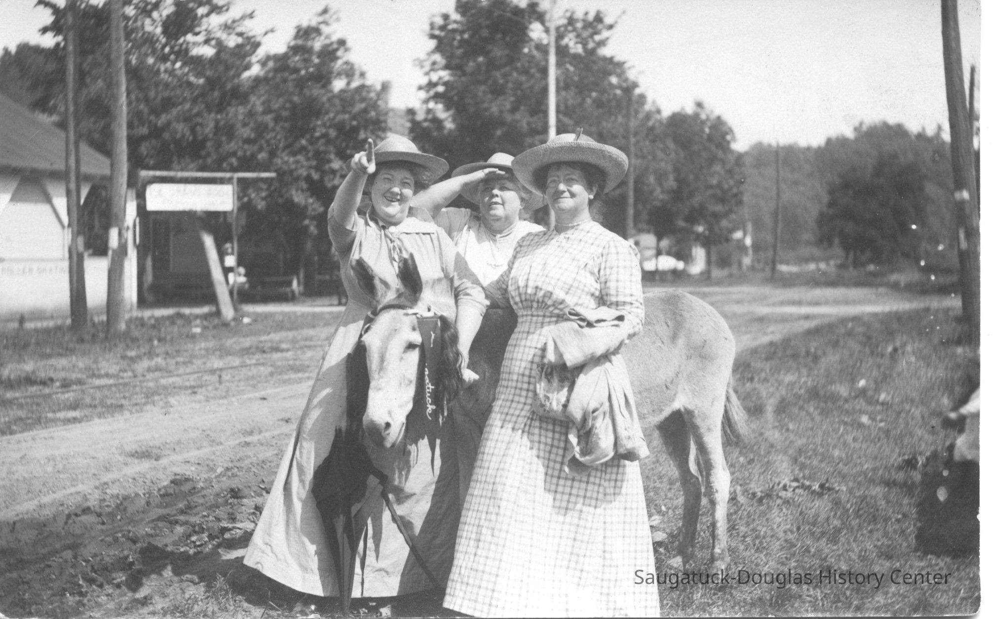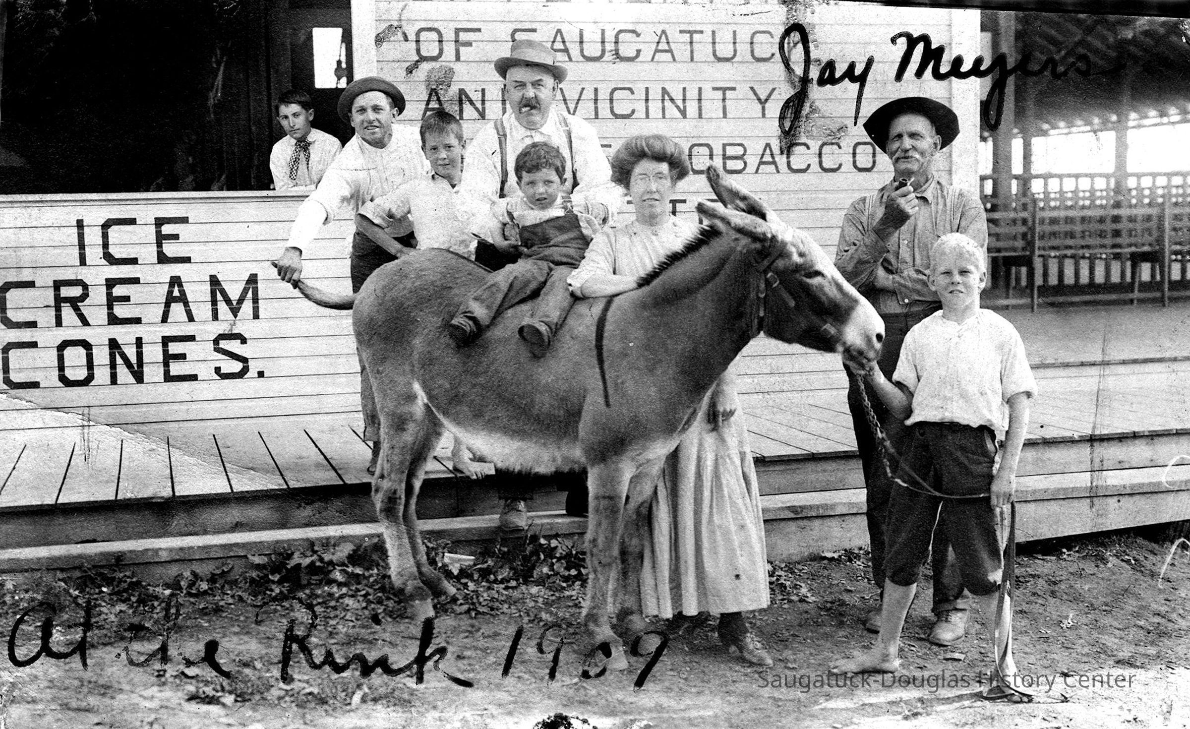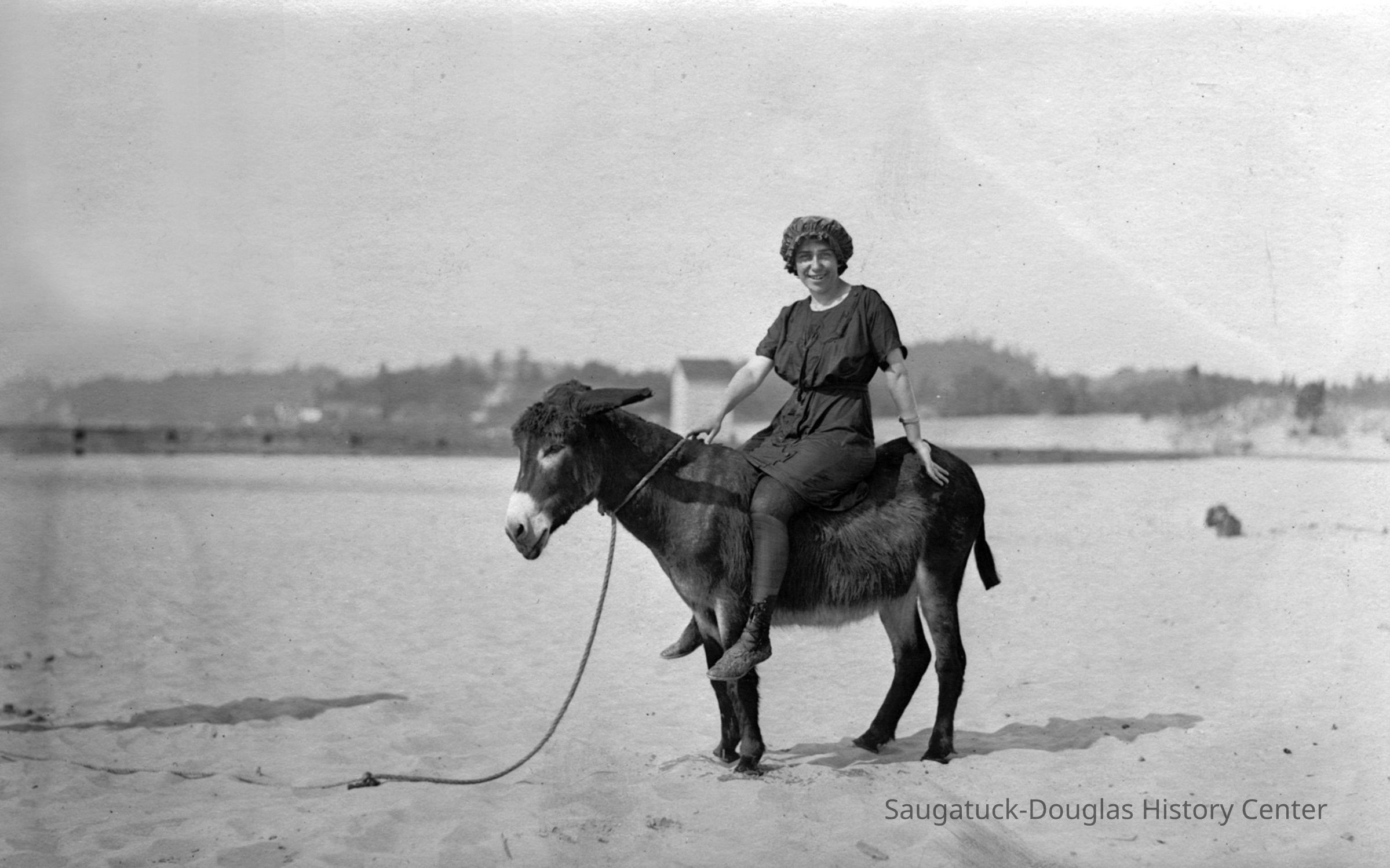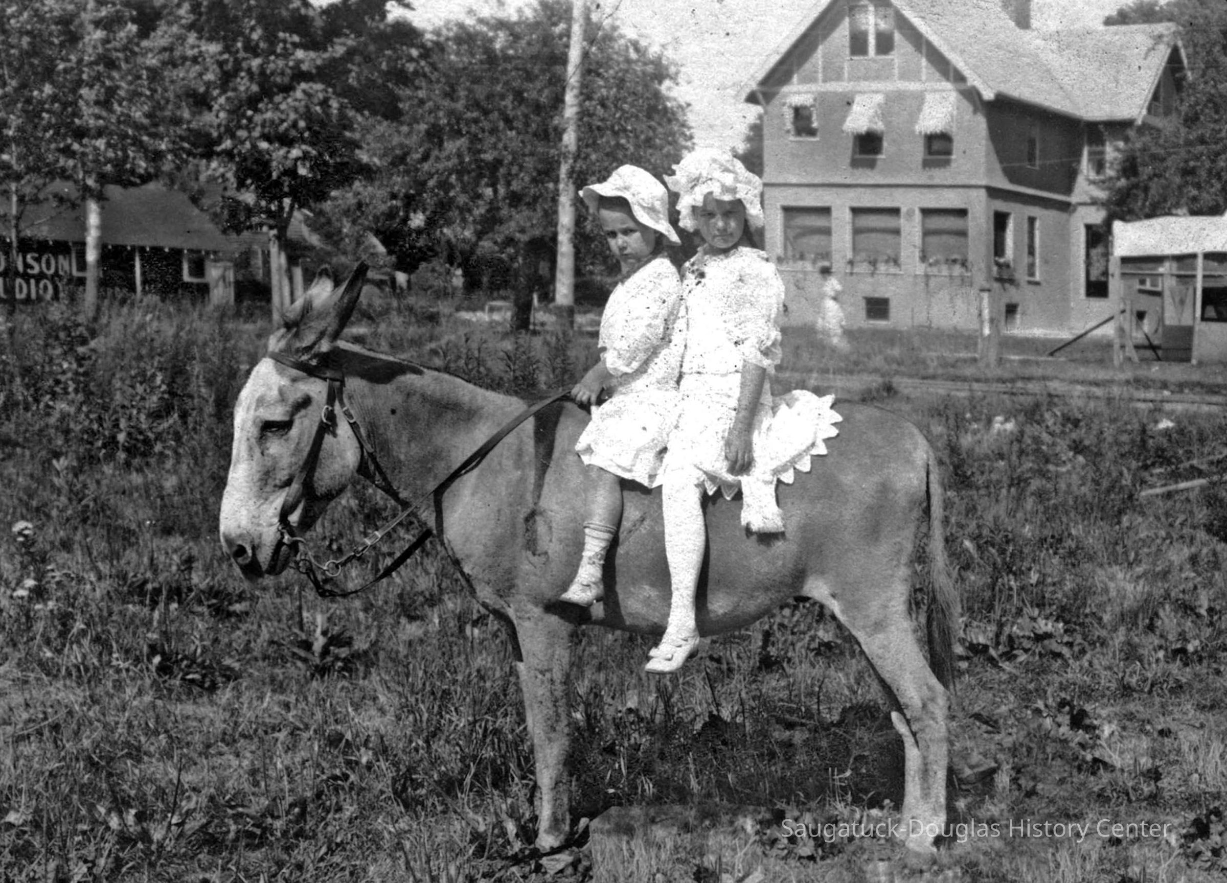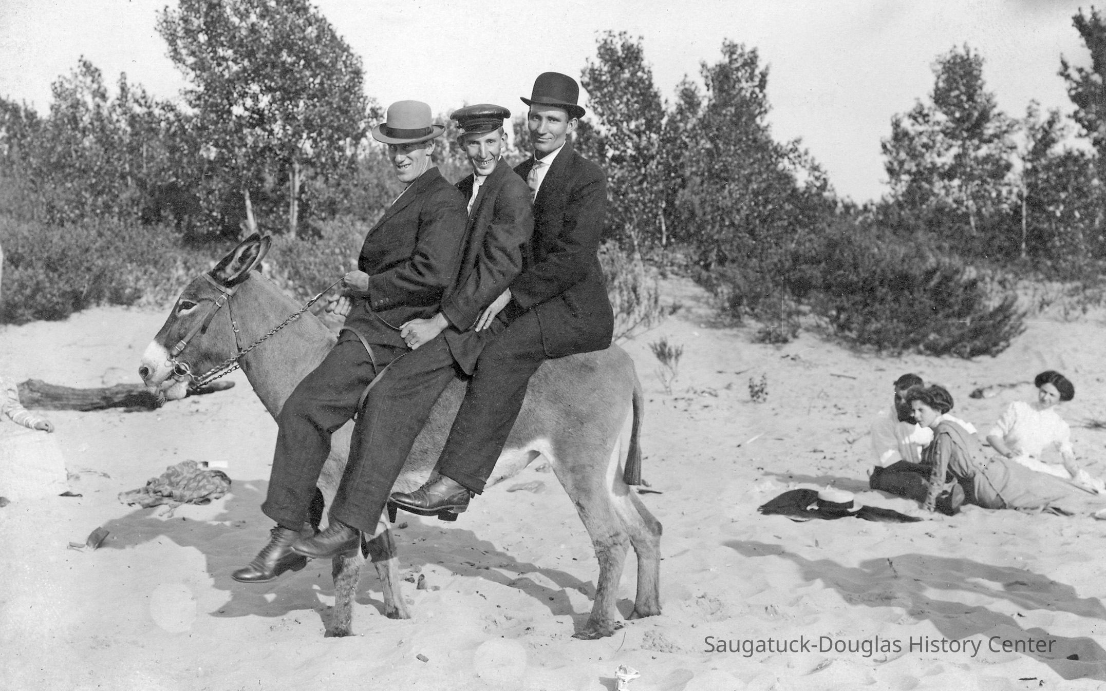 Area visitors posed with Saugatuck's favorite photo prop: Dynamite the Donkey. The photos were taken at the beach, likely the beach just north of Oval Beach, on Water Street and on or near the Chain Ferry and landing.