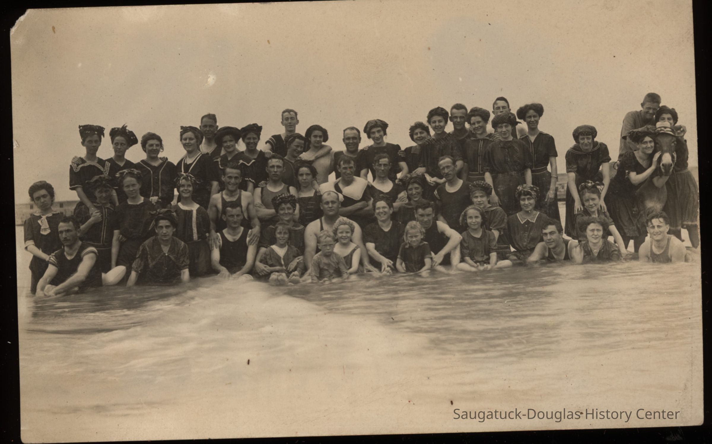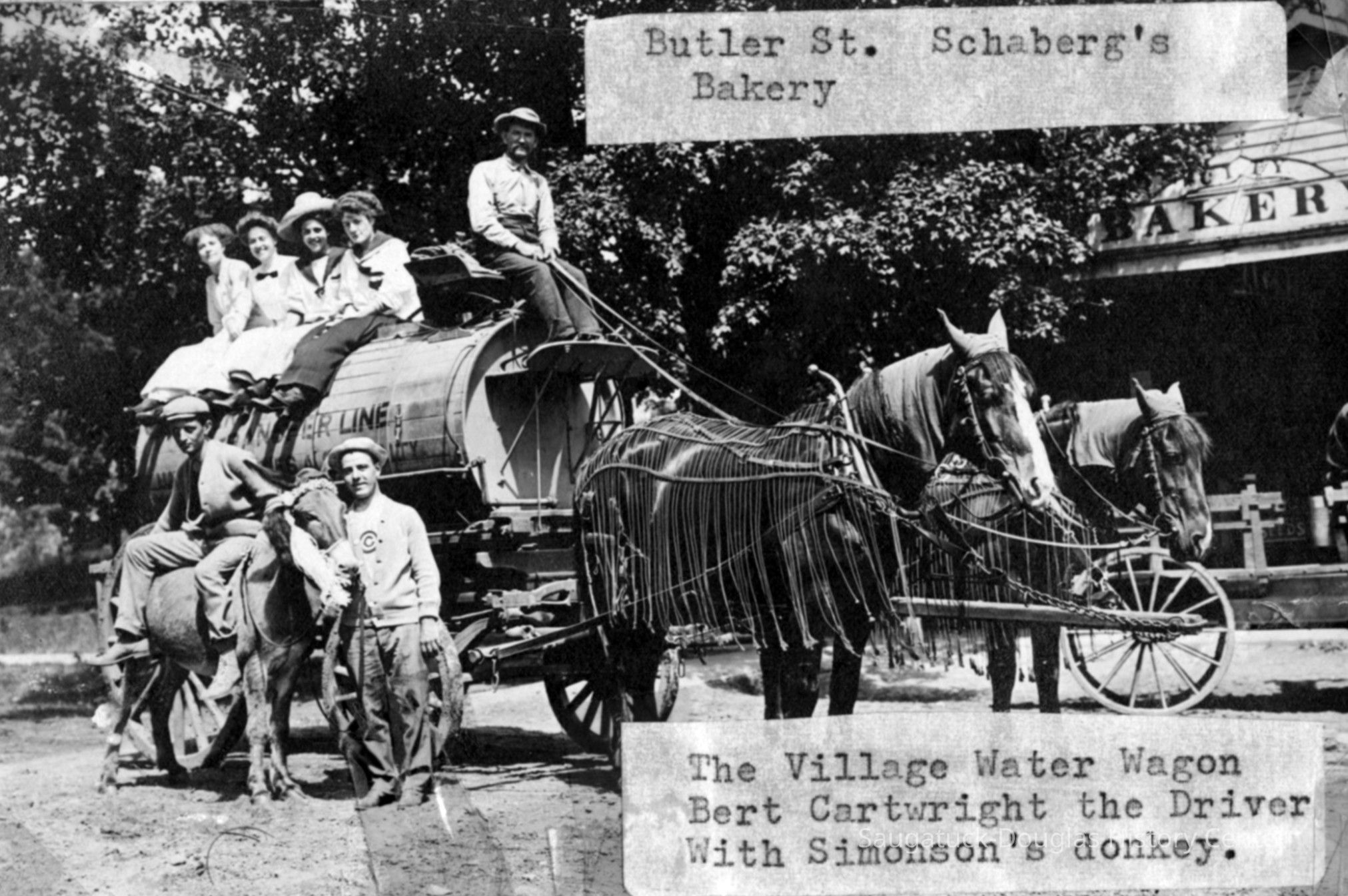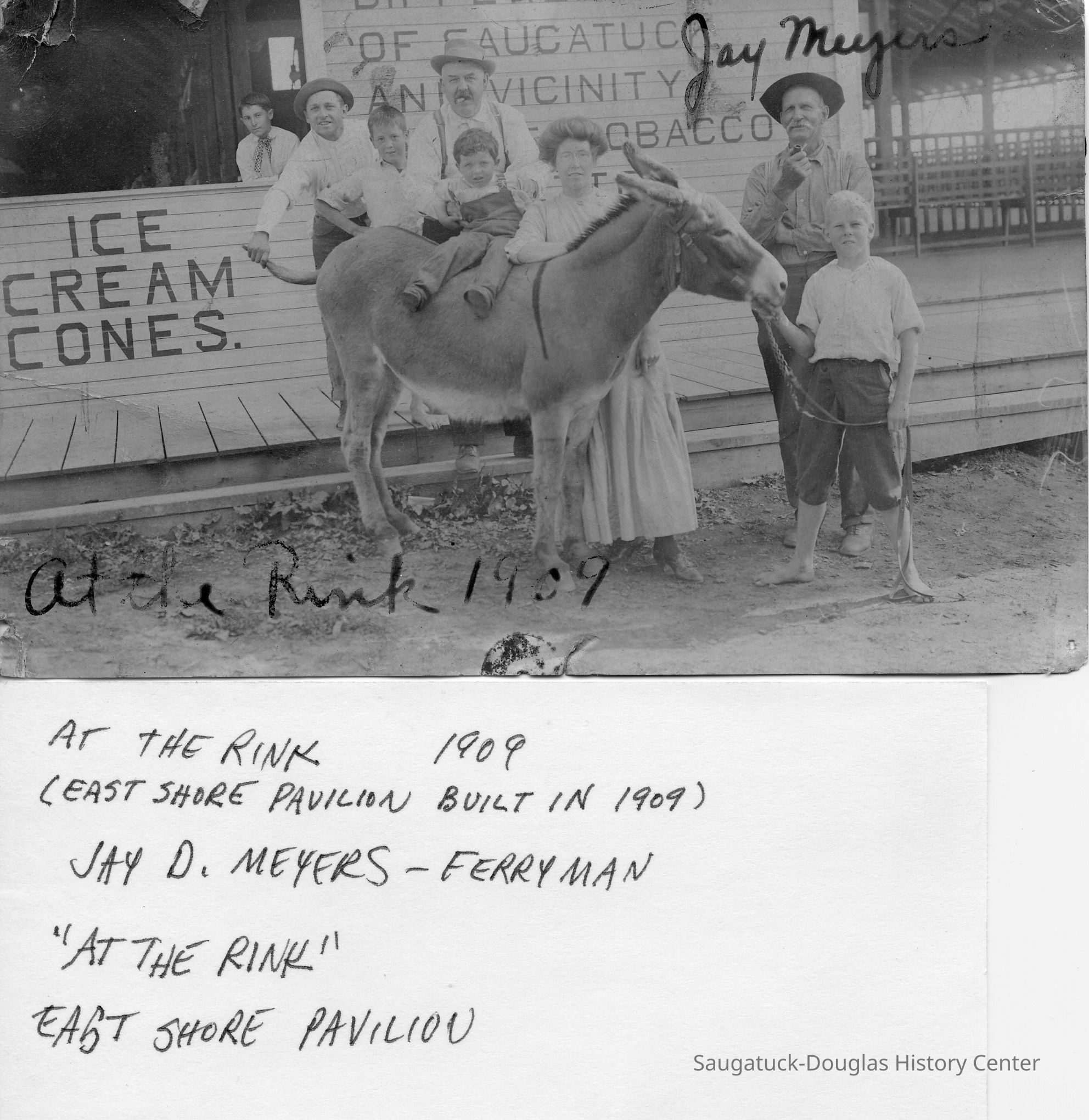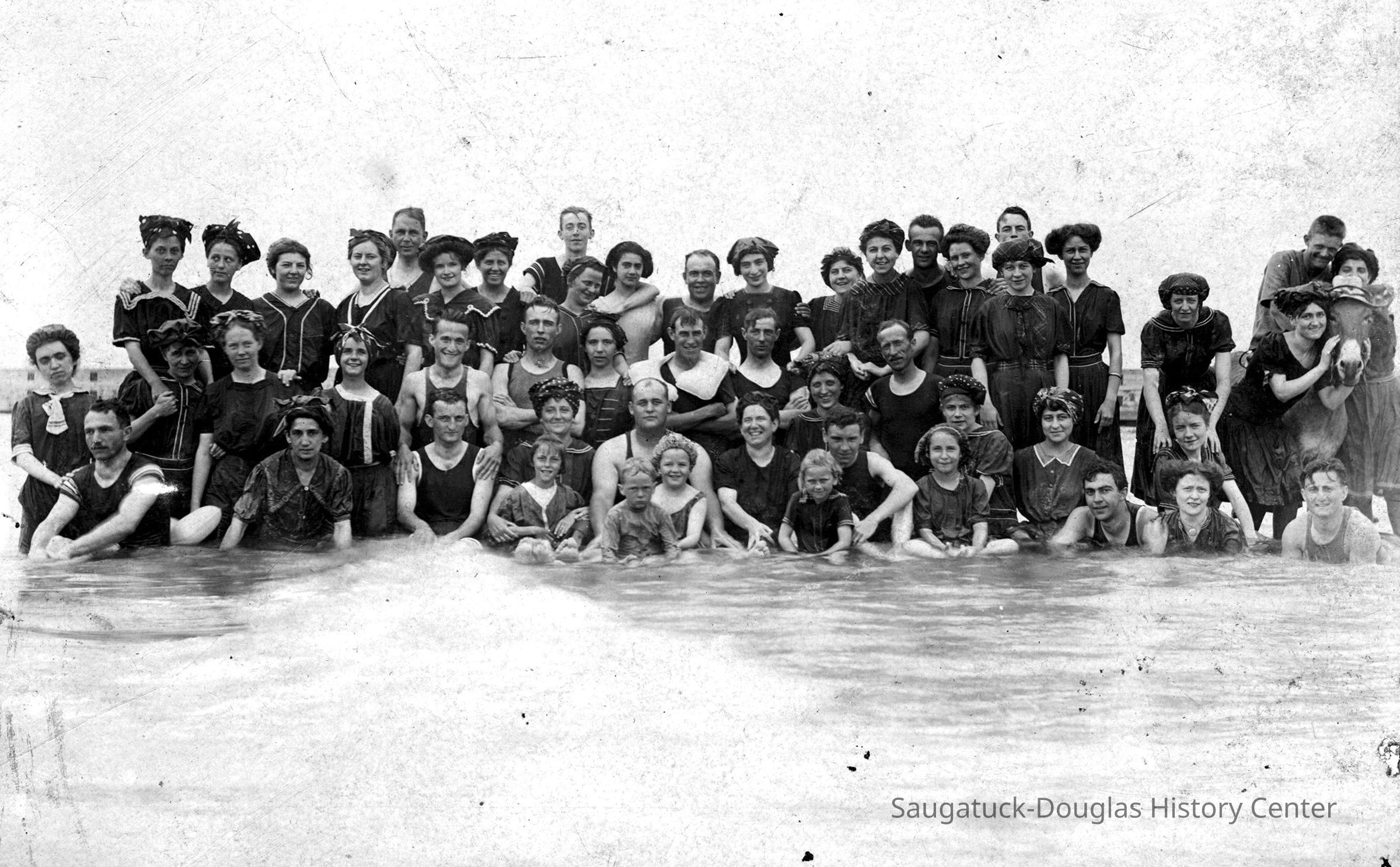 Area visitors posed with Saugatuck's favorite photo prop: Dynamite the Donkey. The photos were taken at the beach, likely the beach just north of Oval Beach, on Water Street and on or near the Chain Ferry and landing.