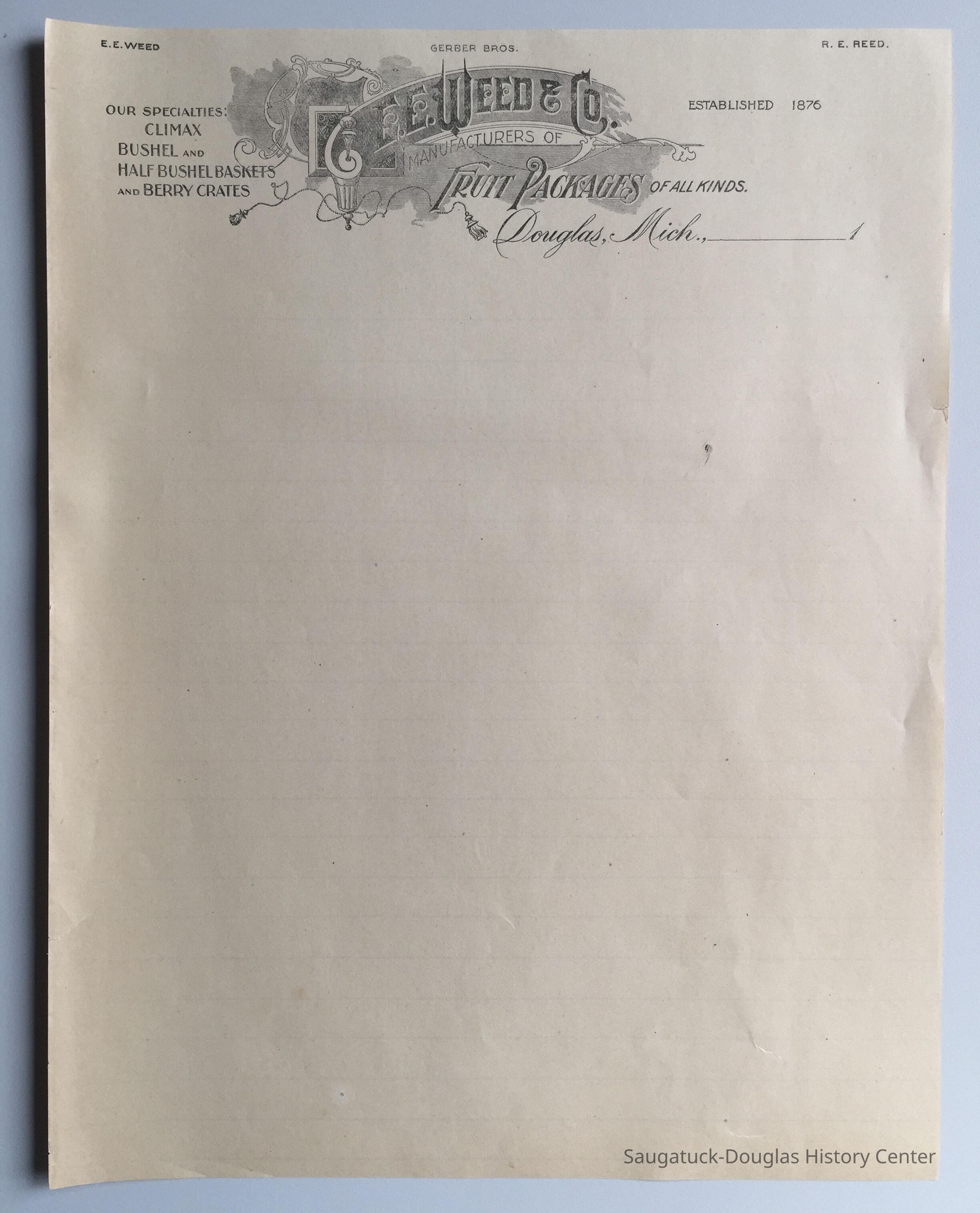 Florid blank letterhead from E.E. Weed and Company, manufacturers of Fruit Packages of all Kinds, Douglas Mich. Established 1876