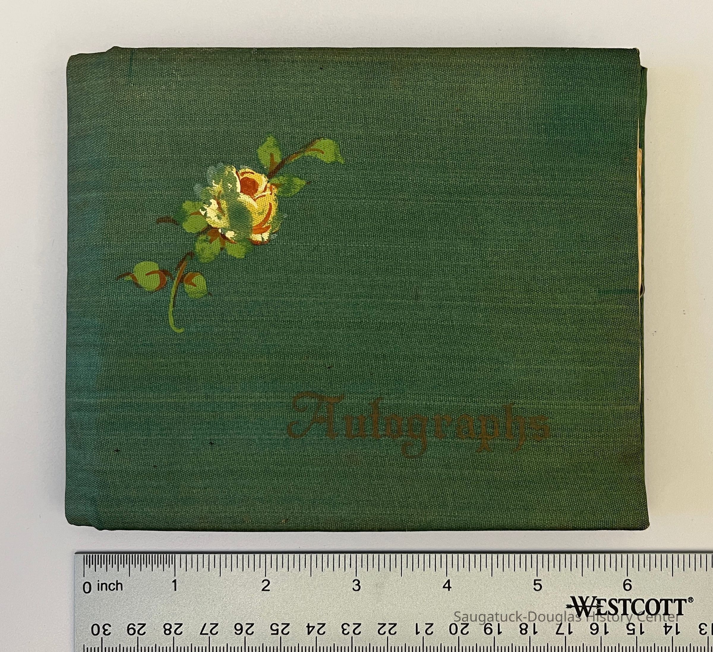 Small blank book with padded, green fabric cover adorned with a printed rose and the word "Autographs"Context