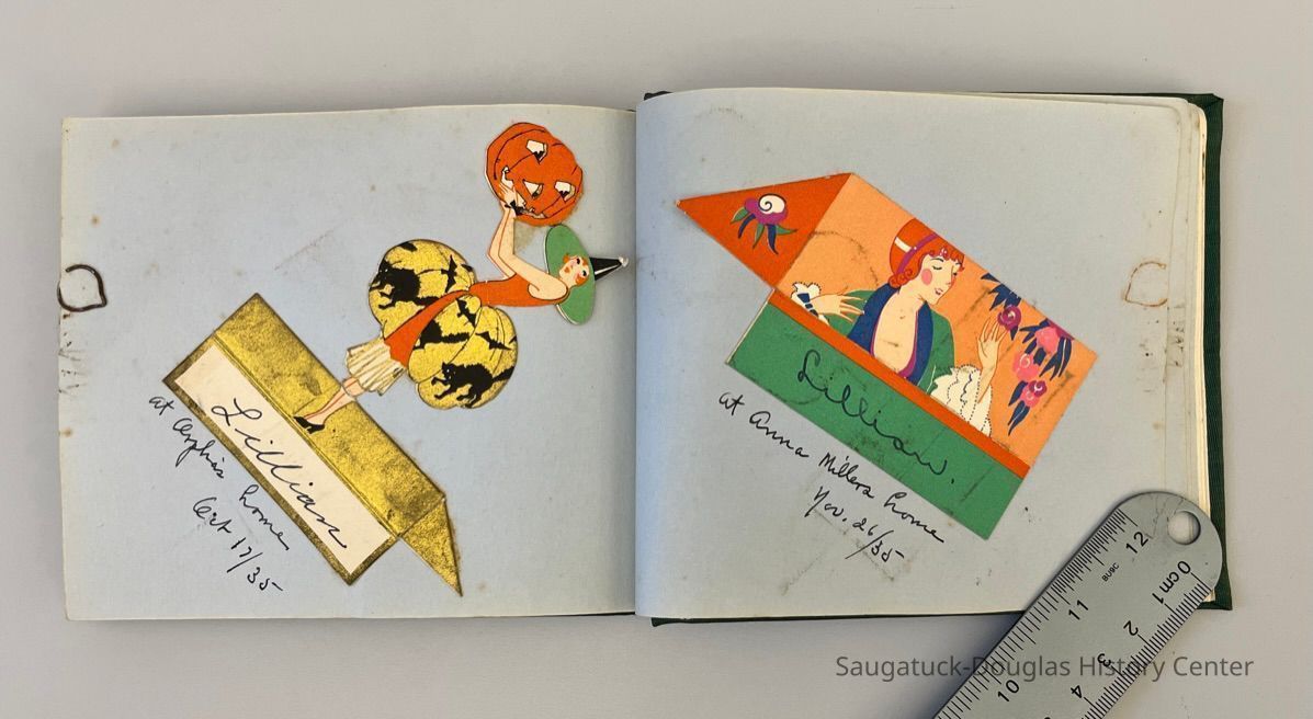 The book belonged to Lillian Morris. She used it to collect well wishes from her friends, gift tags, newspaper clippings and photos. The book was a gift from Margaret Taylor in 1934.