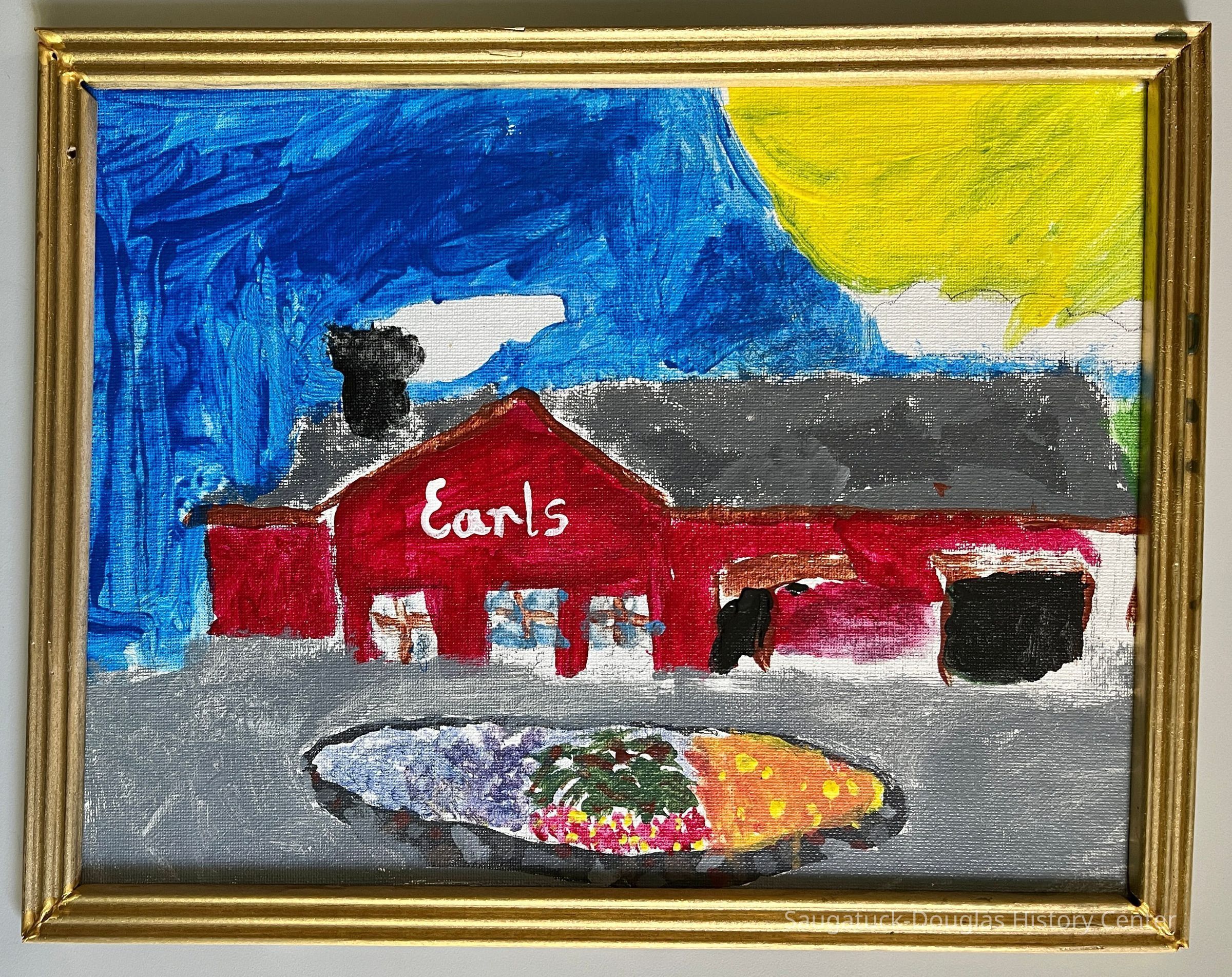 Acrylic painting on board of Earl's Berry Farm's circular garden and main building. Painting is unframed with gold wood trim glued to surface to simulate a frame.Type of Painting