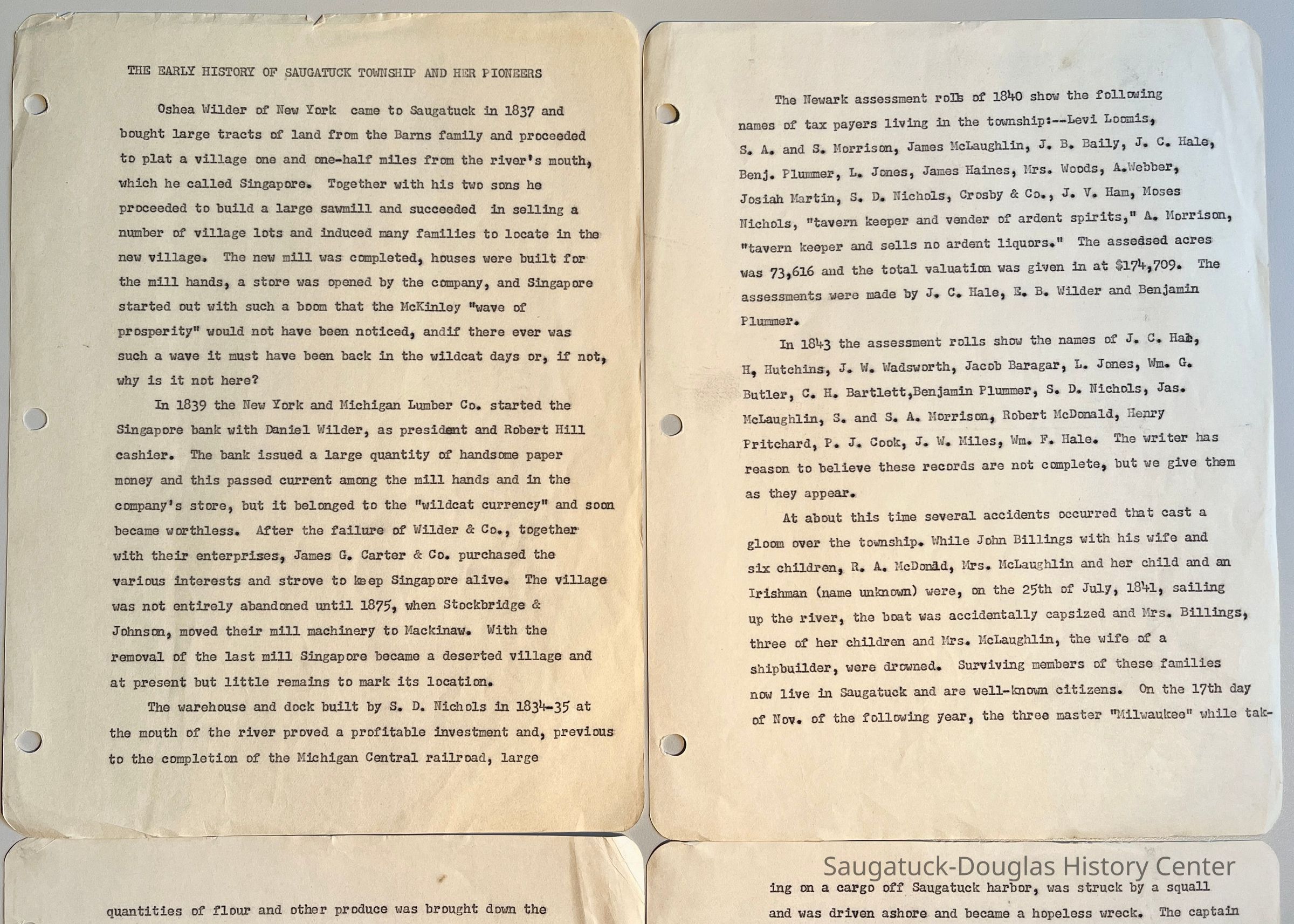 Oshea Wilder of New York came to Saugatuck in 1837 and bought large tracts of land fron the Barns family and proceeded to plat a village one and one half miles from the river's mouth, which he called Singapore. Together with his two sons he proceeded to build a large sawmill and succeeded in selling a number of village lots and induced many families to locate in the new village. The new mill was completed, houses were built for the mill hands, a store was opened by the company, and Singapore started out with such a boom that the McKinley "wave of prosperity" would not have been noticed, andif there ever was such a wave it must have been back in the wildcat days or, if not, why is it not here?
