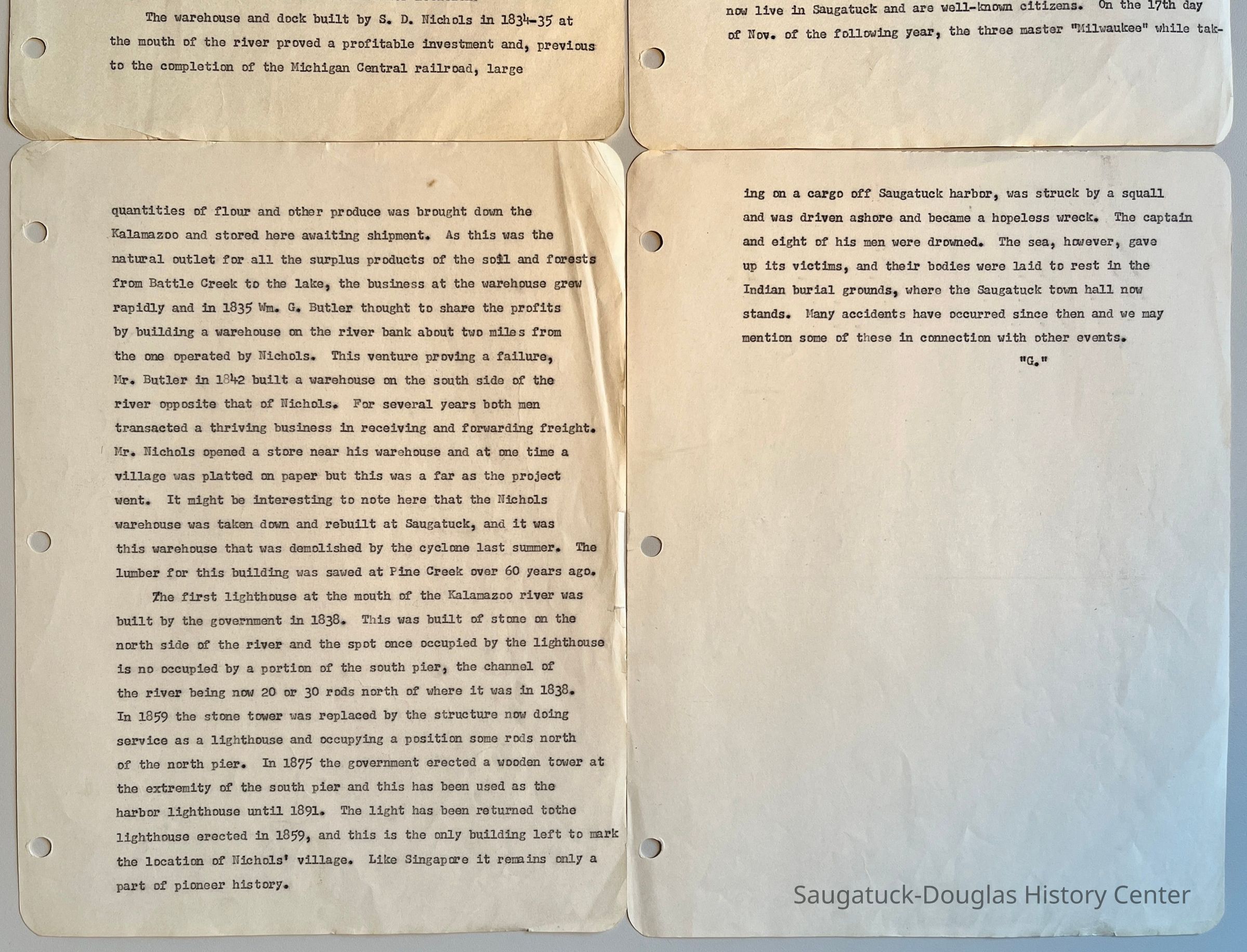 "It's a very interesting read. It may imply the the Village of the Harbor of Kalamazoo extended to the south and east side of the mouth of the river as well. We can even figure a date to the document by what summer a cyclone hit Saugatuck and destroyed Nichols’ relocated warehouse. As to who was “G” it’s like that early account in the commercial about someone's recollections of the past as they revisited the area. That was a very informative read about the Carter & Stockbridge Mill at Singapore, and just worked its narrative upriver from there. It, too, was just signed by someone’s initials." -- James T. Faasen, 27 March 2025