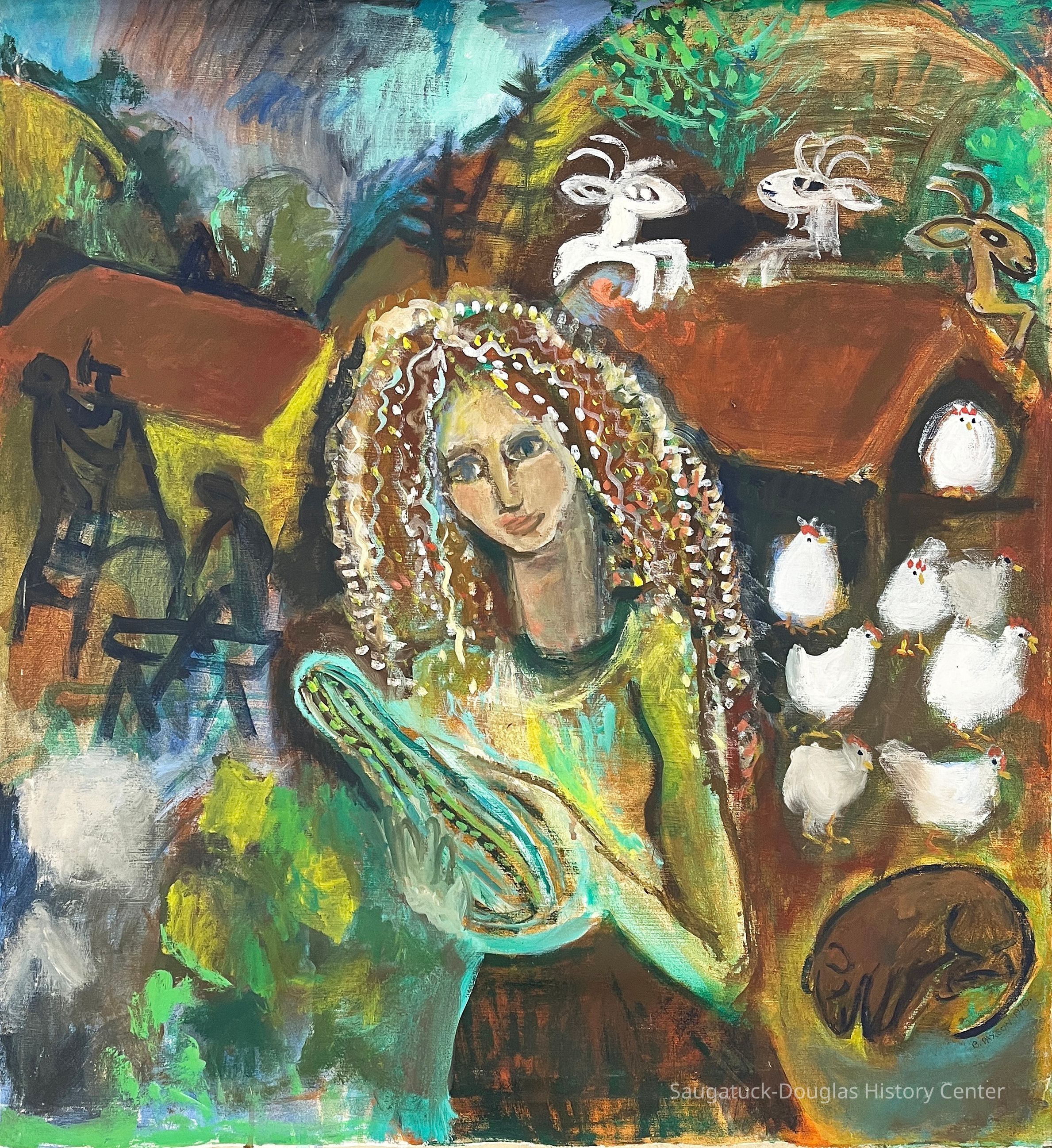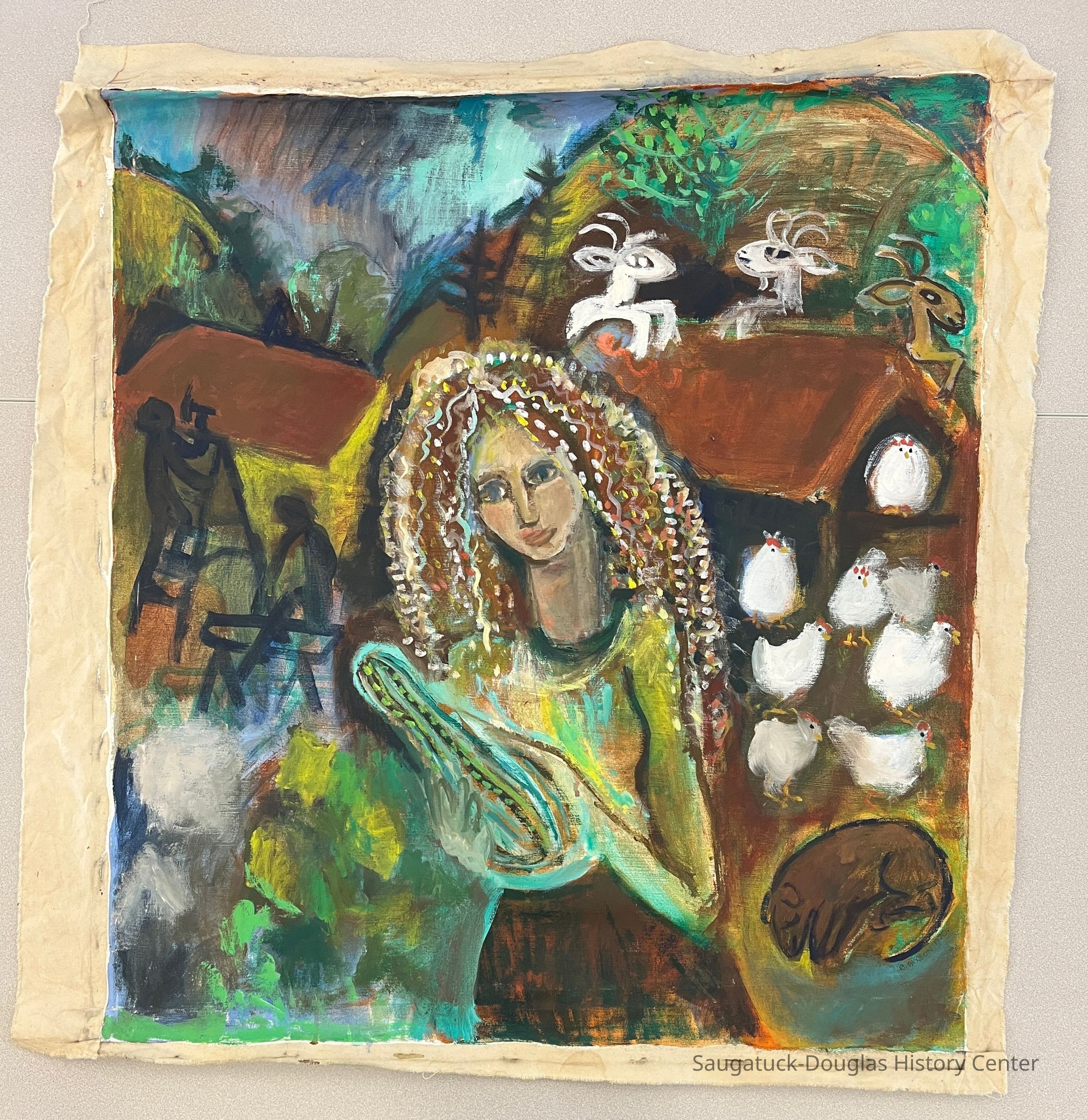 Unstretched acrylic painting on canvas depicting a woman with brown, wavy hair holding a gourd. The woman is surrounded by two silhouettes of people building a house, goats climbing on a roof of a coop, white chickens in a yard and a sleeping dog.Type of Painting