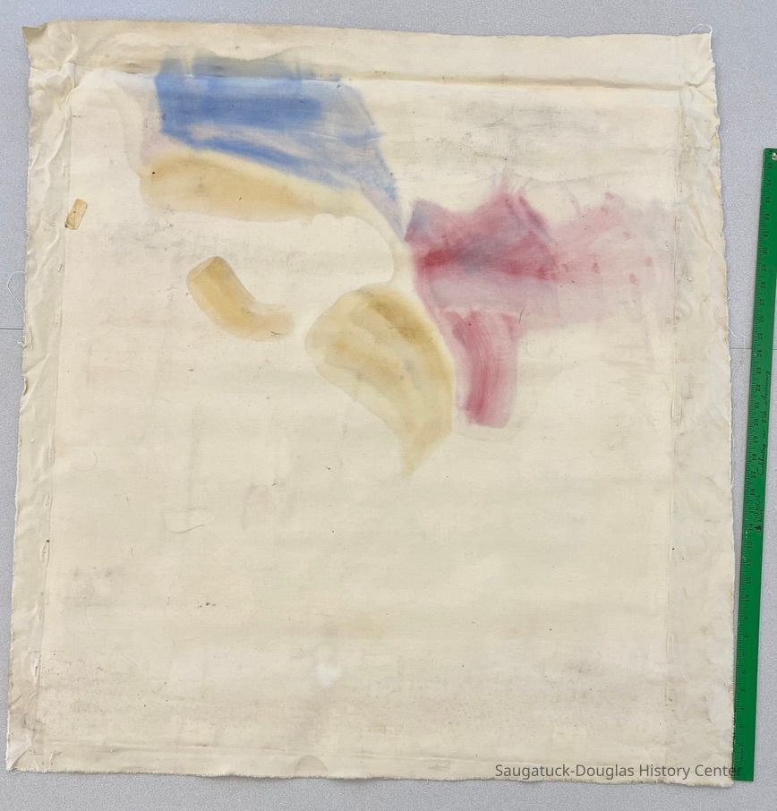 The painting was rolled and off square when received. No signs of cracking or paint detaching from the canvas. The un-primed canvas margins are uneven and the bottom edge is challenging narrow for stretching.General Notes