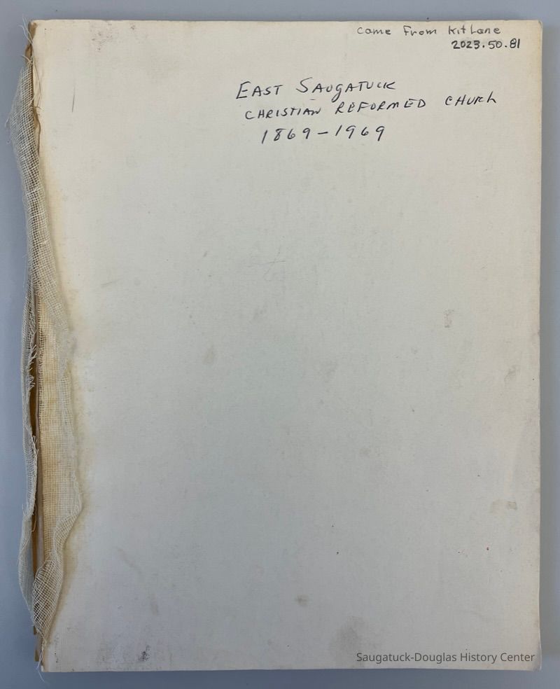A hard cover book published by members of the East Saugatuck Christian Reformed Church 1869-1969 was contributed to the Saugatuck-Douglas District Library book sale and given by the Friends of the Library to the Society for placement in the research library.